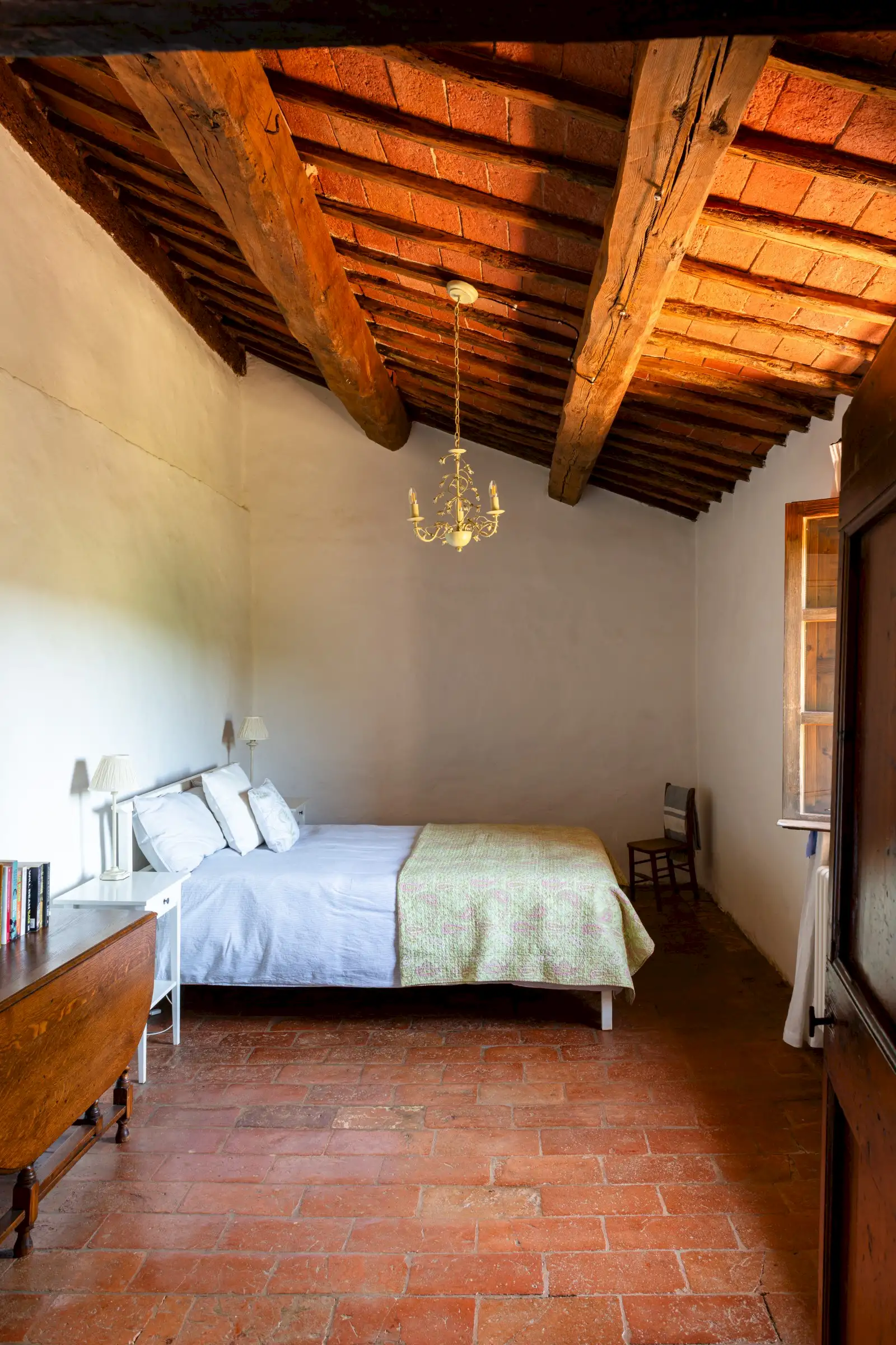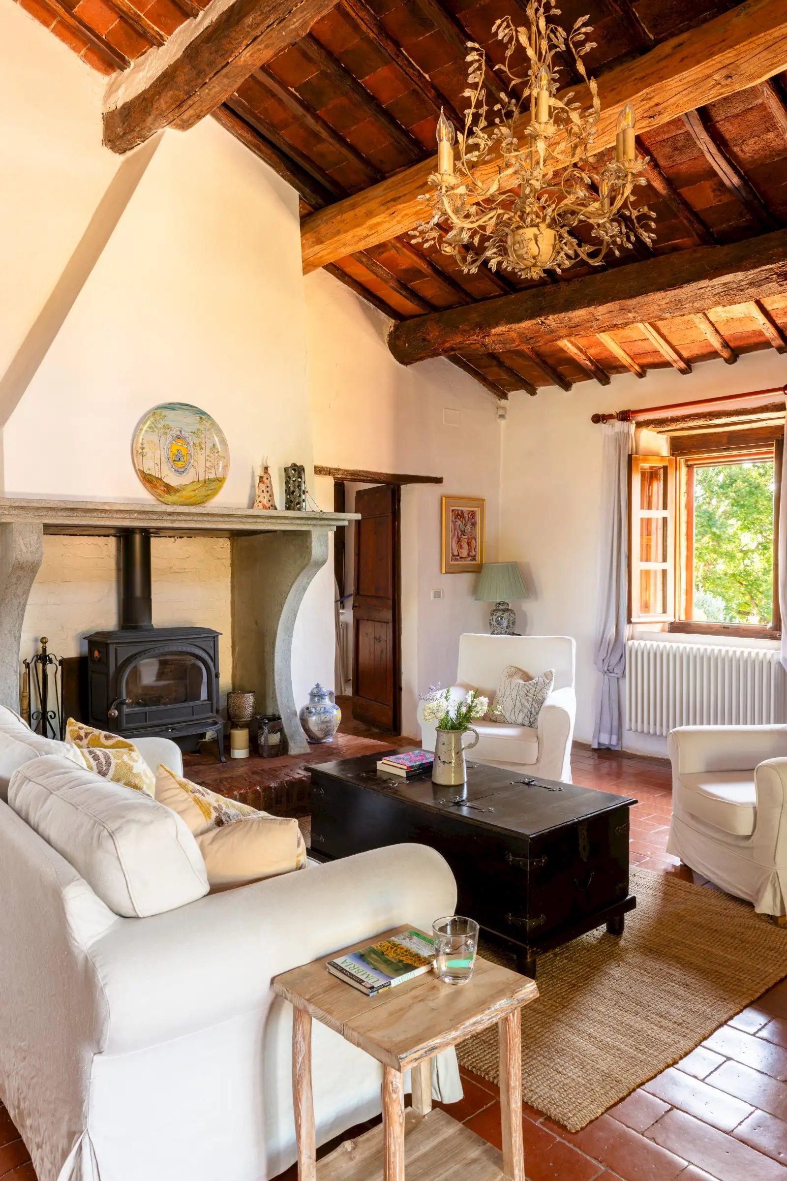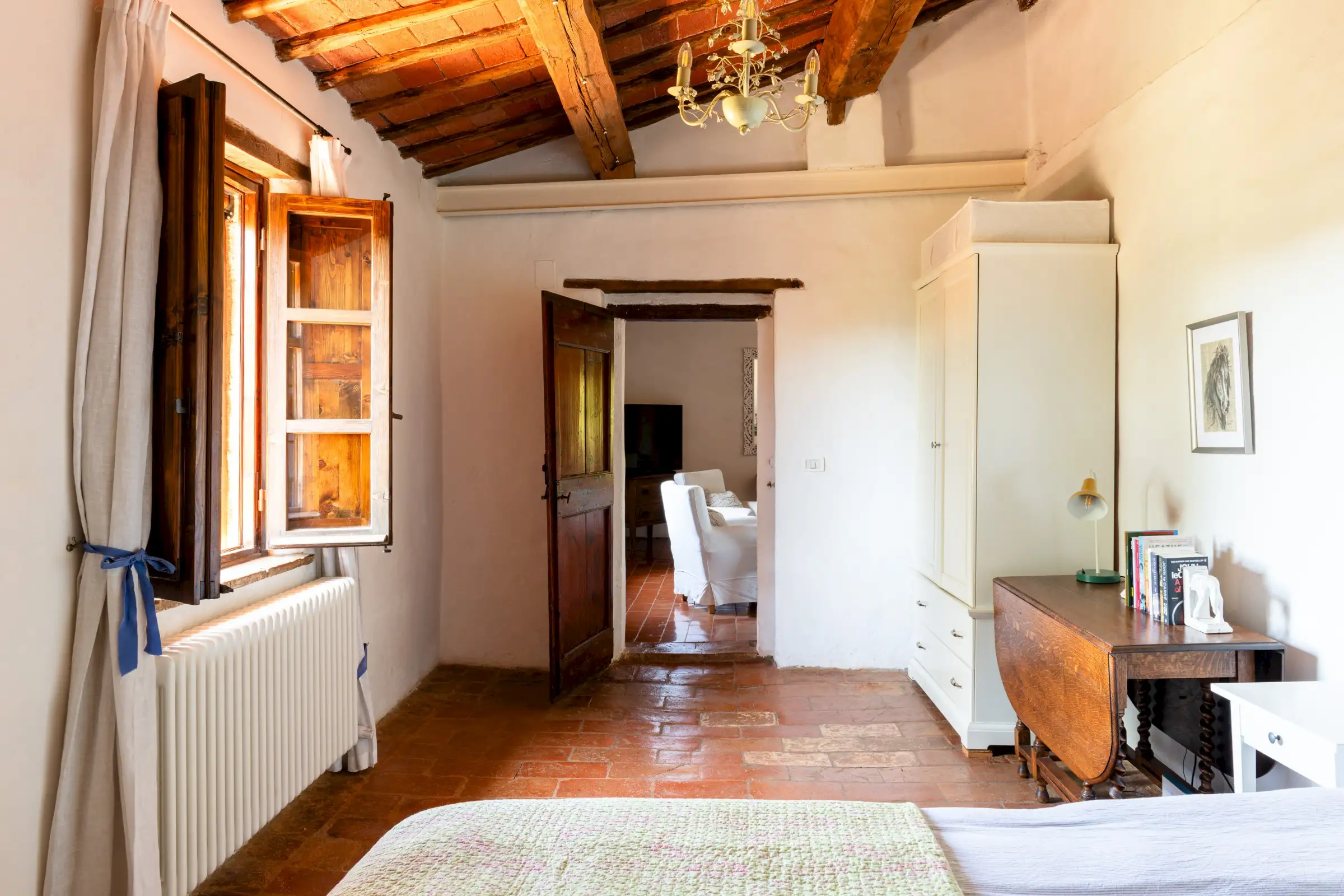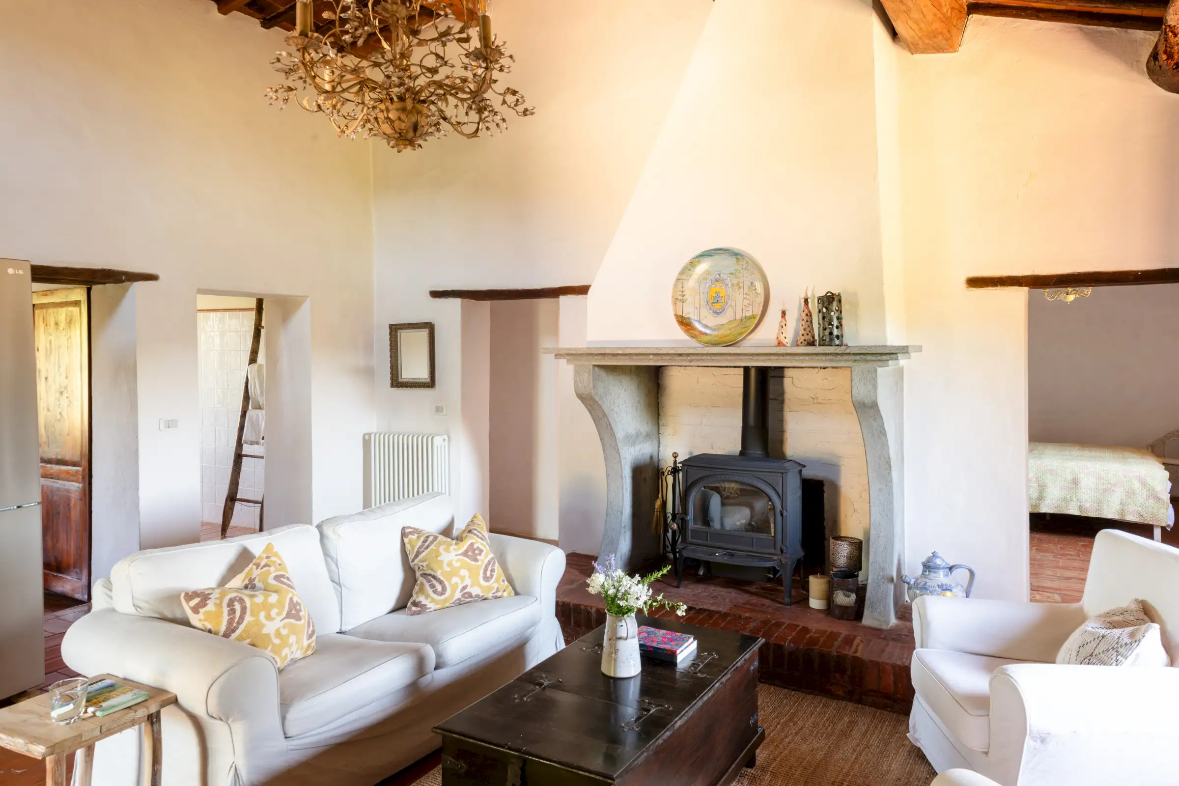 The property offers rare flexibility. The first floor has been carefully restored around 2015, and includes traditional features such as original, uneven cotto floors and wooden ceiling beams in the double-height sitting room. The result is light and inviting rooms that look out over the garden and across an olive grove to the hills beyond. The roof was renovated in 2020.