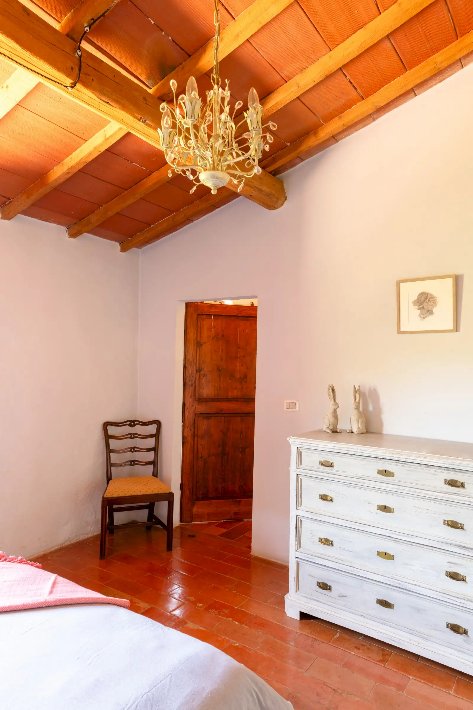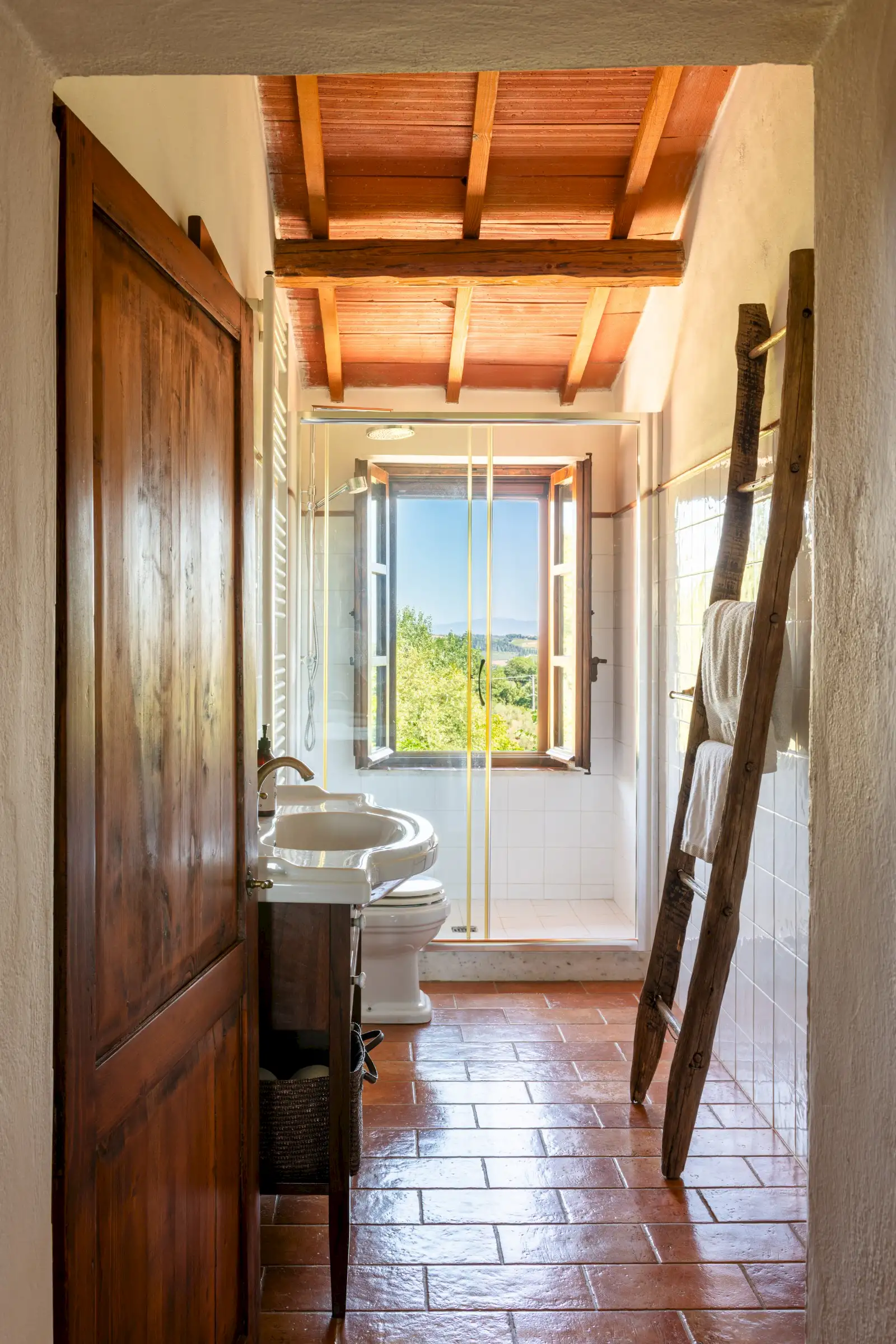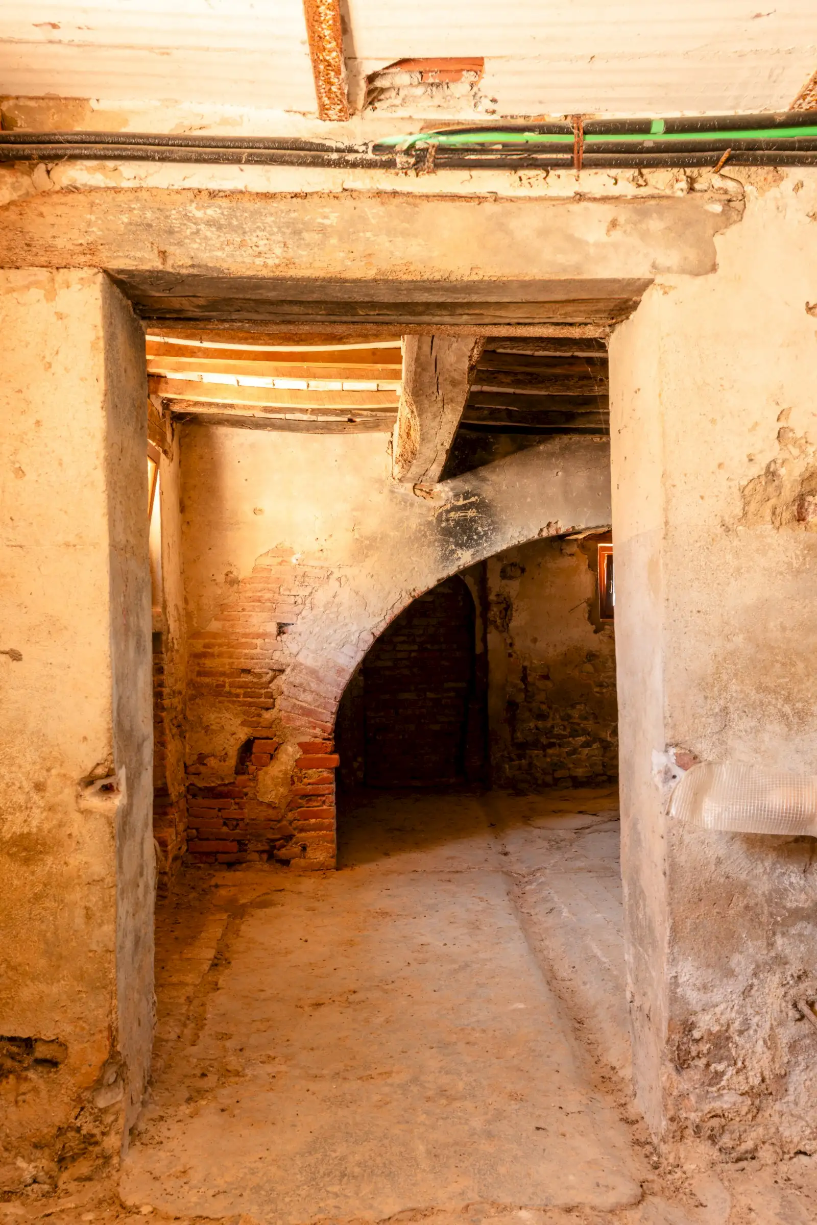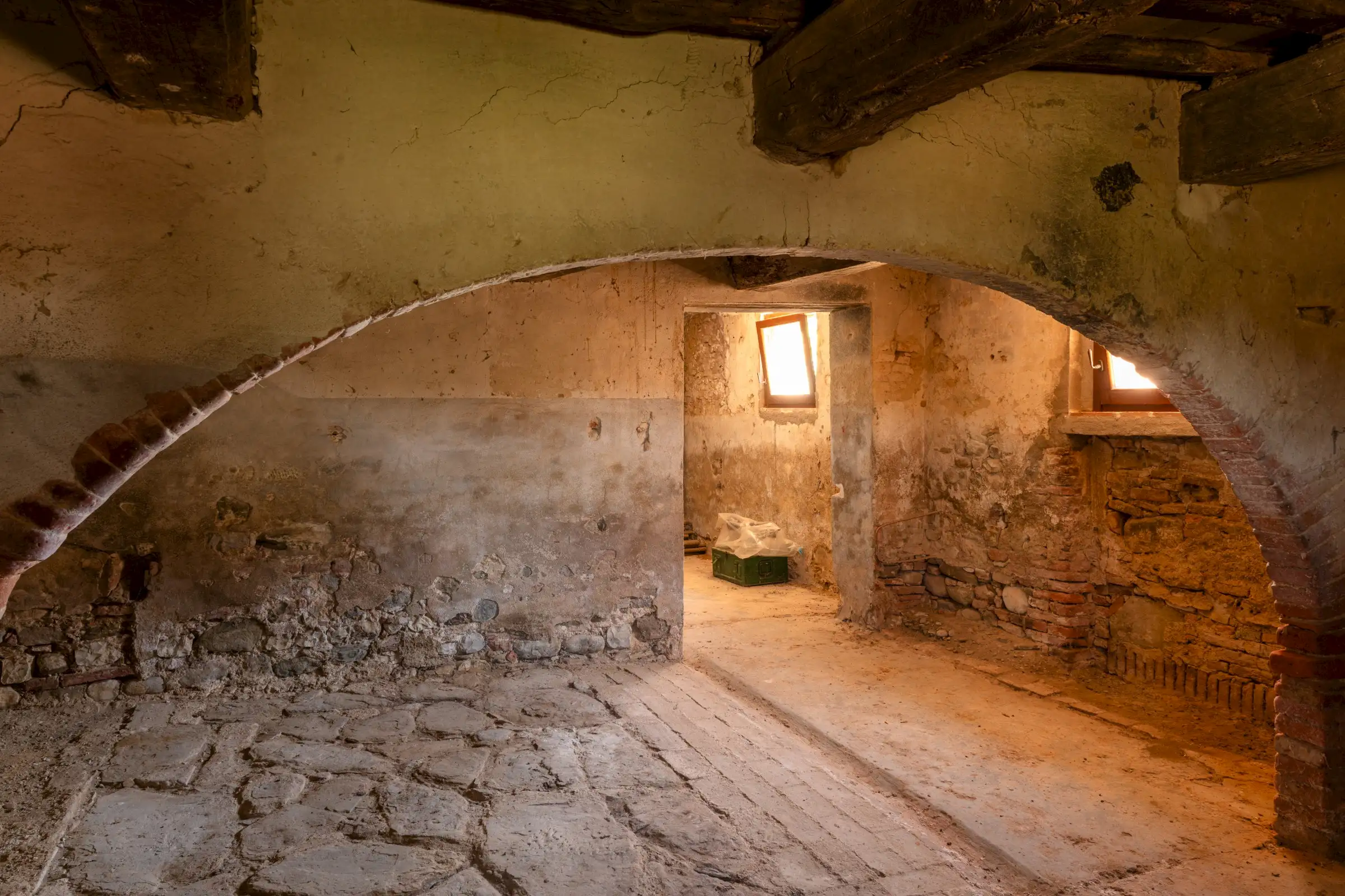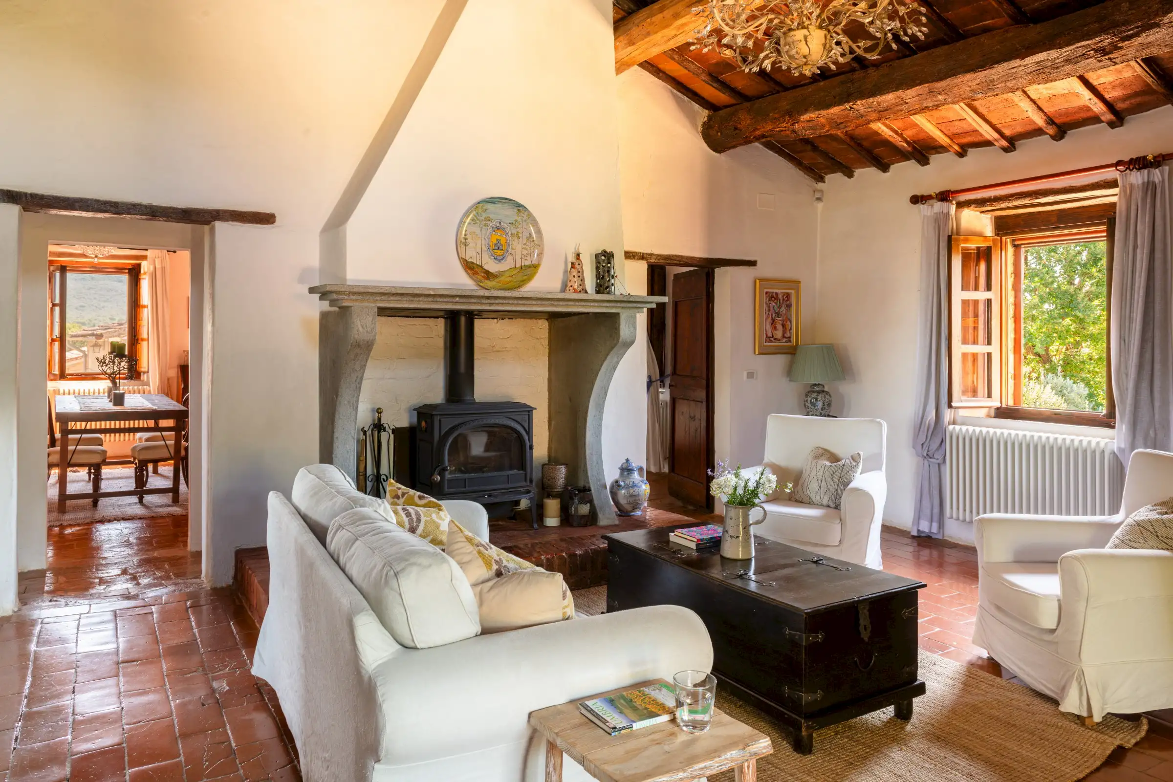 The property offers rare flexibility. The first floor has been carefully restored around 2015, and includes traditional features such as original, uneven cotto floors and wooden ceiling beams in the double-height sitting room. The result is light and inviting rooms that look out over the garden and across an olive grove to the hills beyond. The roof was renovated in 2020.