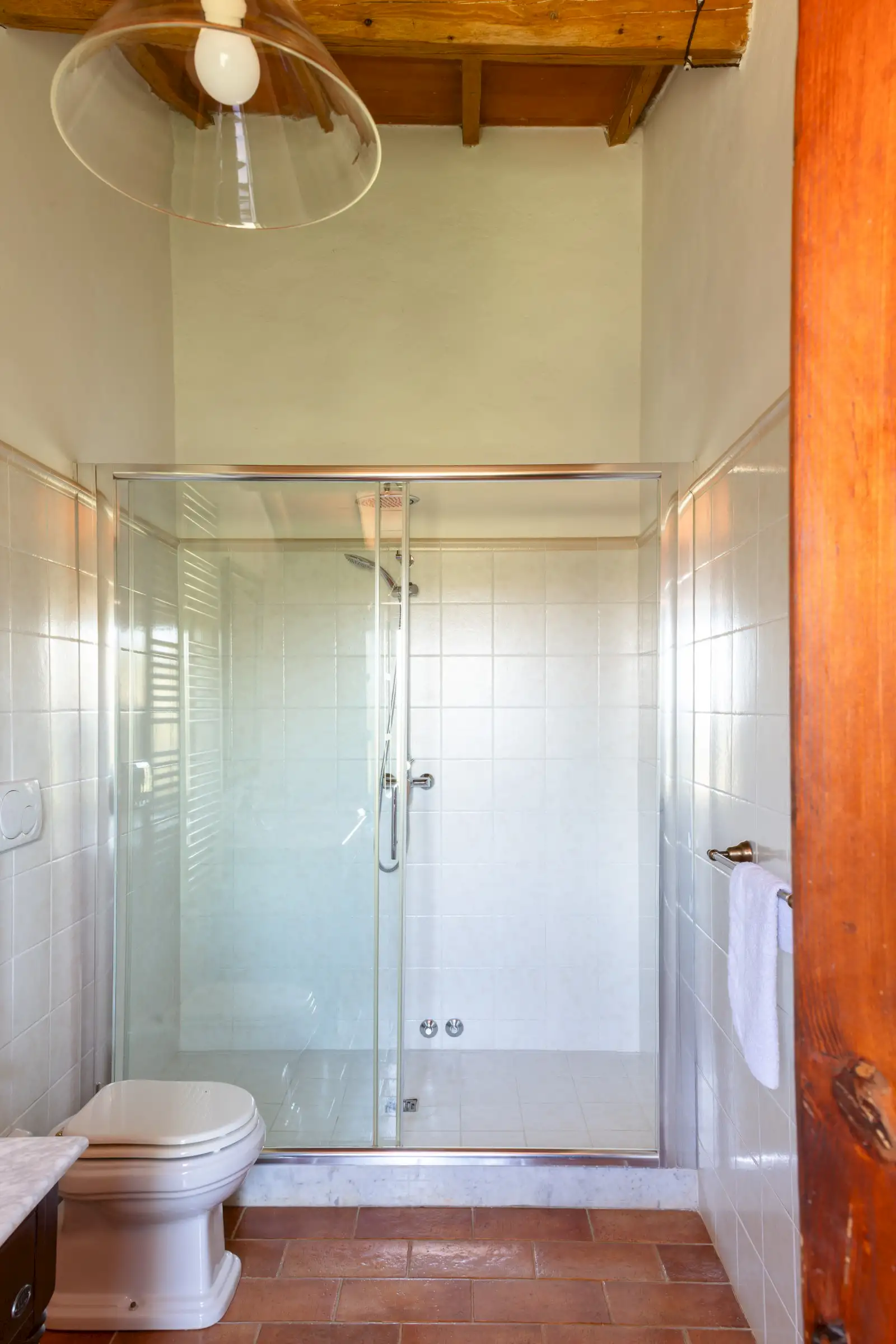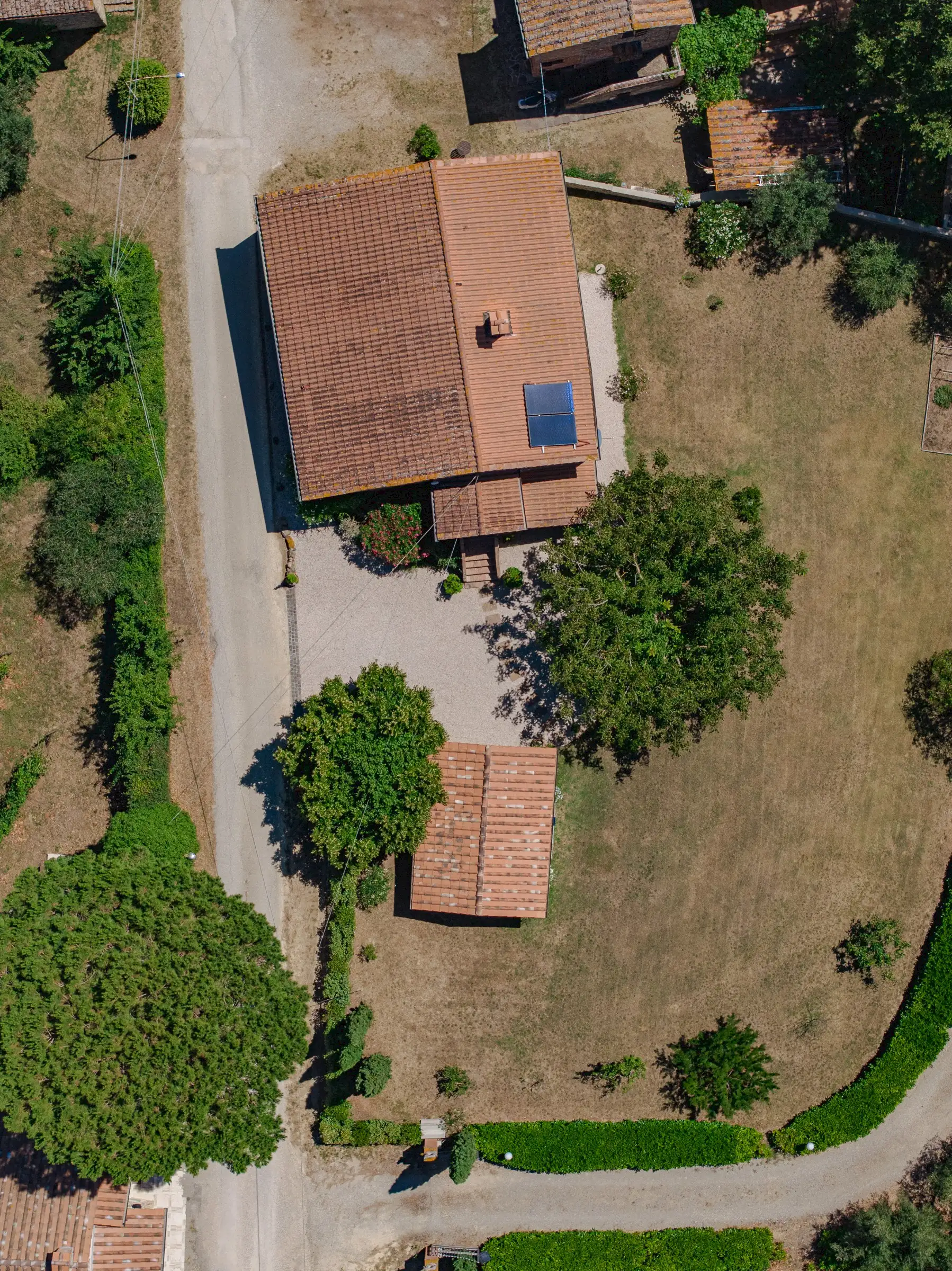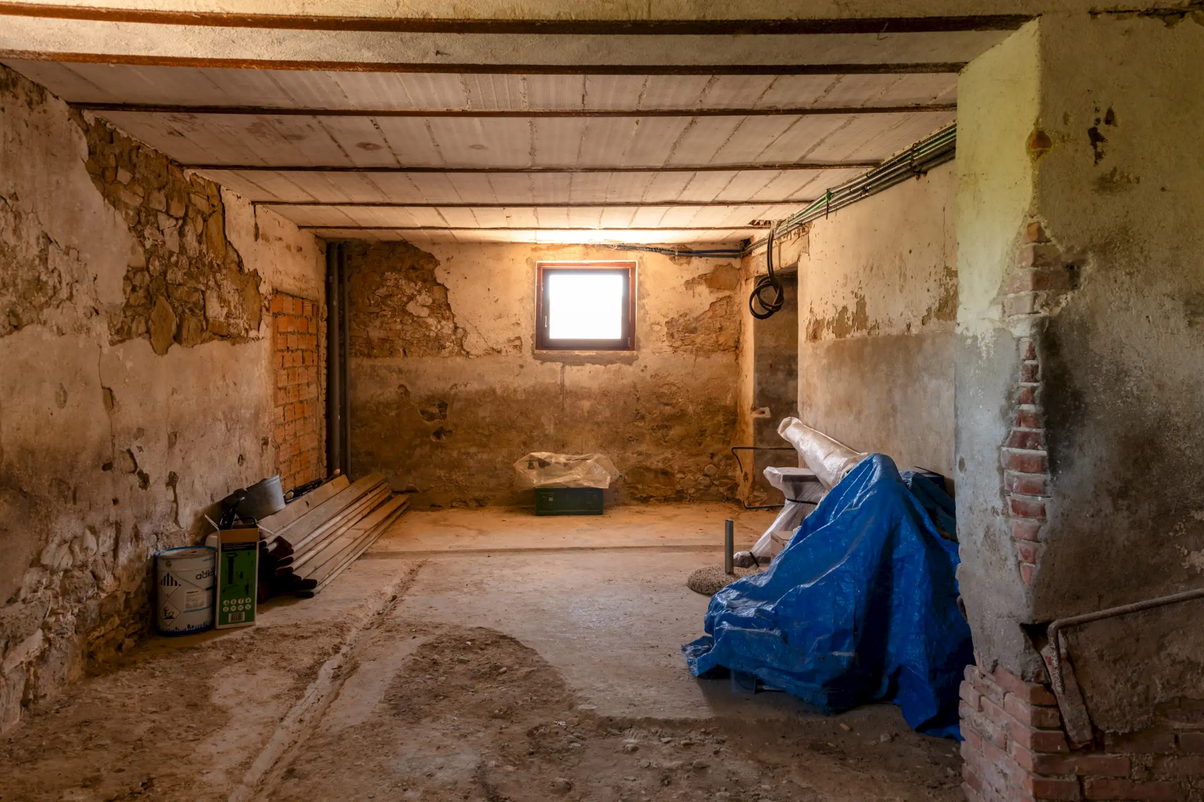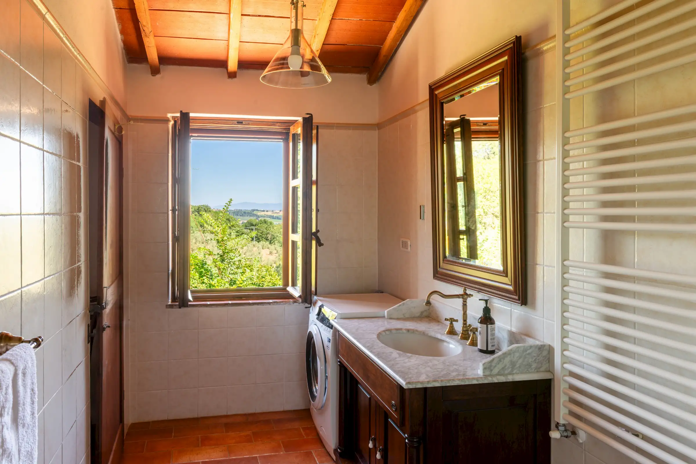 The property offers rare flexibility. The first floor has been carefully restored around 2015, and includes traditional features such as original, uneven cotto floors and wooden ceiling beams in the double-height sitting room. The result is light and inviting rooms that look out over the garden and across an olive grove to the hills beyond. The roof was renovated in 2020.