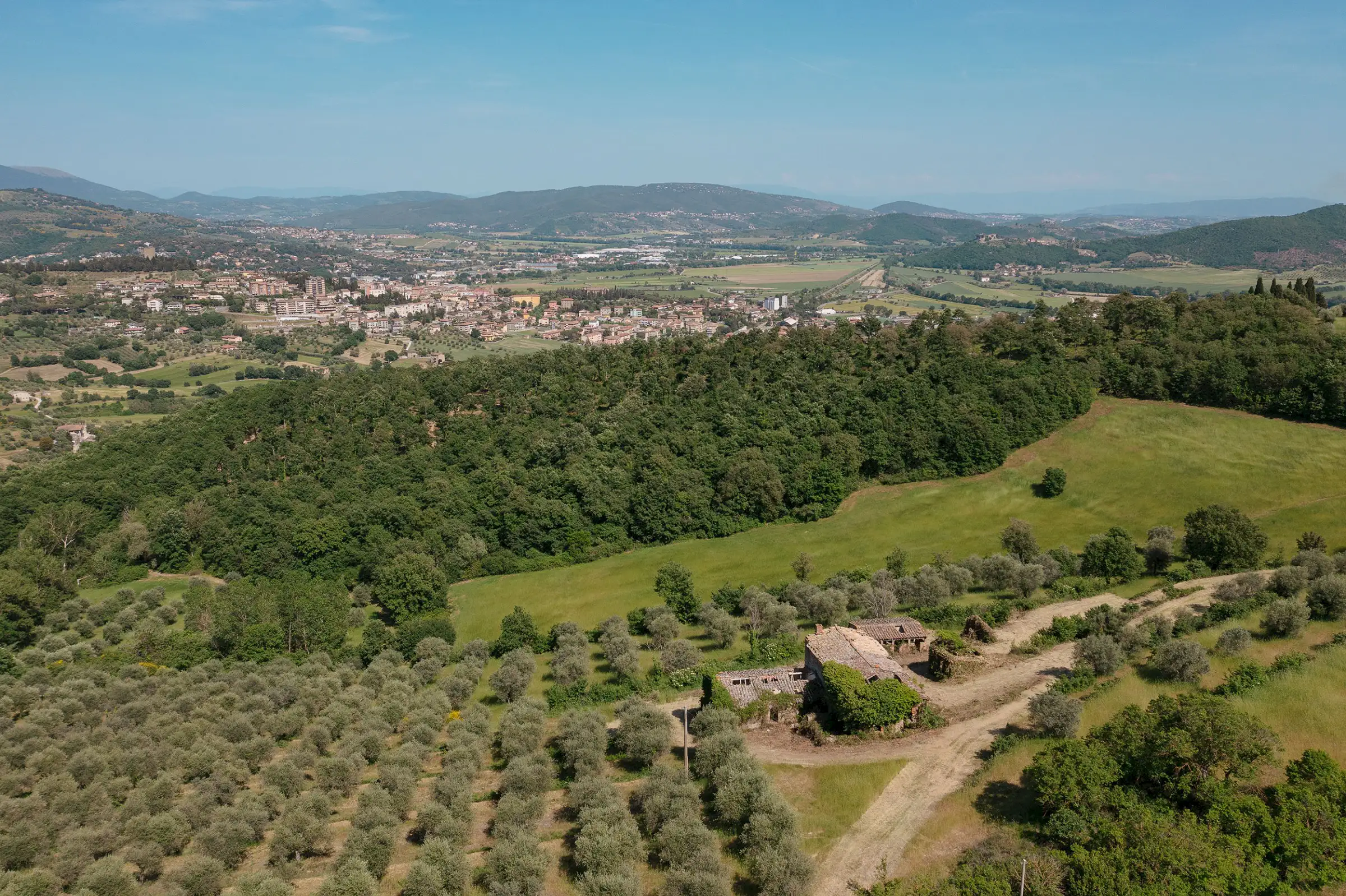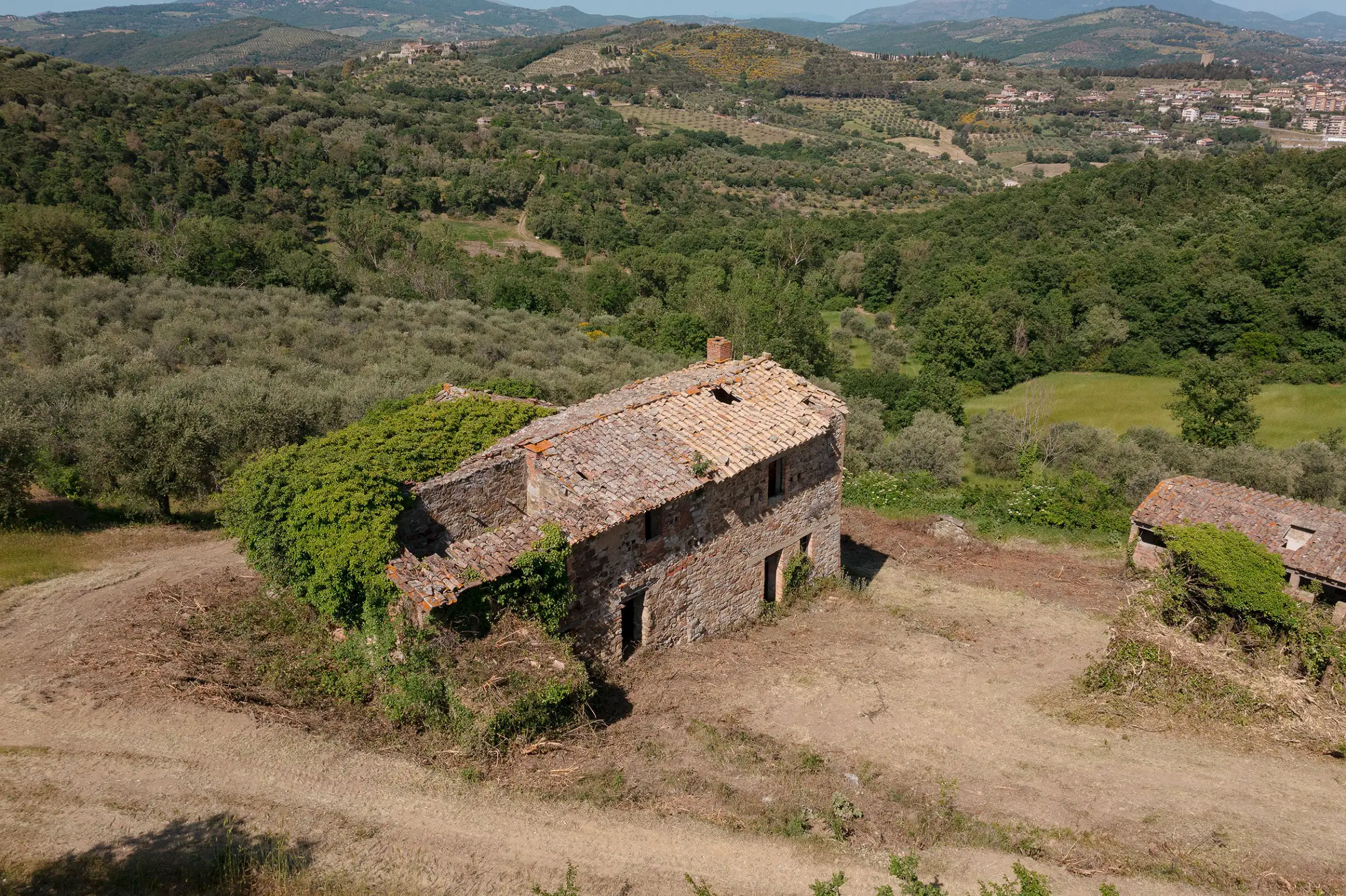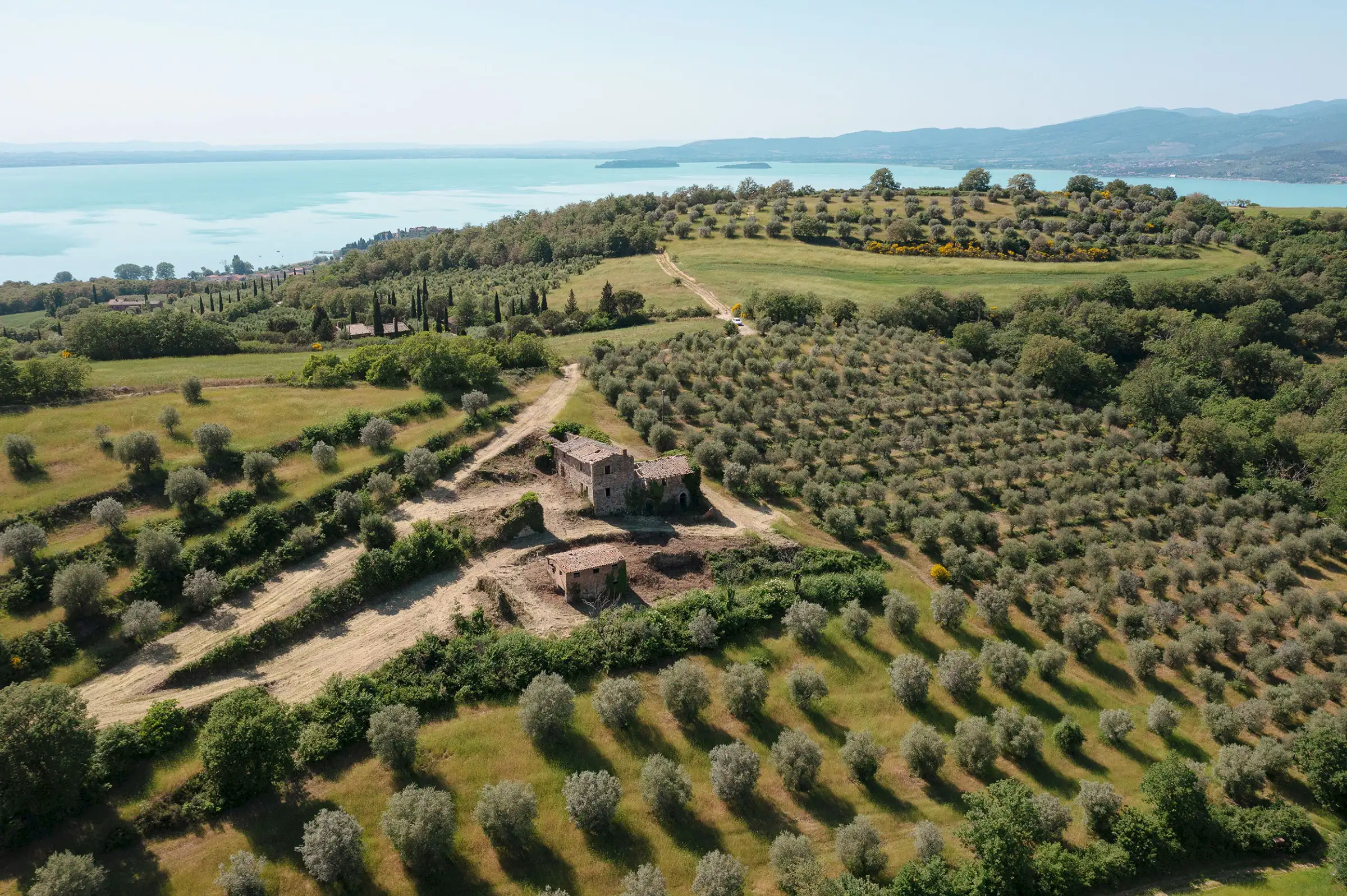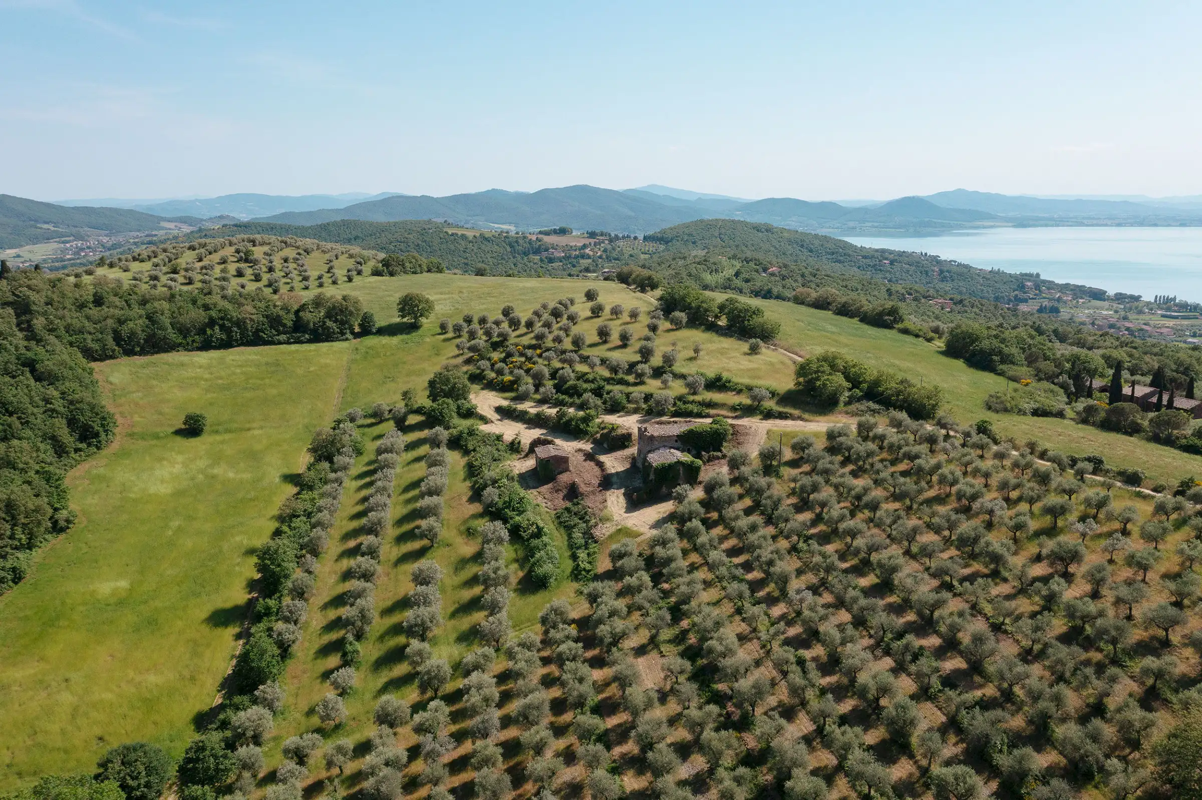 Montelago is the classic farmhouse dating back to AD 1800, typical of the countryside around Lake Trasimeno. Surrounded by olive trees and a hilly environment, with a skilful renovation, it can become a large property in a typical setting of the Umbrian countryside. The views from Montelago are very open: there is the town of Magione on one side, with the Castle of the Knights of Malta in the main view, and the small village of Montecolognola in the distance, while from the top of the land you can also get a glimpse of Lake Trasimeno. The property is located in a private area surrounded by green, woods and beautiful natural setting. Its position is strategic as it enjoys great privacy.The property consists of a main building of about 430 square meters, on three levels and an adjoining ruin of about 140 square meters. The farmhouse comes along with approximately 7.5 hectares of land. Montelago has on its premises more than 500 plants of olive trees, some are even centenary plants and the production of excellent olive oil can be pursued.