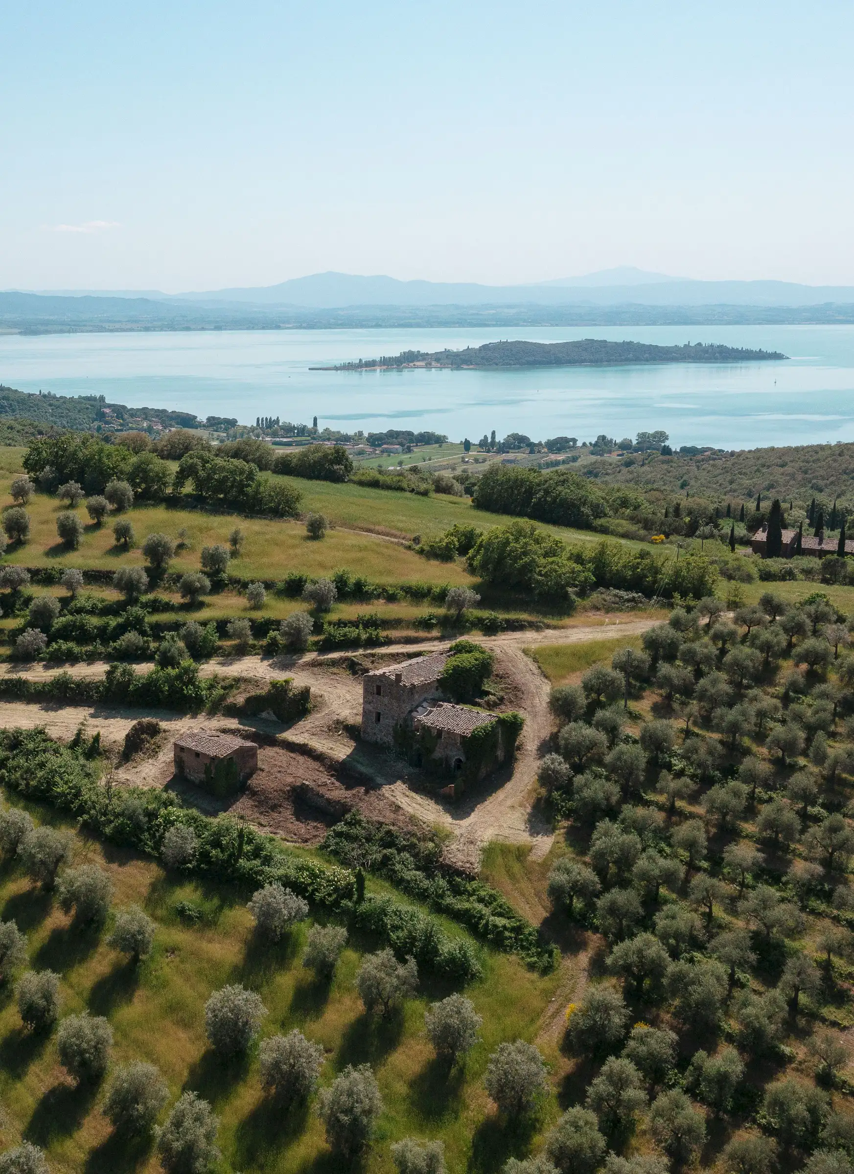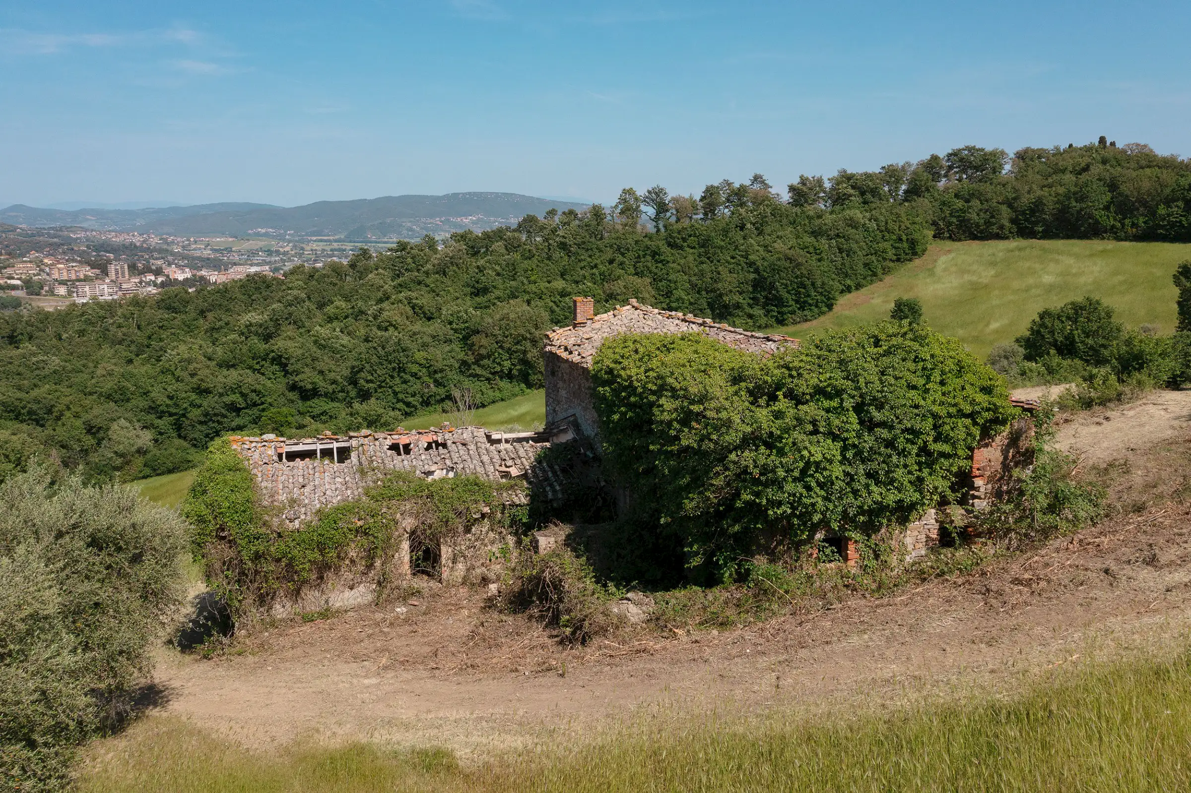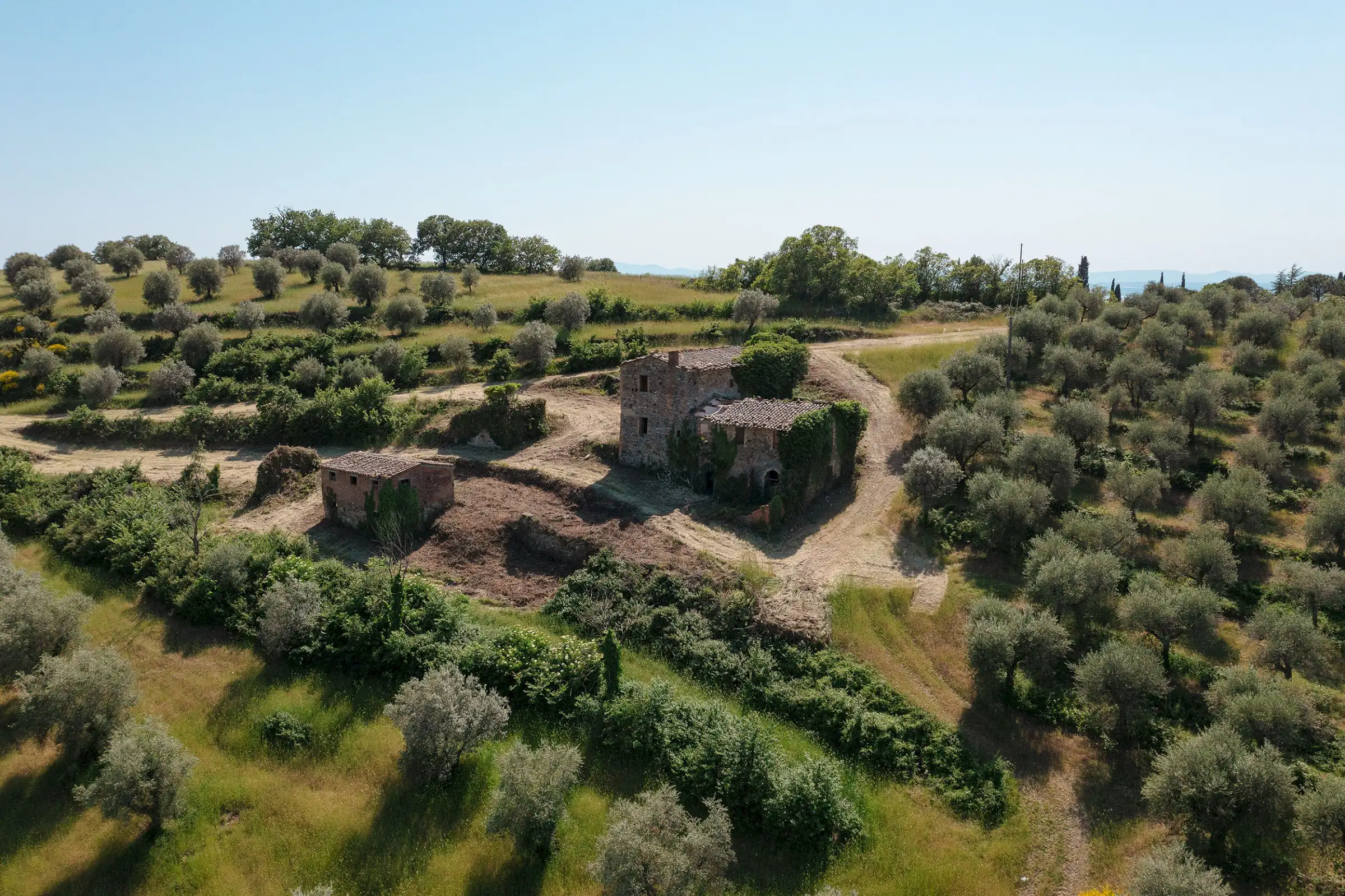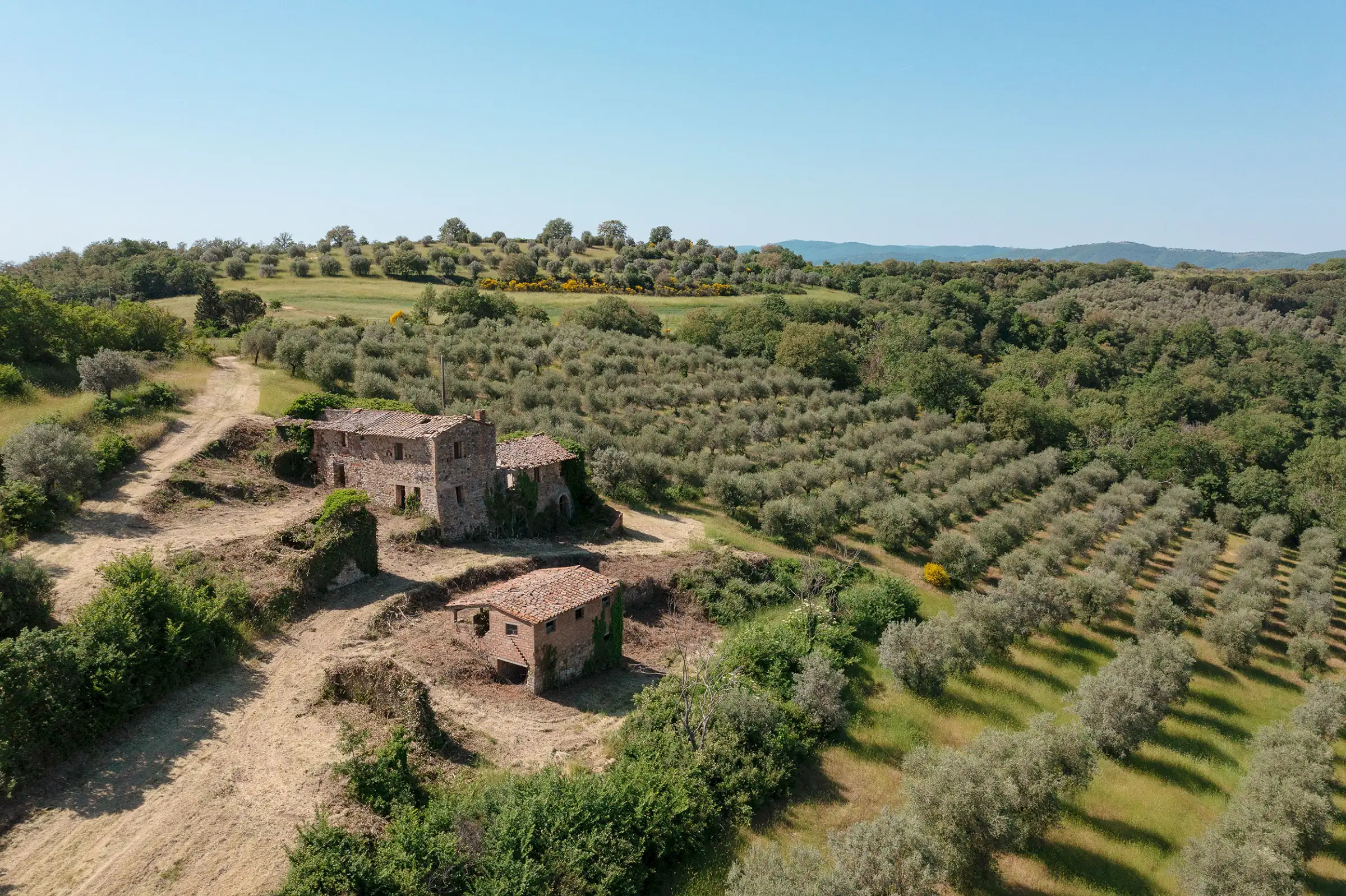 Montelago is the classic farmhouse dating back to AD 1800, typical of the countryside around Lake Trasimeno. Surrounded by olive trees and a hilly environment, with a skilful renovation, it can become a large property in a typical setting of the Umbrian countryside. The views from Montelago are very open: there is the town of Magione on one side, with the Castle of the Knights of Malta in the main view, and the small village of Montecolognola in the distance, while from the top of the land you can also get a glimpse of Lake Trasimeno. The property is located in a private area surrounded by green, woods and beautiful natural setting. Its position is strategic as it enjoys great privacy.The property consists of a main building of about 430 square meters, on three levels and an adjoining ruin of about 140 square meters. The farmhouse comes along with approximately 7.5 hectares of land. Montelago has on its premises more than 500 plants of olive trees, some are even centenary plants and the production of excellent olive oil can be pursued.