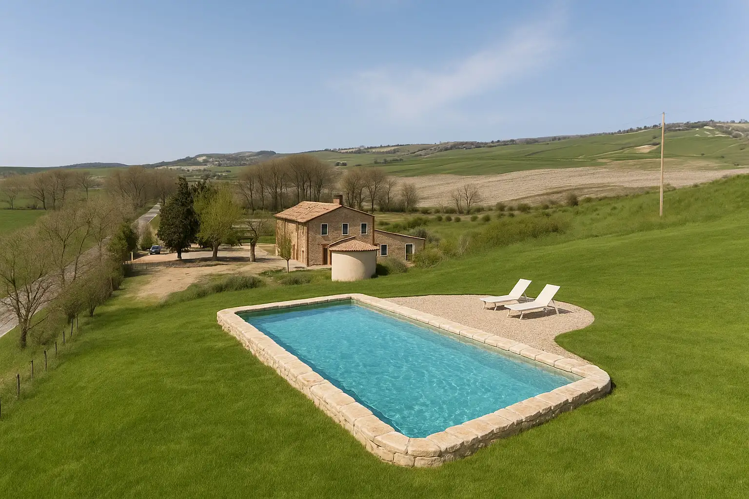 At the back of the house, a bio lake may be constructed, enjoying guaranteed panoramic views of the Val d'Orcia hills.