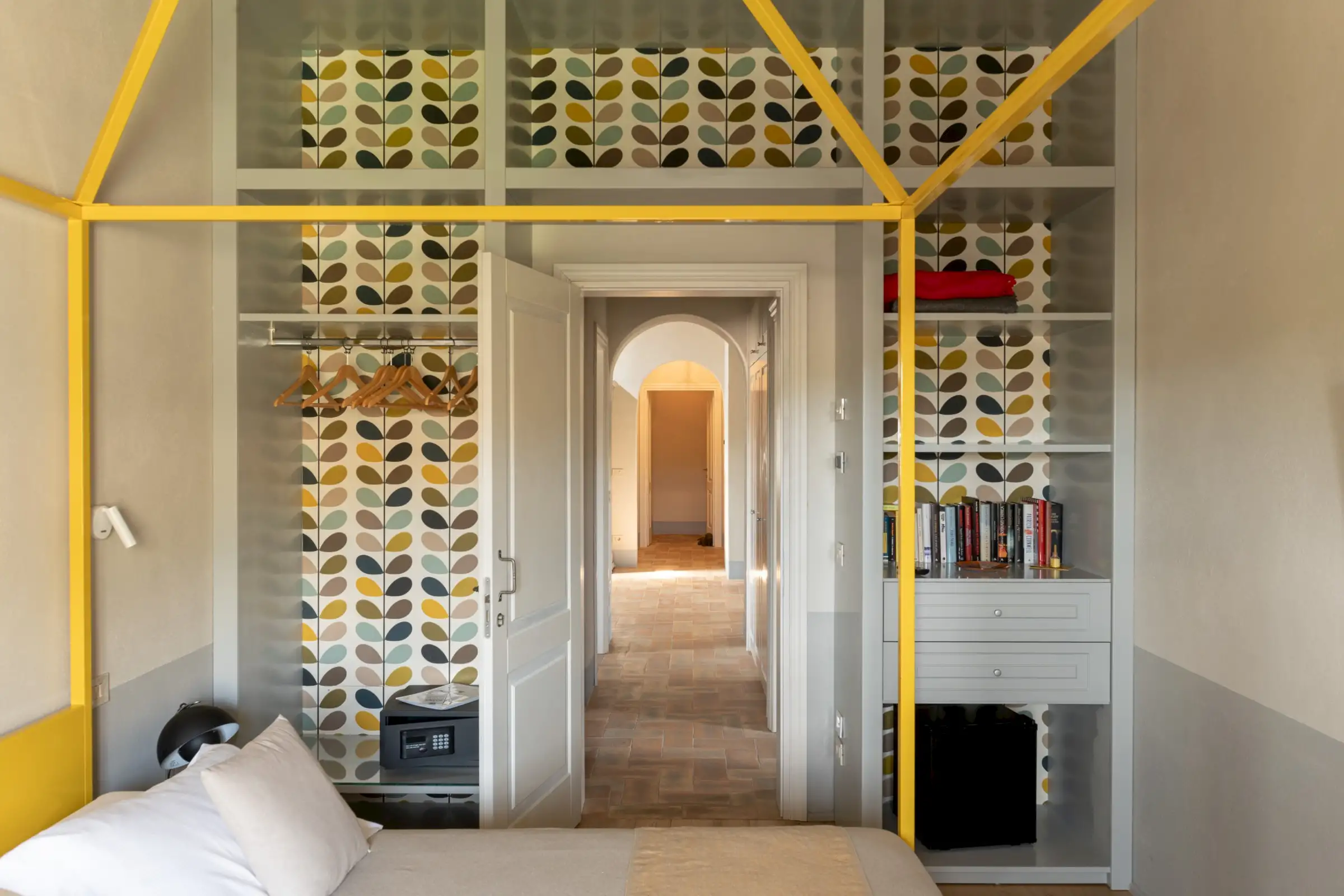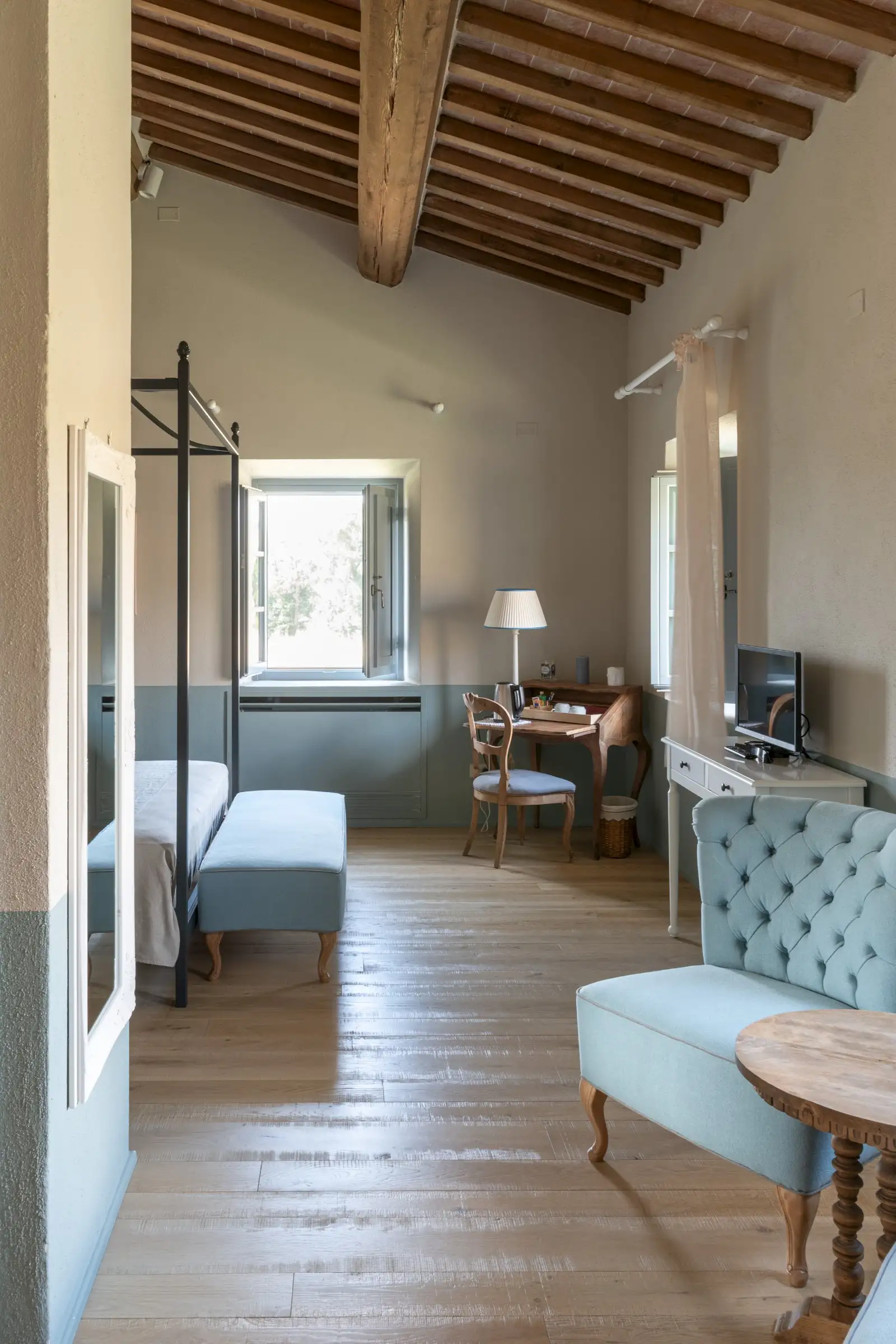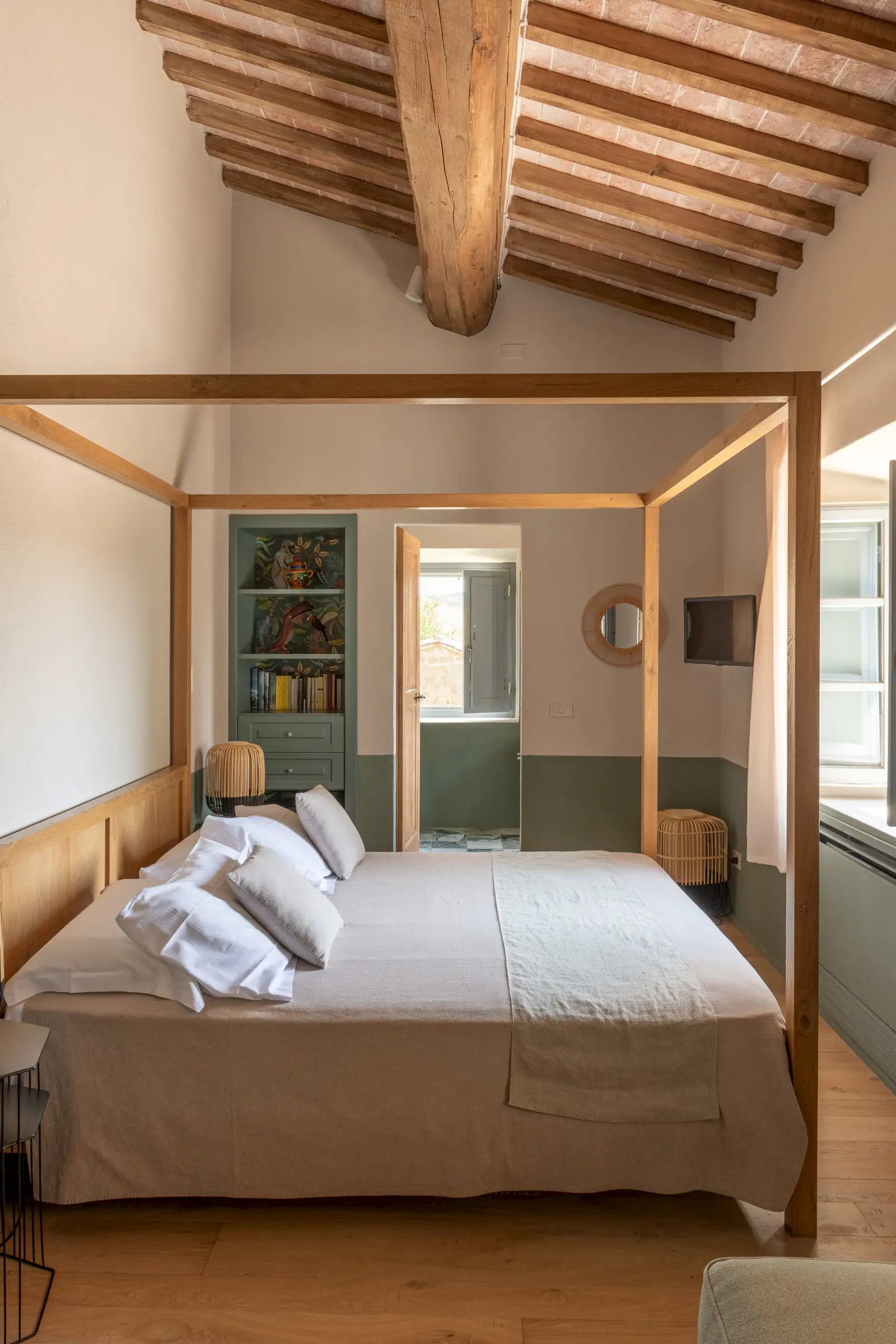 The rooms in this house exude a warm and inviting atmosphere, seamlessly blending traditional Tuscan charm with modern comfort and style. The bedrooms feature striking canopy beds with unique color accents like yellow and dark tones, giving them a fresh and contemporary look. Wooden ceilings with exposed beams add rustic charm, while the decor ensures a luxurious ambiance.