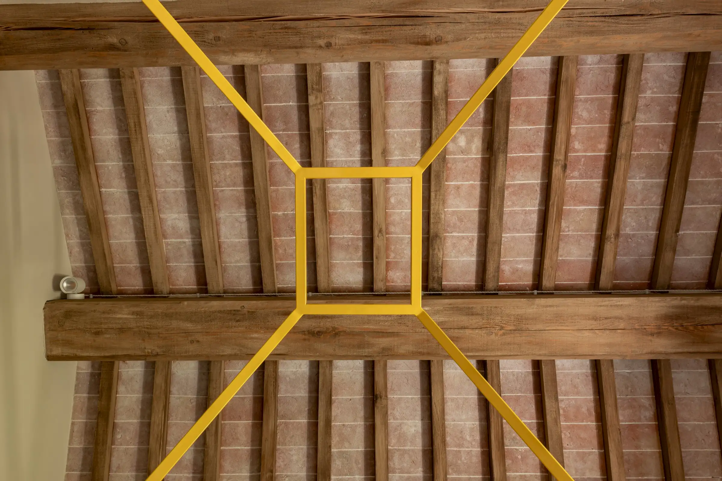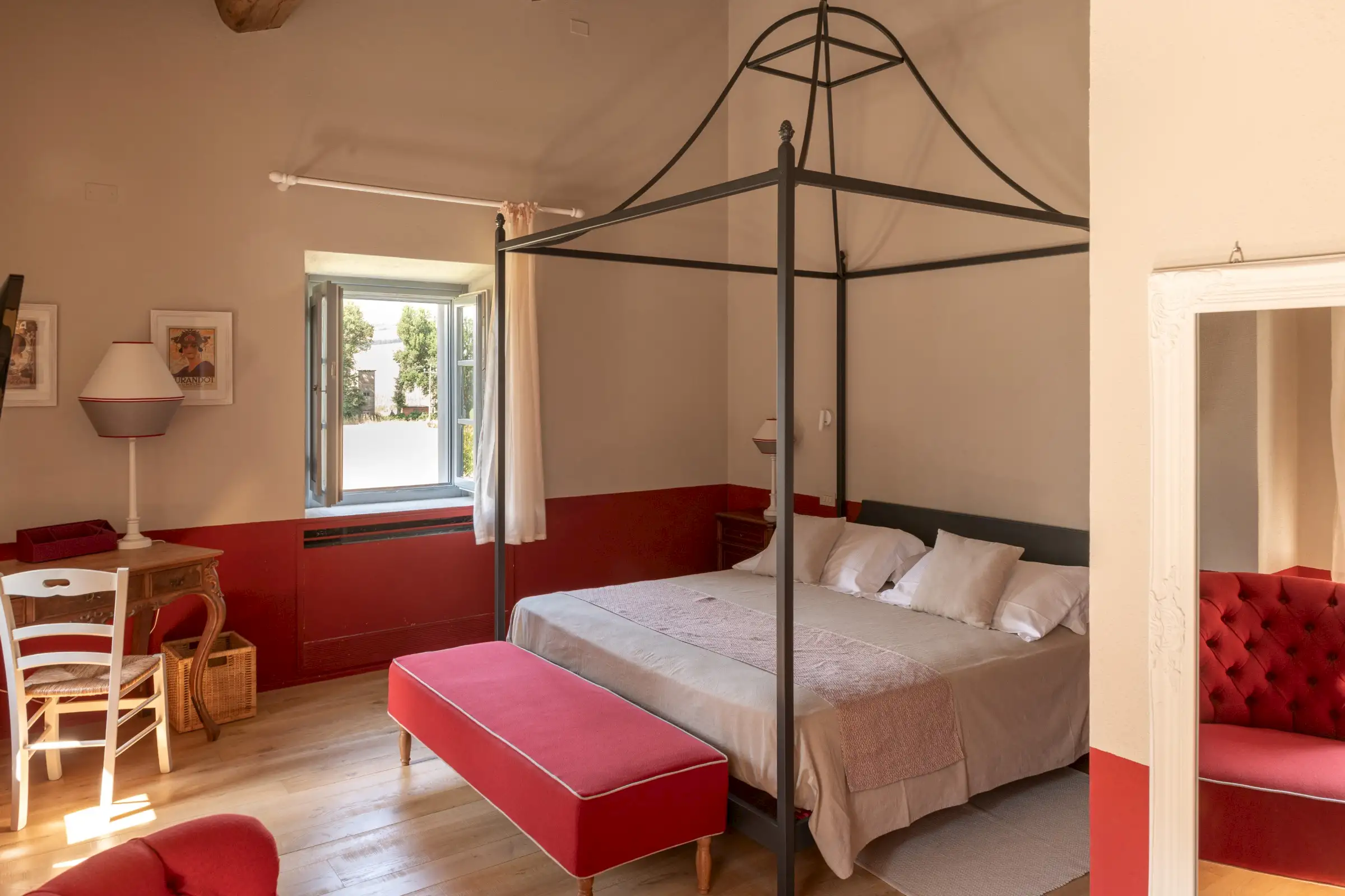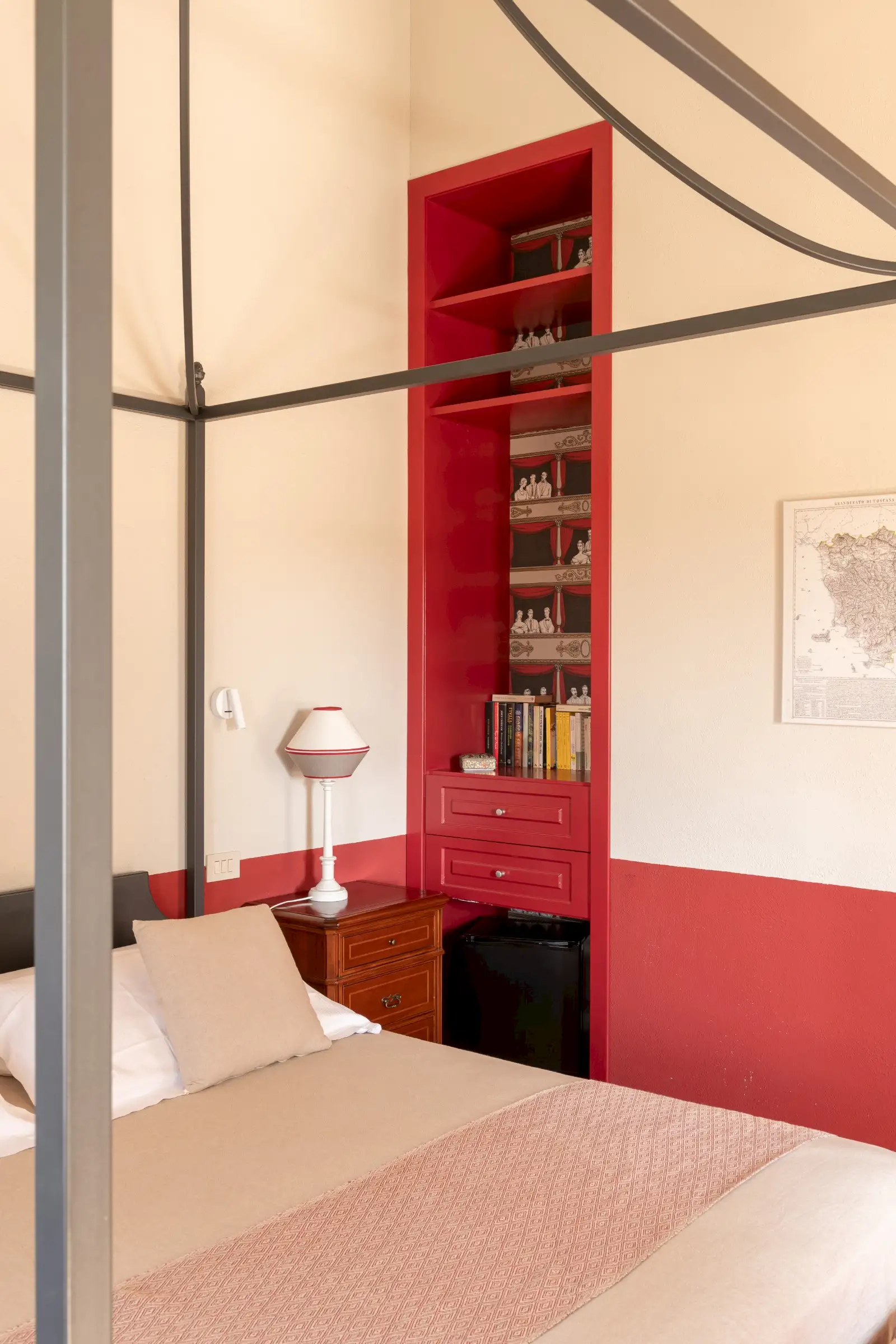 The rooms in this house exude a warm and inviting atmosphere, seamlessly blending traditional Tuscan charm with modern comfort and style. The bedrooms feature striking canopy beds with unique color accents like yellow and dark tones, giving them a fresh and contemporary look. Wooden ceilings with exposed beams add rustic charm, while the decor ensures a luxurious ambiance.