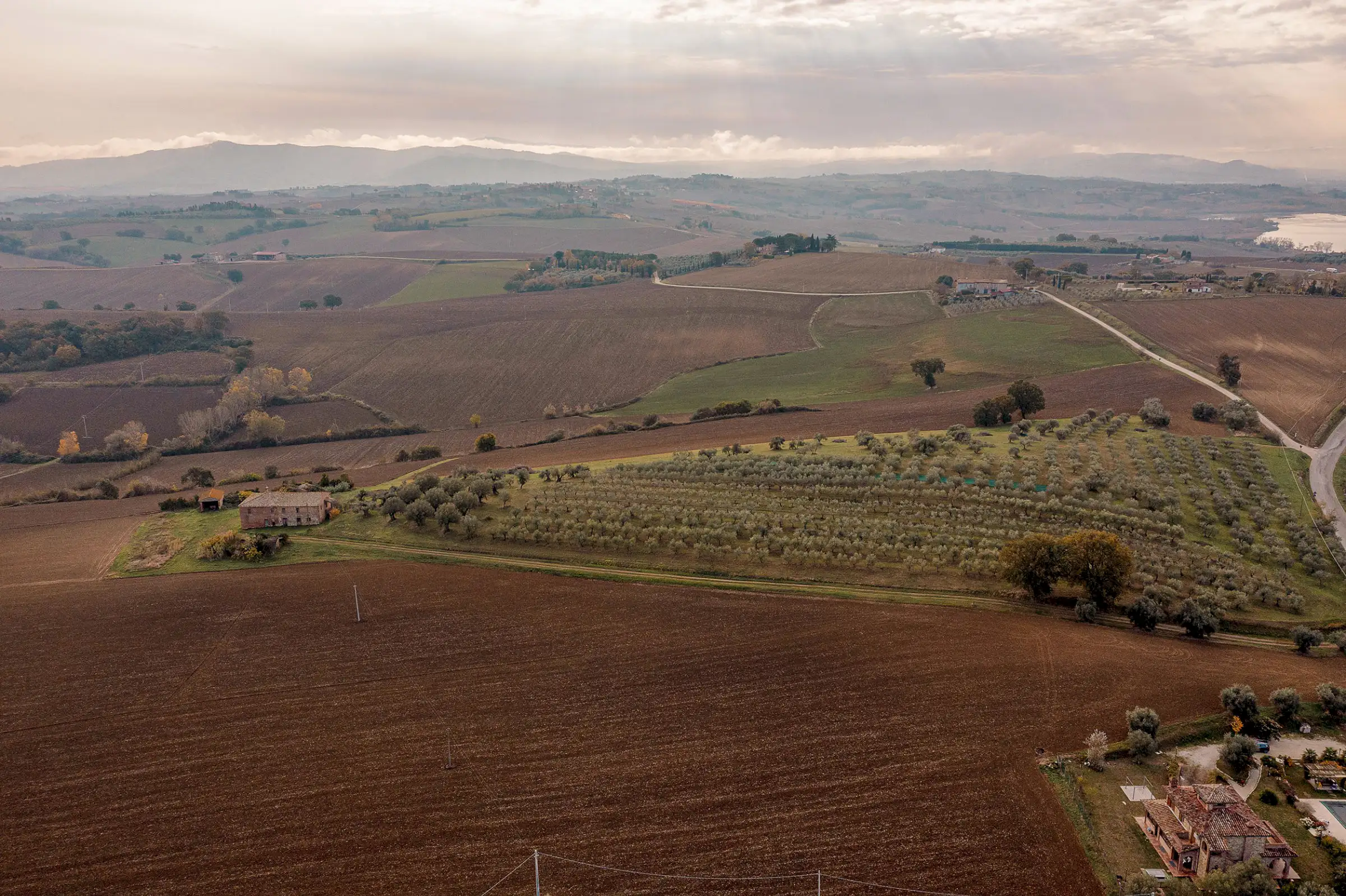 Poggiovento is a 19th century farmhouse built of the warm red brick typical of the area around Lake Trasimeno. The property occupies a commanding position in the rolling landscape of Italy’s heartland, surrounded by fields, hills and olive groves and the lake in the near distance. The panoramic view is sensational.