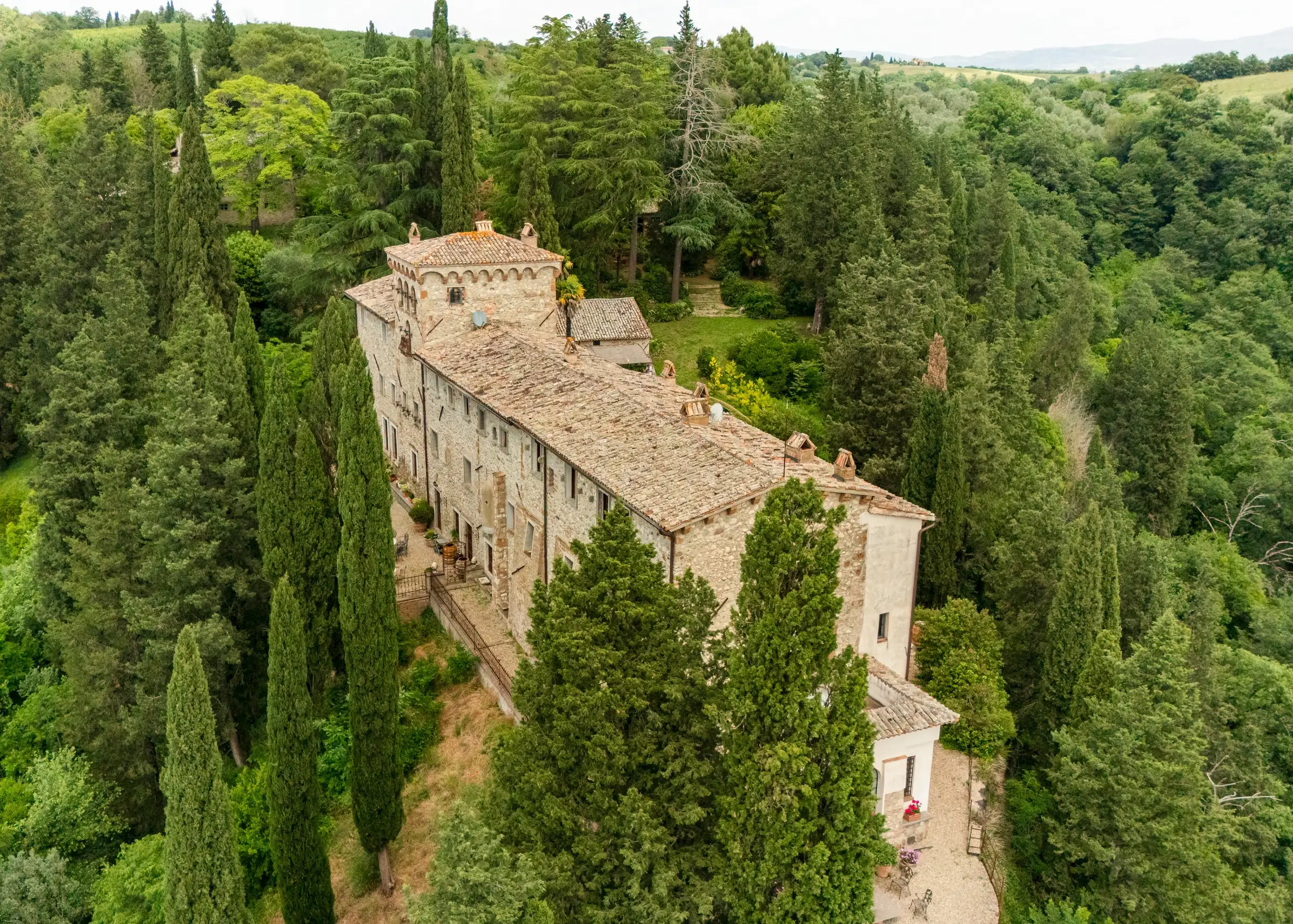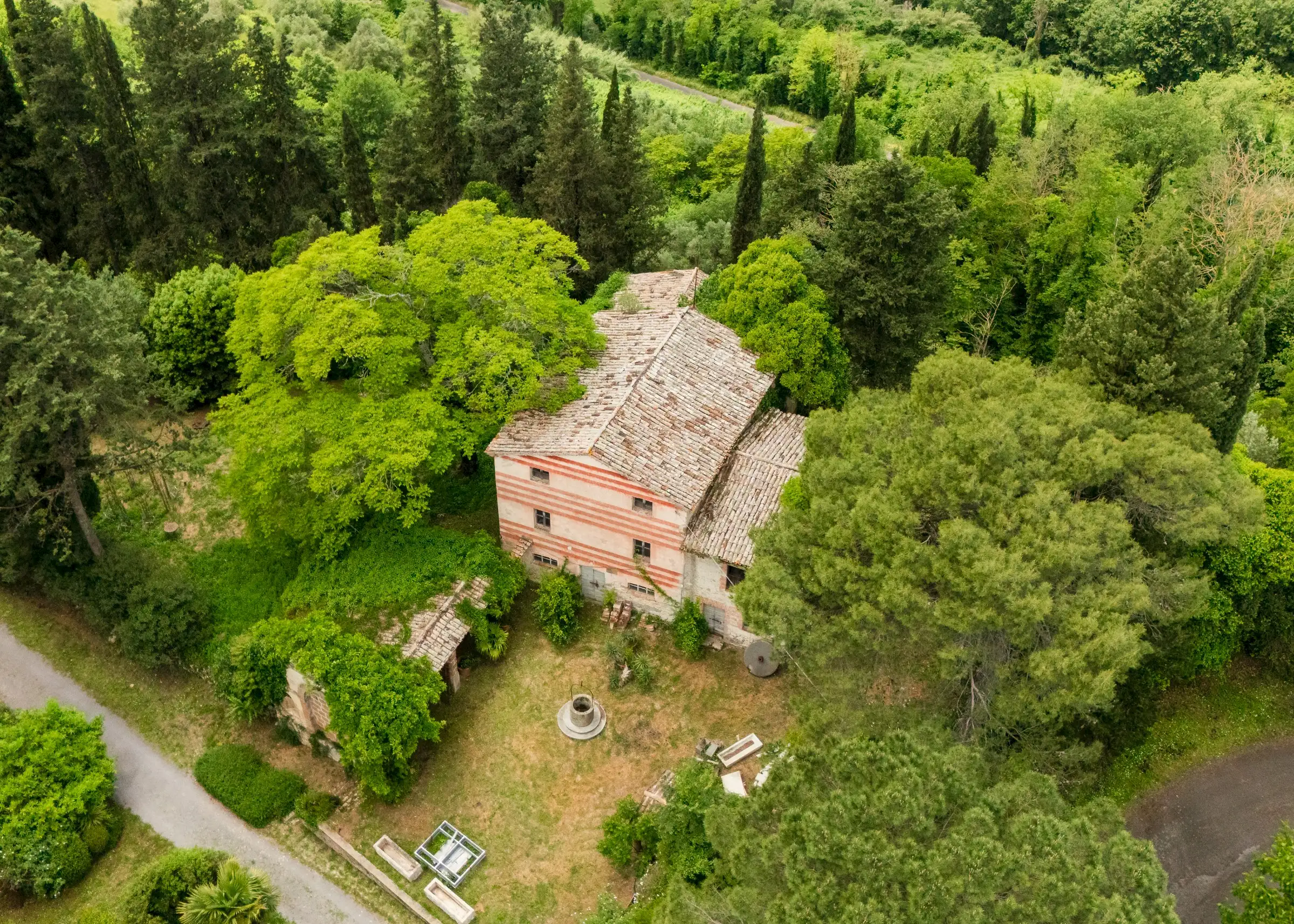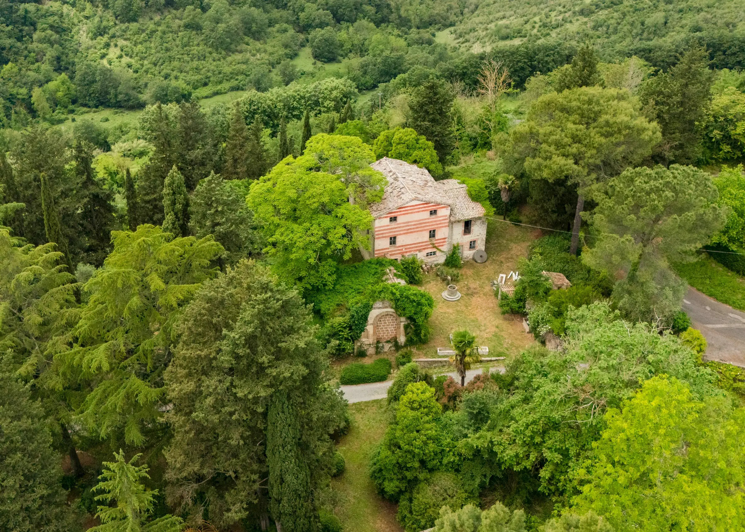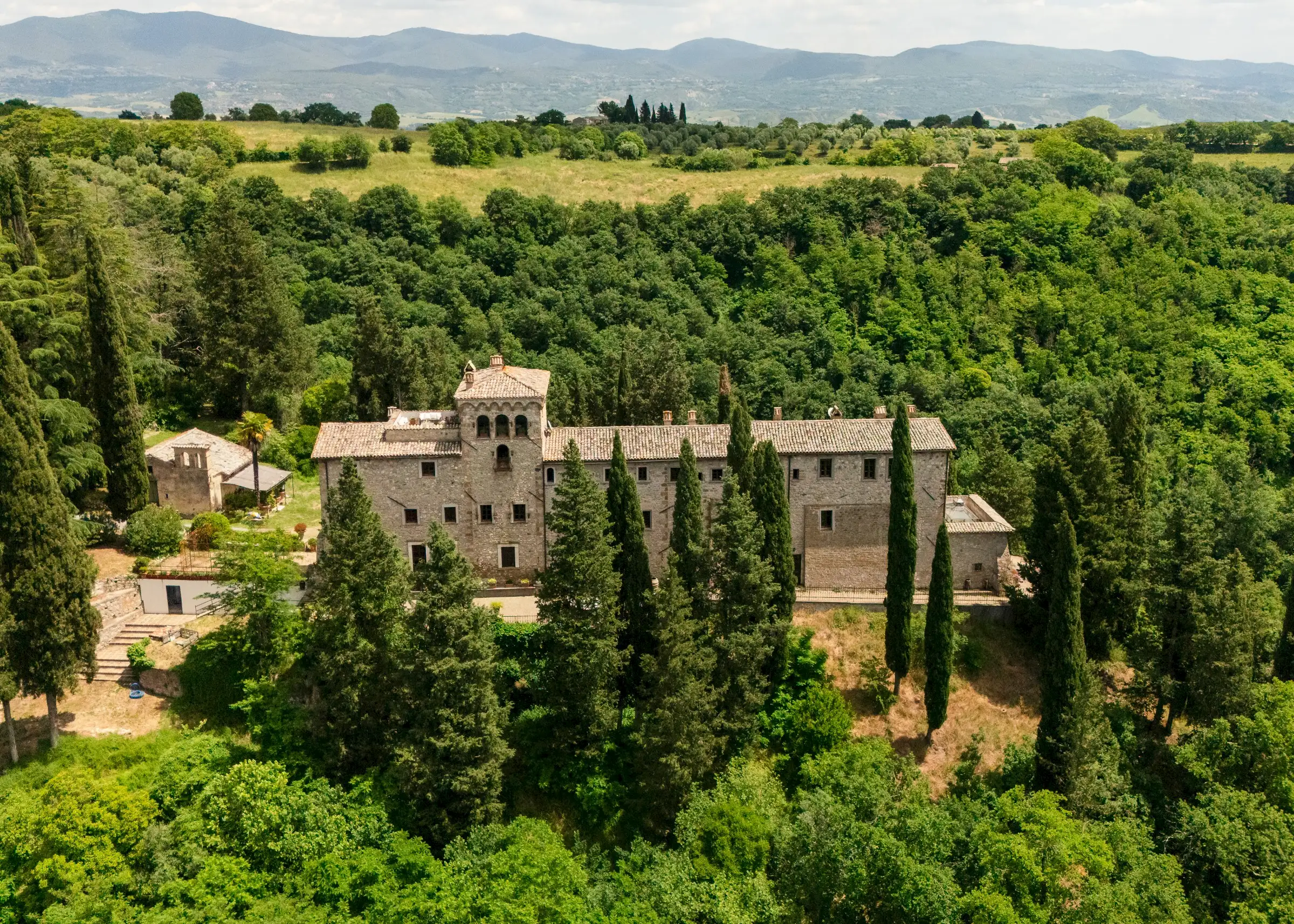 Built on the foundations of an ancient Roman watchtower, reconstructed during the Lombard period (850 AD) and extended in the 12th century, the manor house, including the original tower, spans three floors. Once a medieval military post, it was later transformed into an elegant palazzo. Approached along a cypress‐lined avenue, there’s a small and pretty freestanding chapel opposite the front door to the main house. An elegant, detached farmhouse with a striped façade at the start of the drive is in need of substantial renovation but retains beautiful original features. Four natural caves carved into the rock, one housing the old mill and another the original cellar, complete the estate.