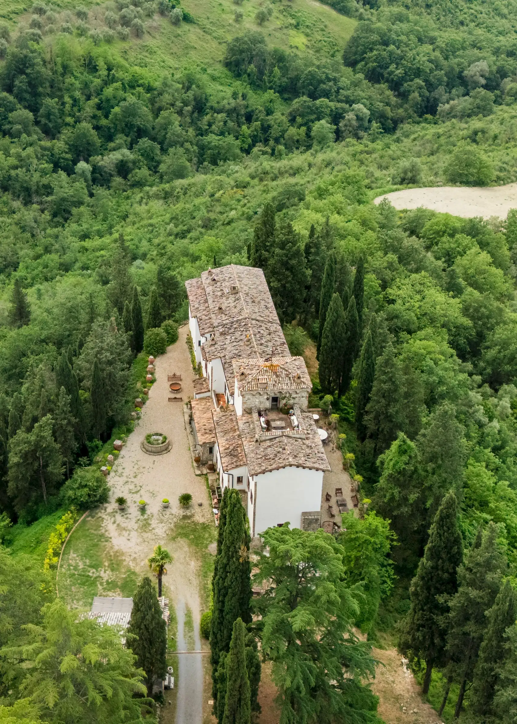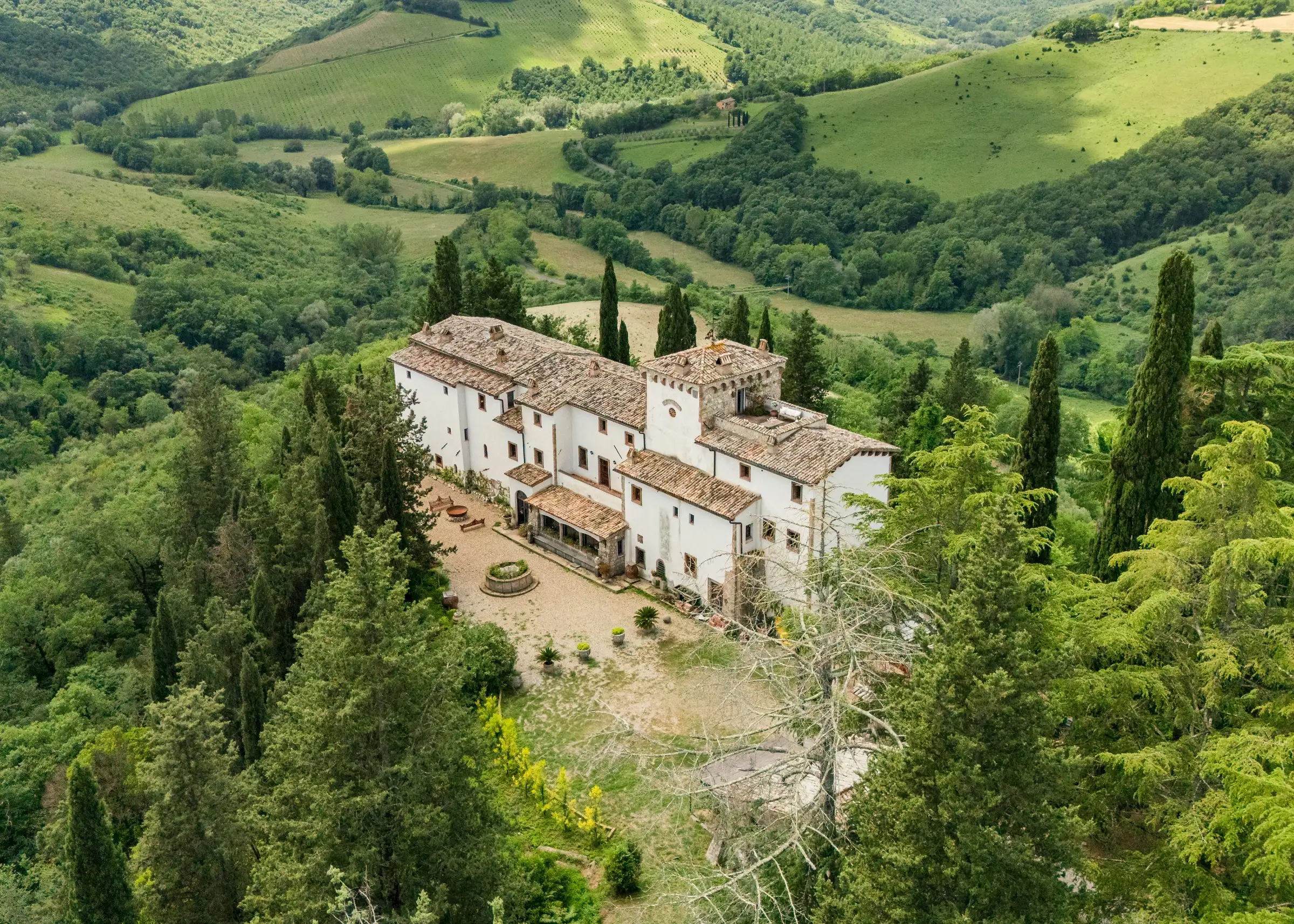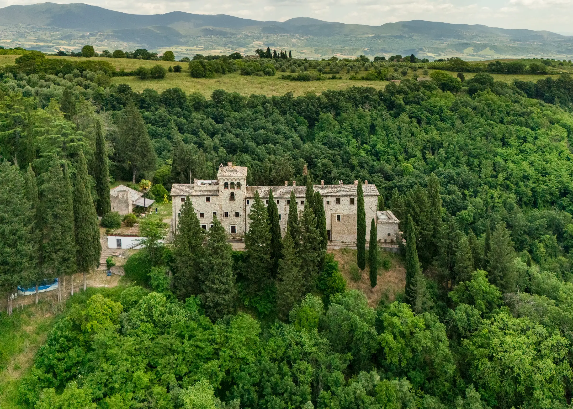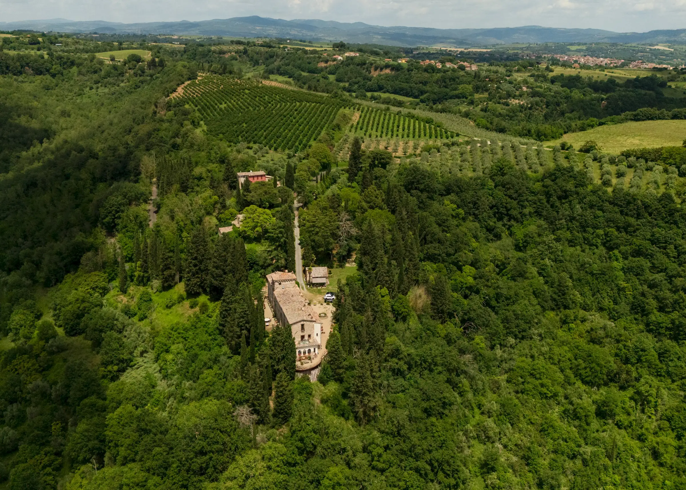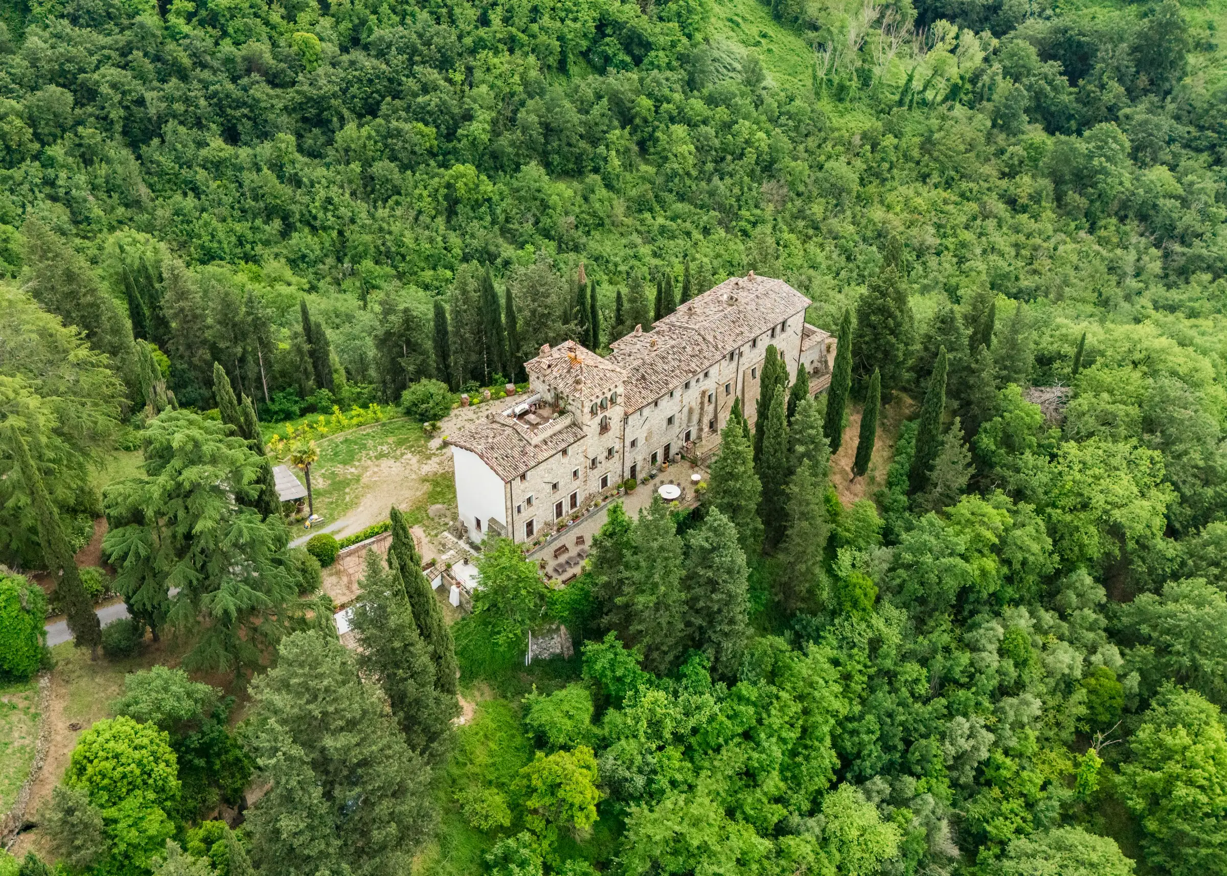 Built on the foundations of an ancient Roman watchtower, reconstructed during the Lombard period (850 AD) and extended in the 12th century, the manor house, including the original tower, spans three floors. Once a medieval military post, it was later transformed into an elegant palazzo. Approached along a cypress‐lined avenue, there’s a small and pretty freestanding chapel opposite the front door to the main house. An elegant, detached farmhouse with a striped façade at the start of the drive is in need of substantial renovation but retains beautiful original features. Four natural caves carved into the rock, one housing the old mill and another the original cellar, complete the estate.
