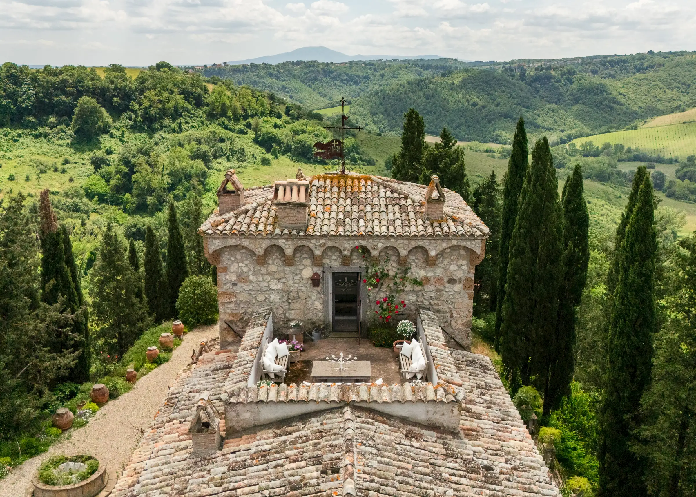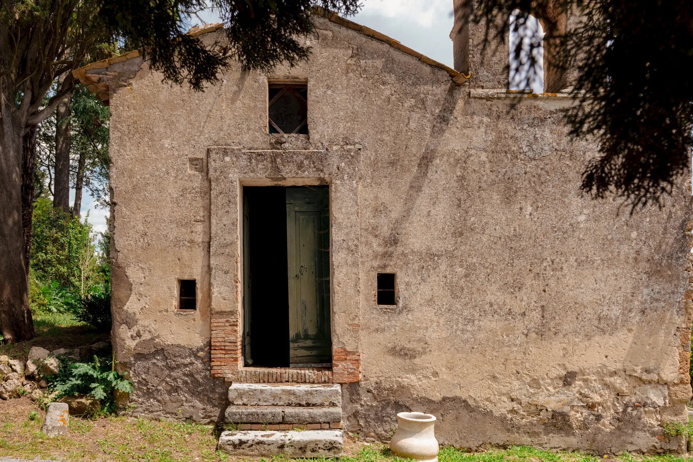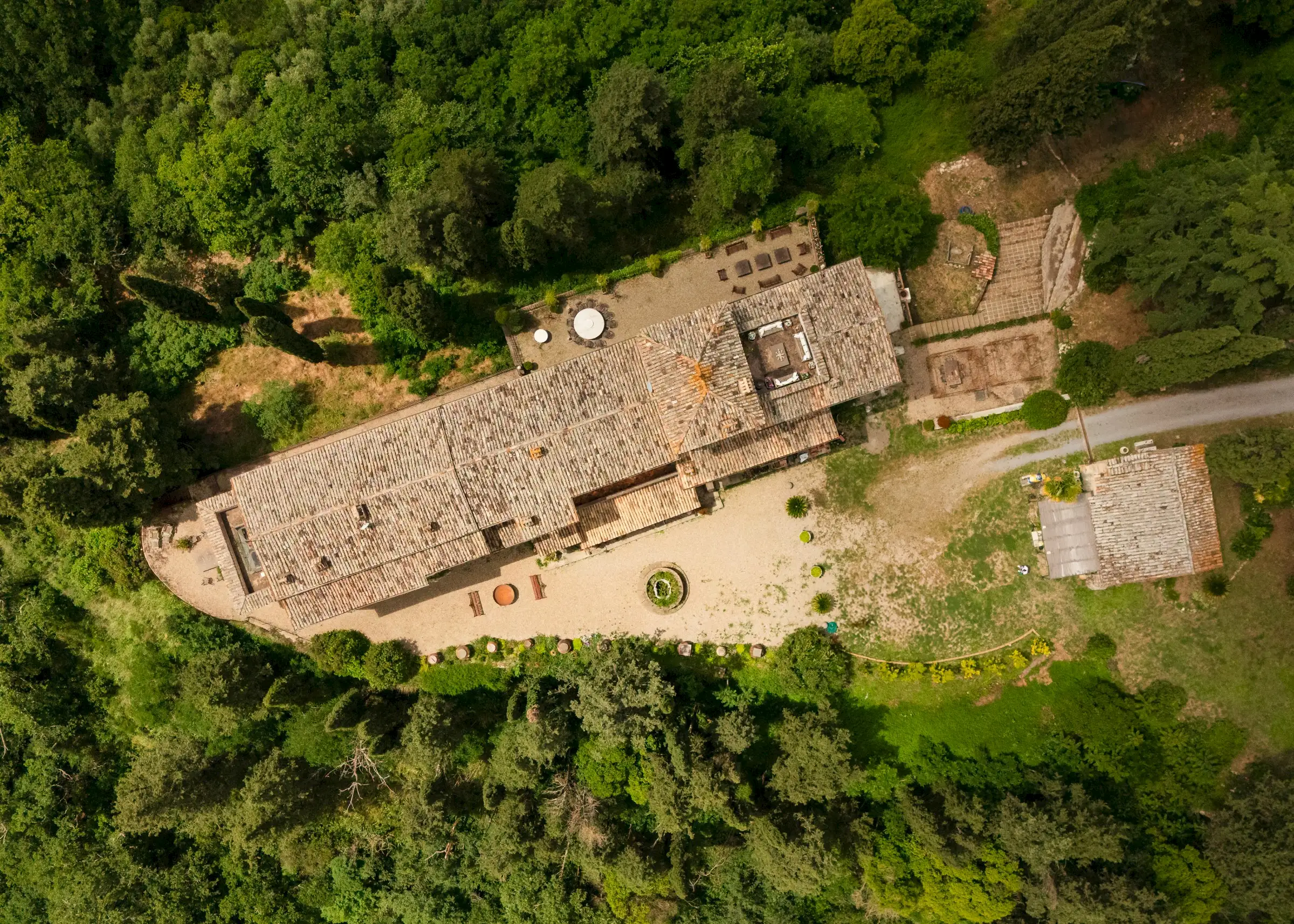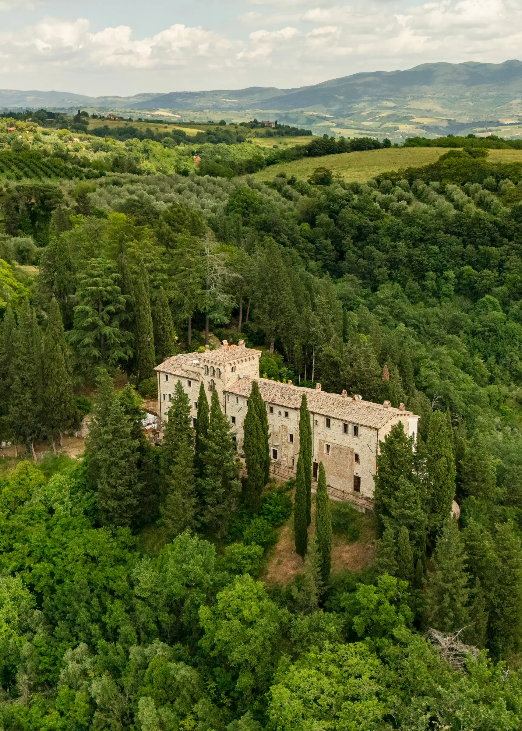 Built on the foundations of an ancient Roman watchtower, reconstructed during the Lombard period (850 AD) and extended in the 12th century, the manor house, including the original tower, spans three floors. Once a medieval military post, it was later transformed into an elegant palazzo. Approached along a cypress‐lined avenue, there’s a small and pretty freestanding chapel opposite the front door to the main house. An elegant, detached farmhouse with a striped façade at the start of the drive is in need of substantial renovation but retains beautiful original features. Four natural caves carved into the rock, one housing the old mill and another the original cellar, complete the estate.
