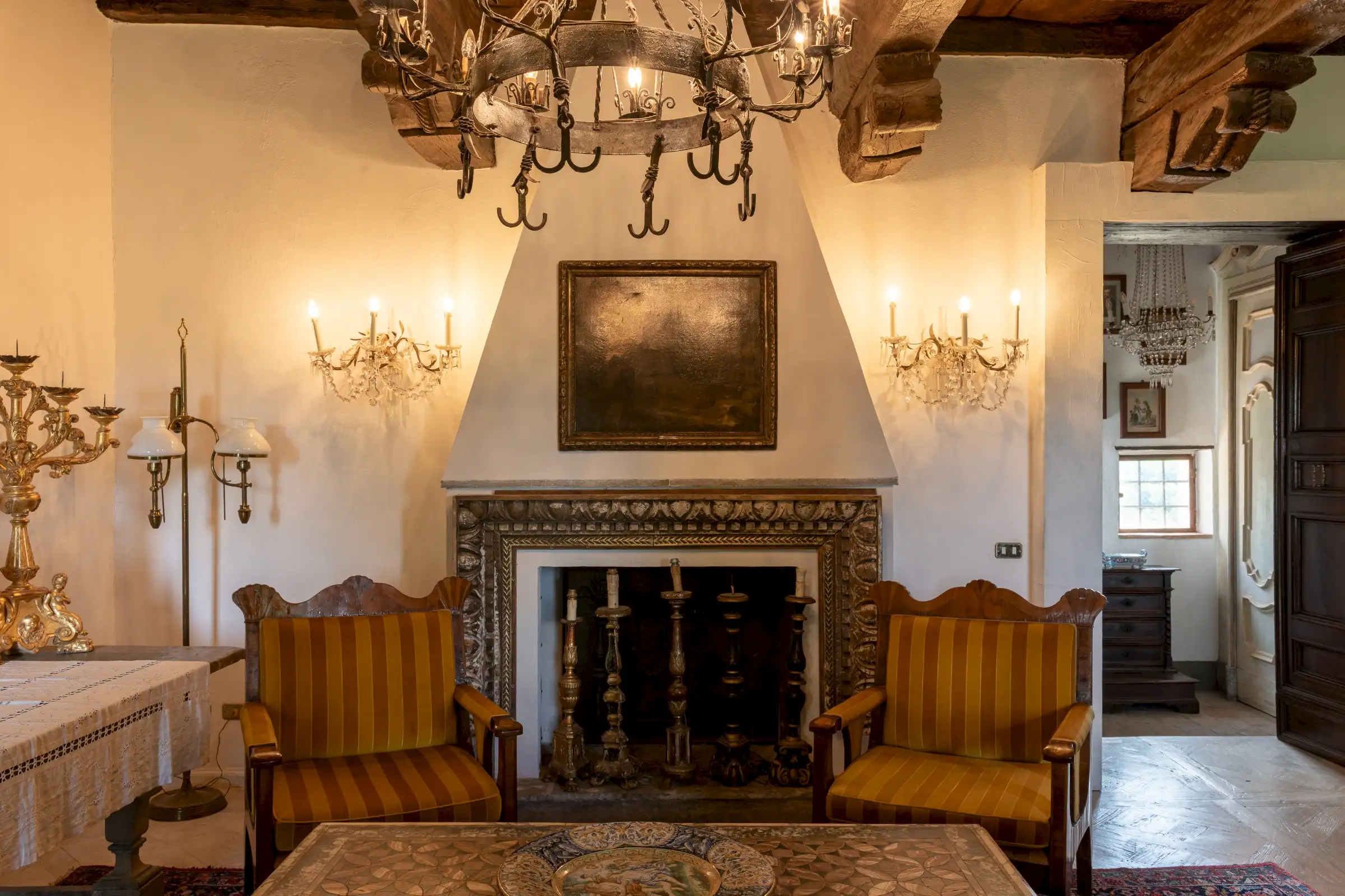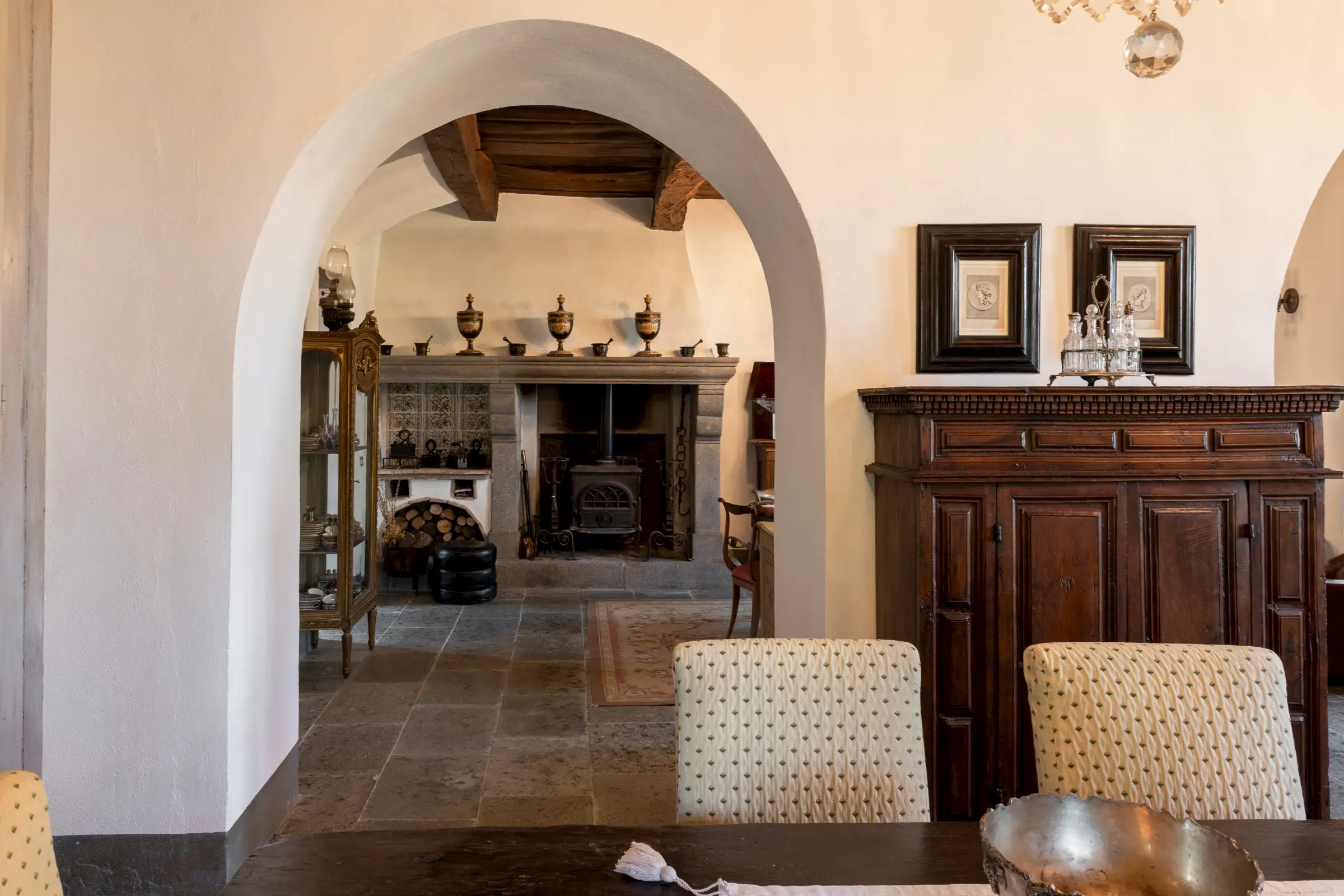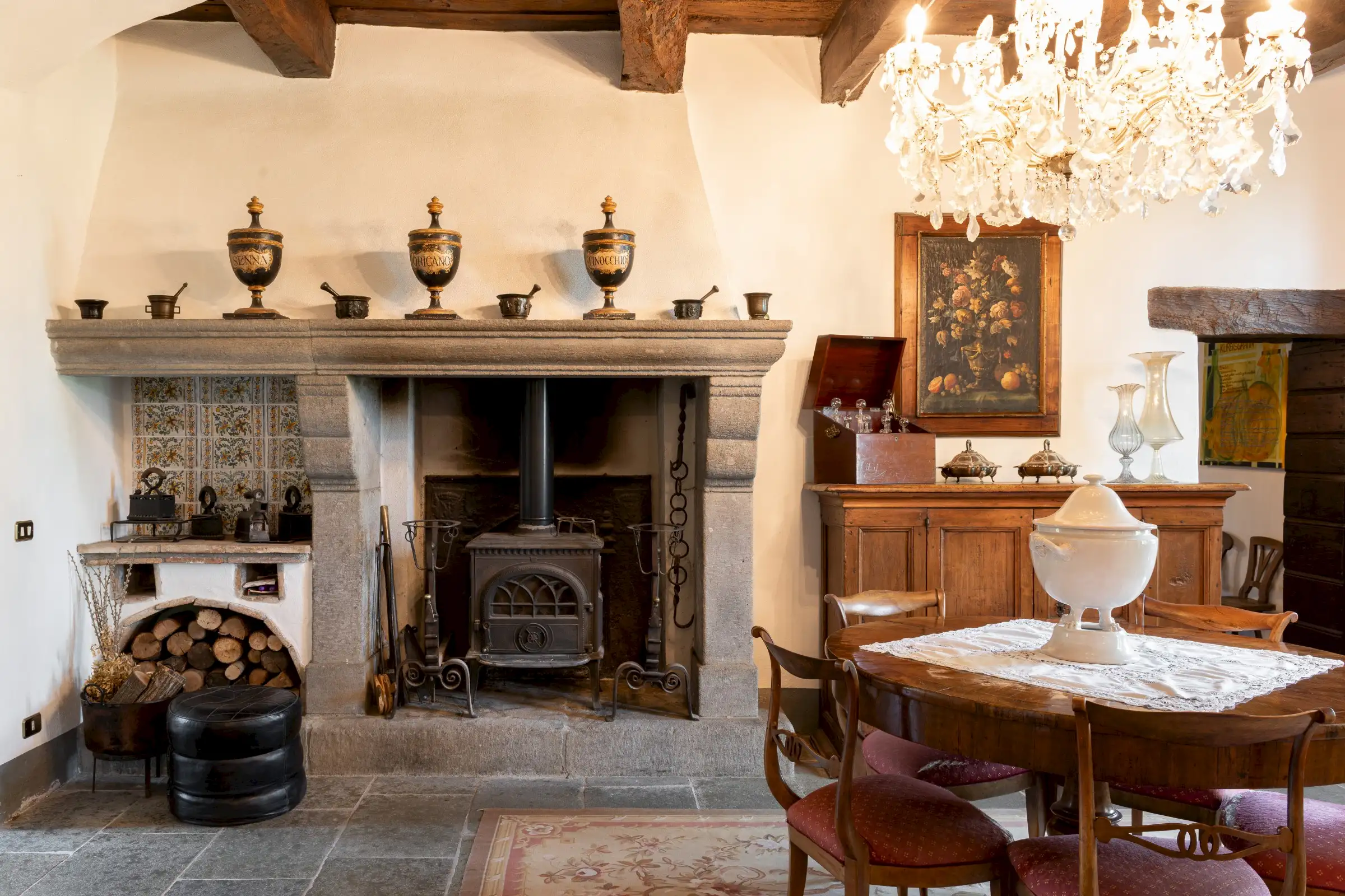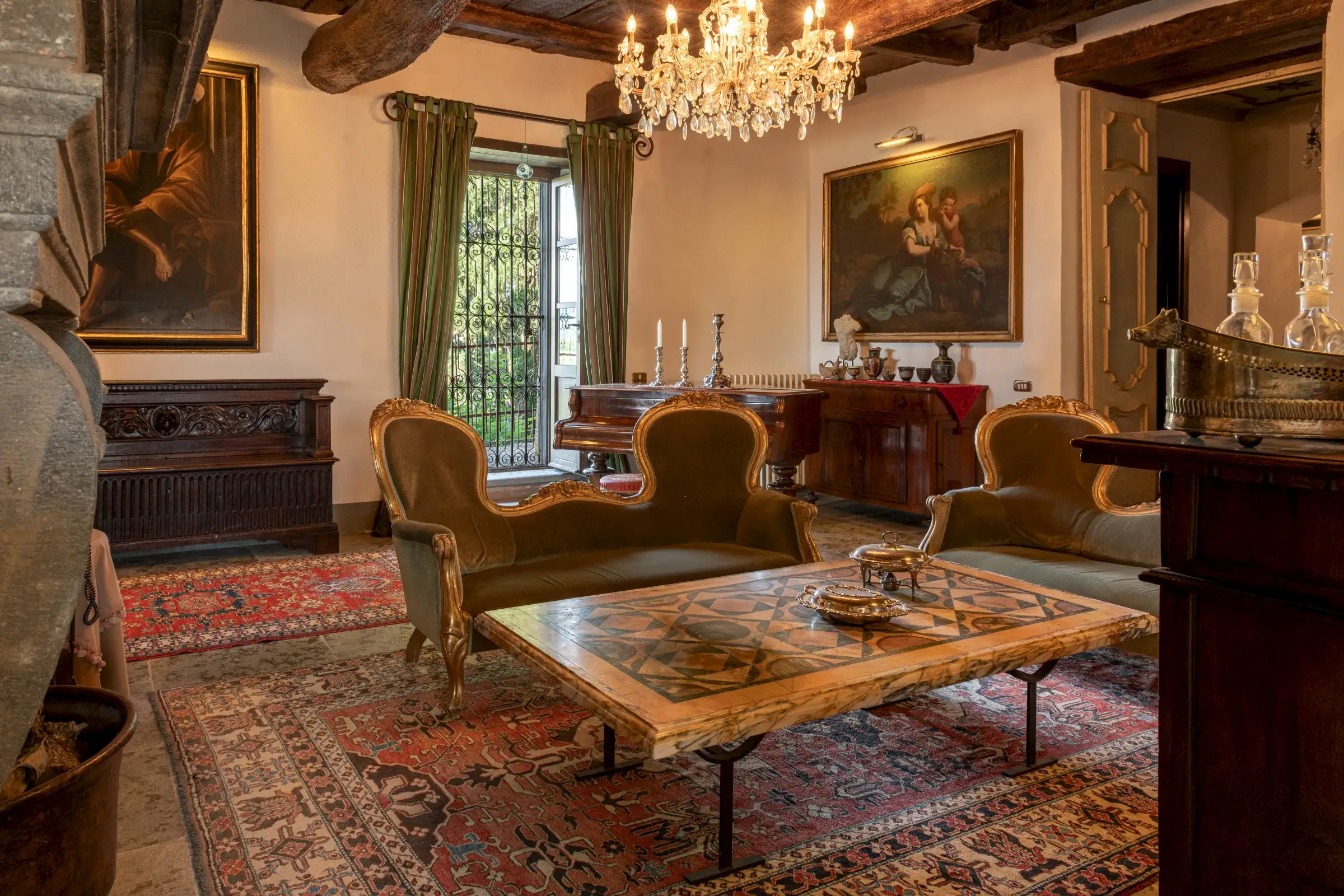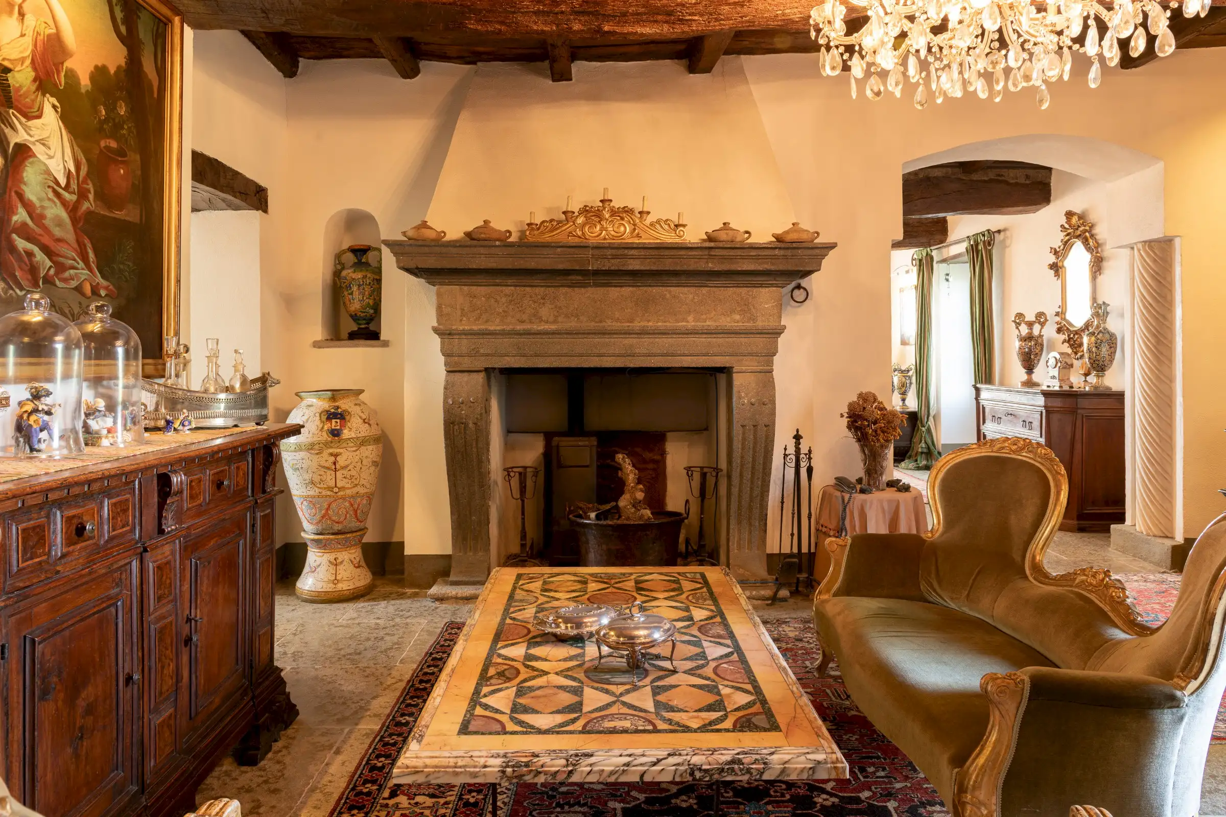 The estate marries traditional character with contemporary comfort: there are six gas boilers (two per floor), an antique wood-burning stove, and six working fireplaces. Every door, coffered wooden ceiling, and terracotta tile is authentic, while fitted wardrobes incorporate genuine 16th- and 17th-century cabinetry. Flooring varies by room—basalt stone on the ground floor (with terracotta tiles in the TV room, larder, and one winter garden salon), antique parquet on the first floor (with stone-tiled baths), and a mix of all three on the top floor and in the tower—underscoring the property’s timeless elegance.
