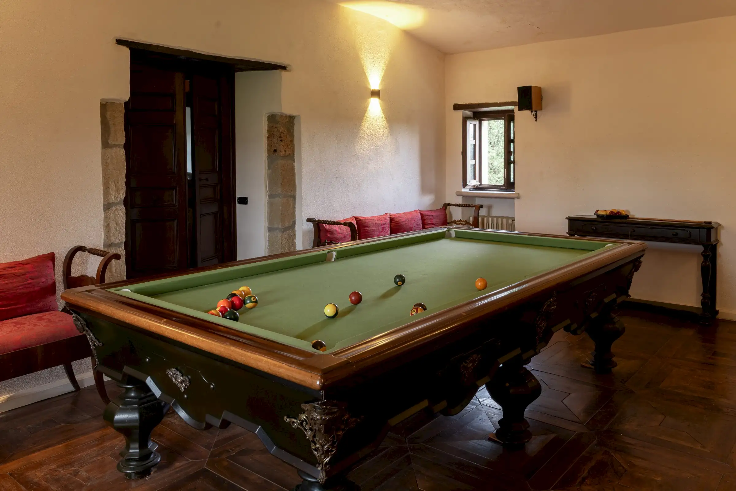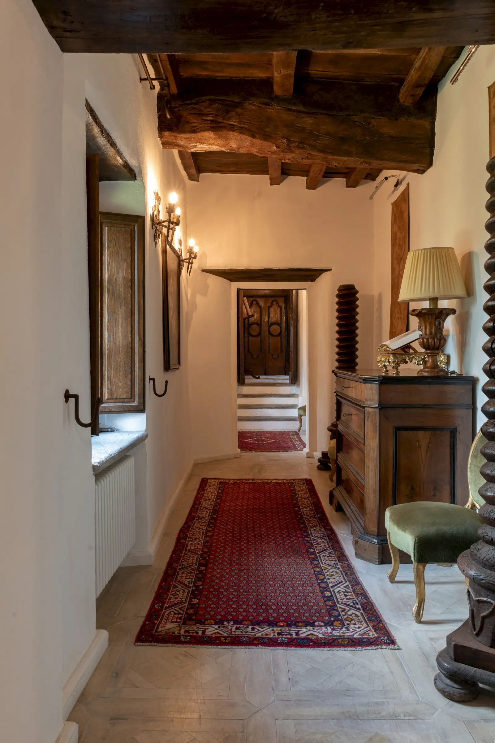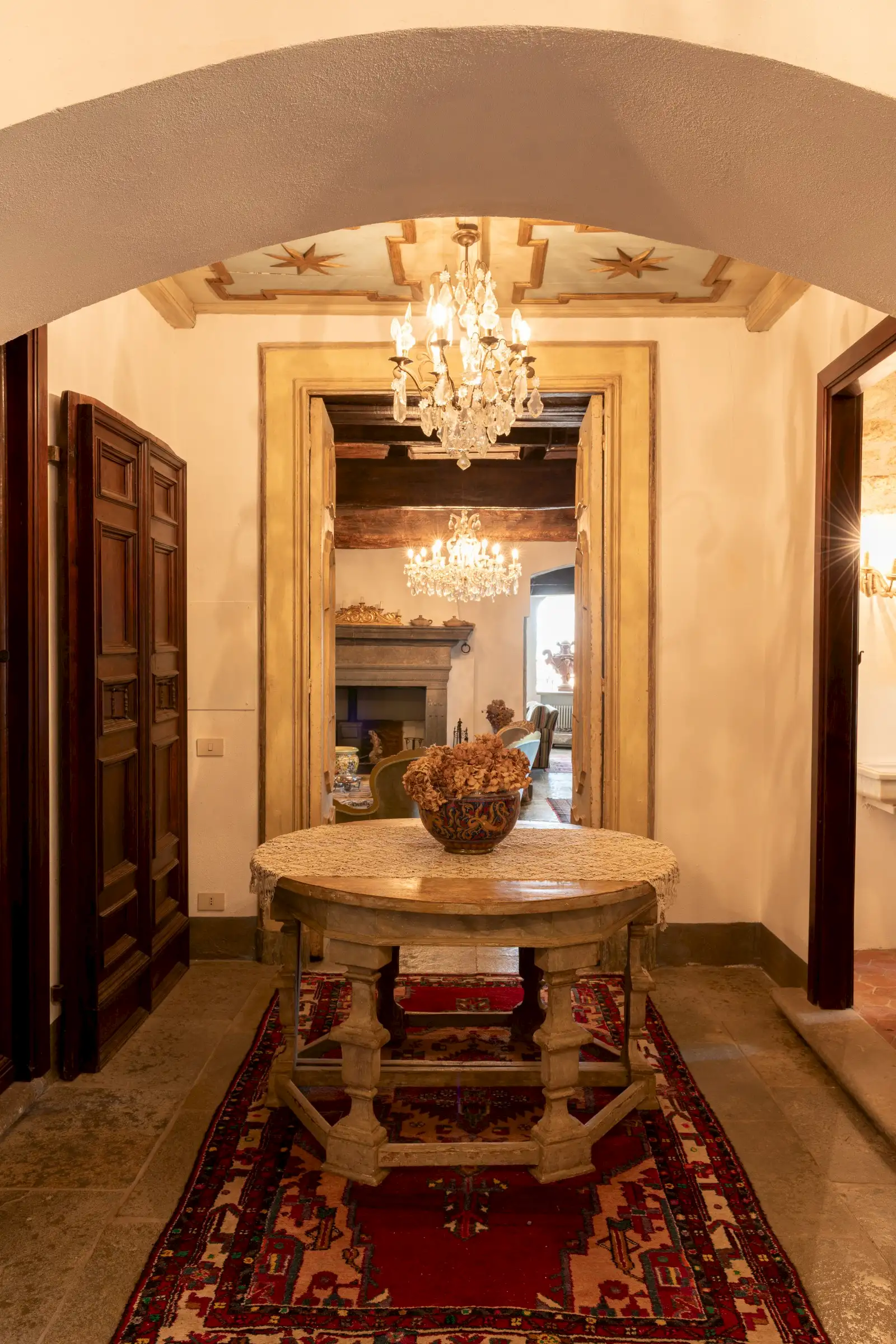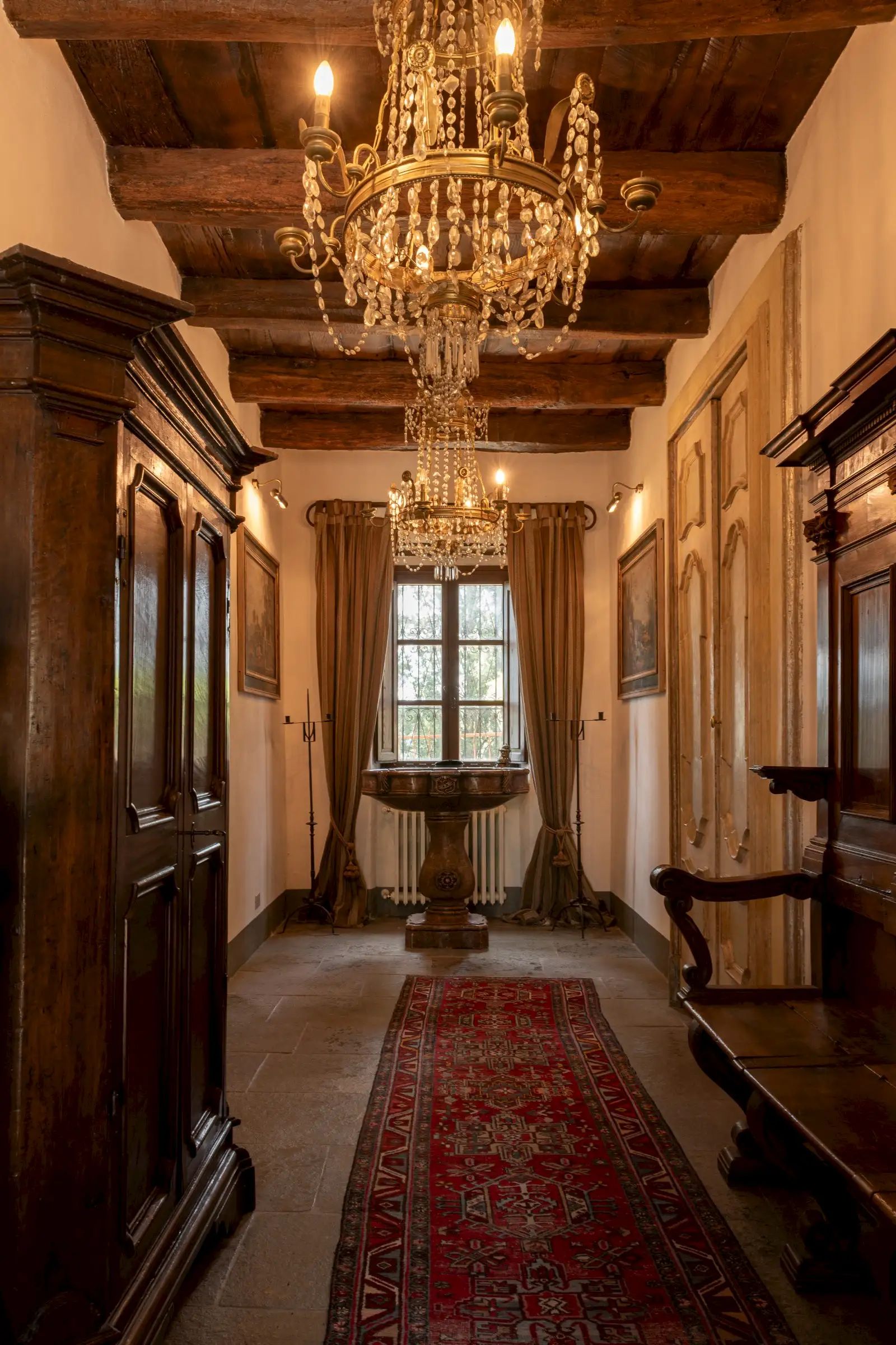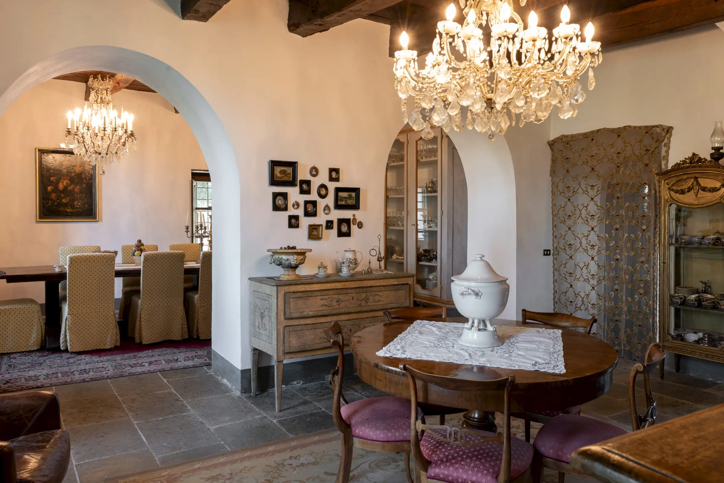 The estate marries traditional character with contemporary comfort: there are six gas boilers (two per floor), an antique wood-burning stove, and six working fireplaces. Every door, coffered wooden ceiling, and terracotta tile is authentic, while fitted wardrobes incorporate genuine 16th- and 17th-century cabinetry. Flooring varies by room—basalt stone on the ground floor (with terracotta tiles in the TV room, larder, and one winter garden salon), antique parquet on the first floor (with stone-tiled baths), and a mix of all three on the top floor and in the tower—underscoring the property’s timeless elegance.