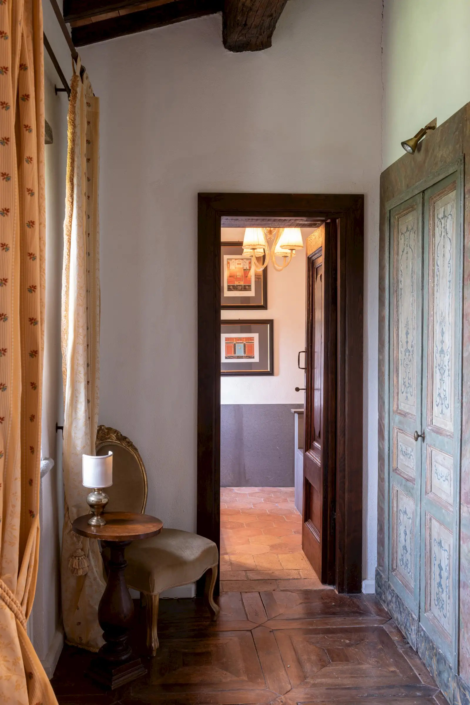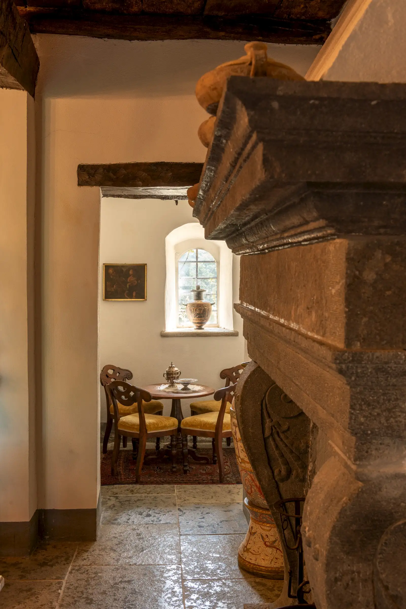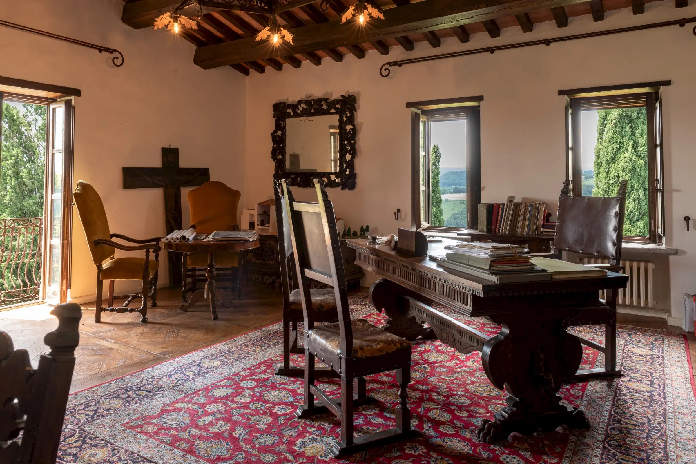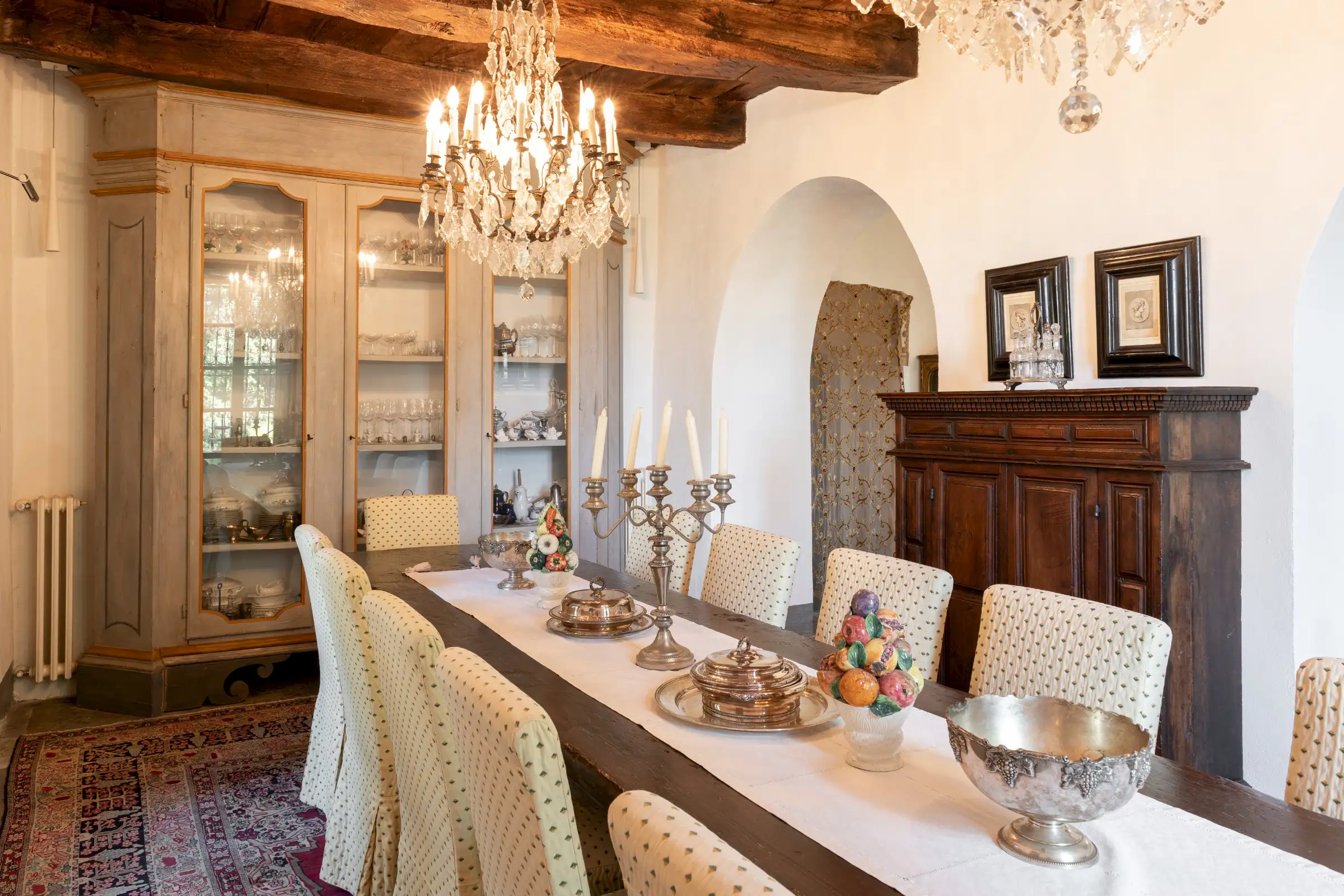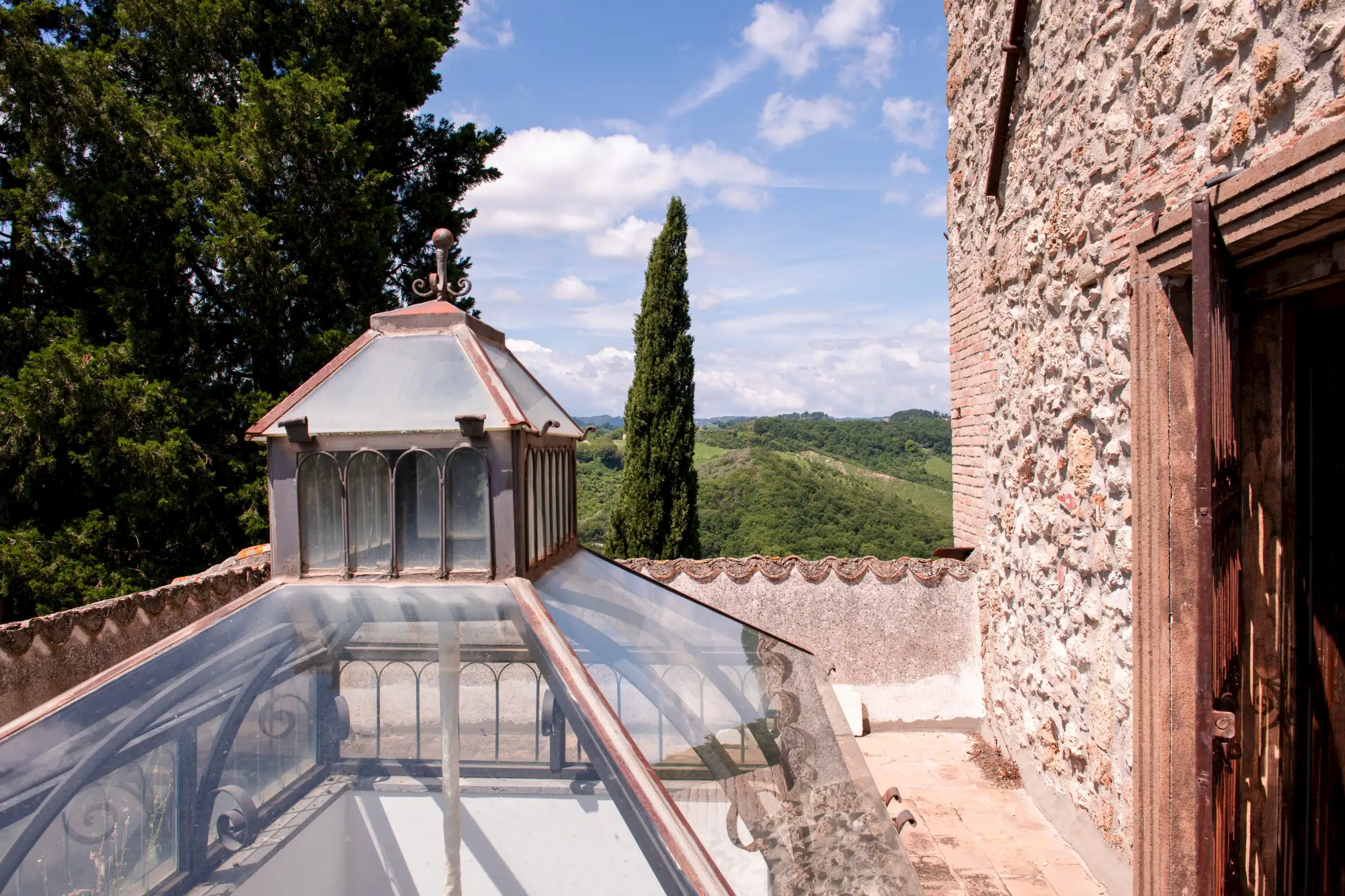 The estate marries traditional character with contemporary comfort: there are six gas boilers (two per floor), an antique wood-burning stove, and six working fireplaces. Every door, coffered wooden ceiling, and terracotta tile is authentic, while fitted wardrobes incorporate genuine 16th- and 17th-century cabinetry. Flooring varies by room—basalt stone on the ground floor (with terracotta tiles in the TV room, larder, and one winter garden salon), antique parquet on the first floor (with stone-tiled baths), and a mix of all three on the top floor and in the tower—underscoring the property’s timeless elegance.