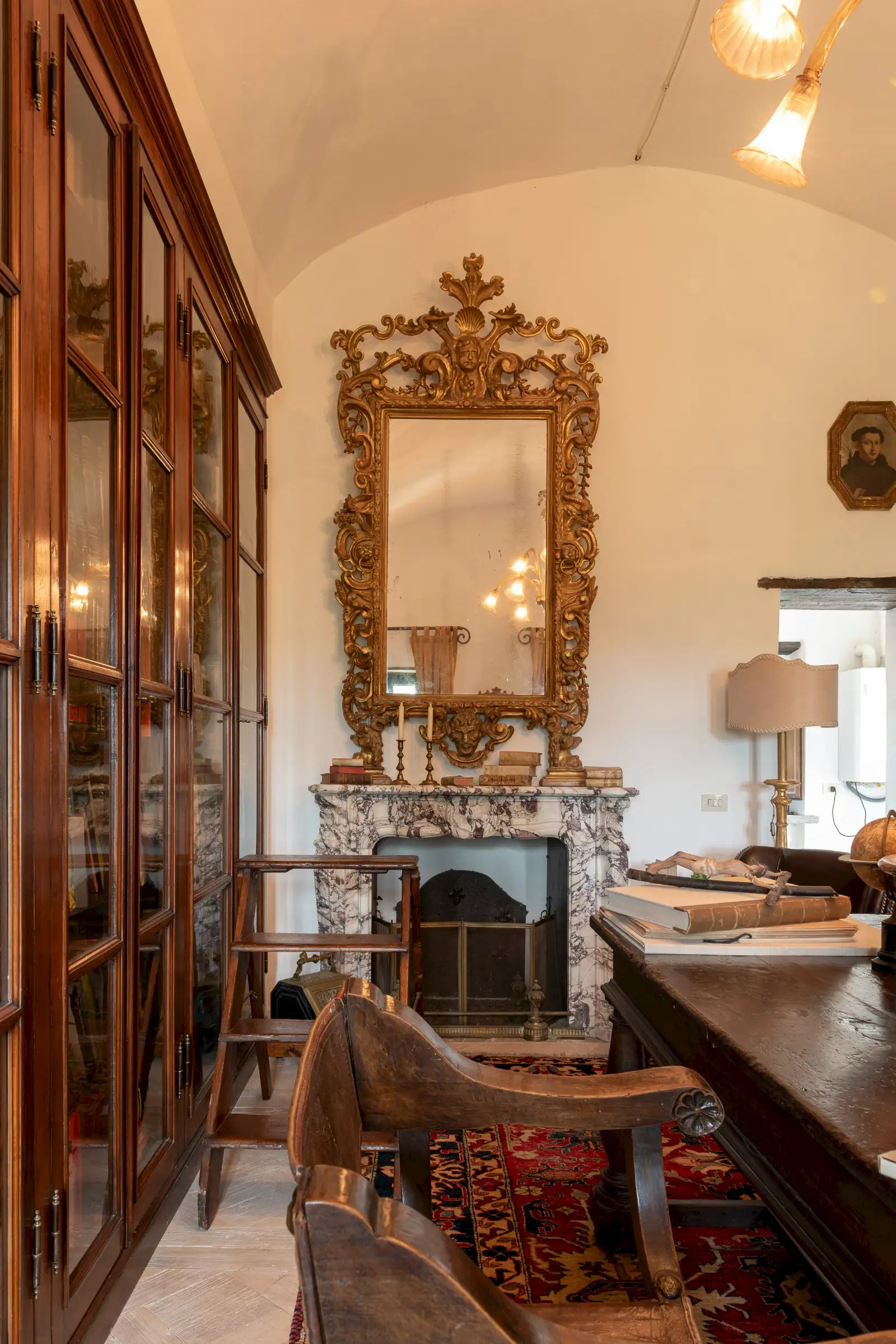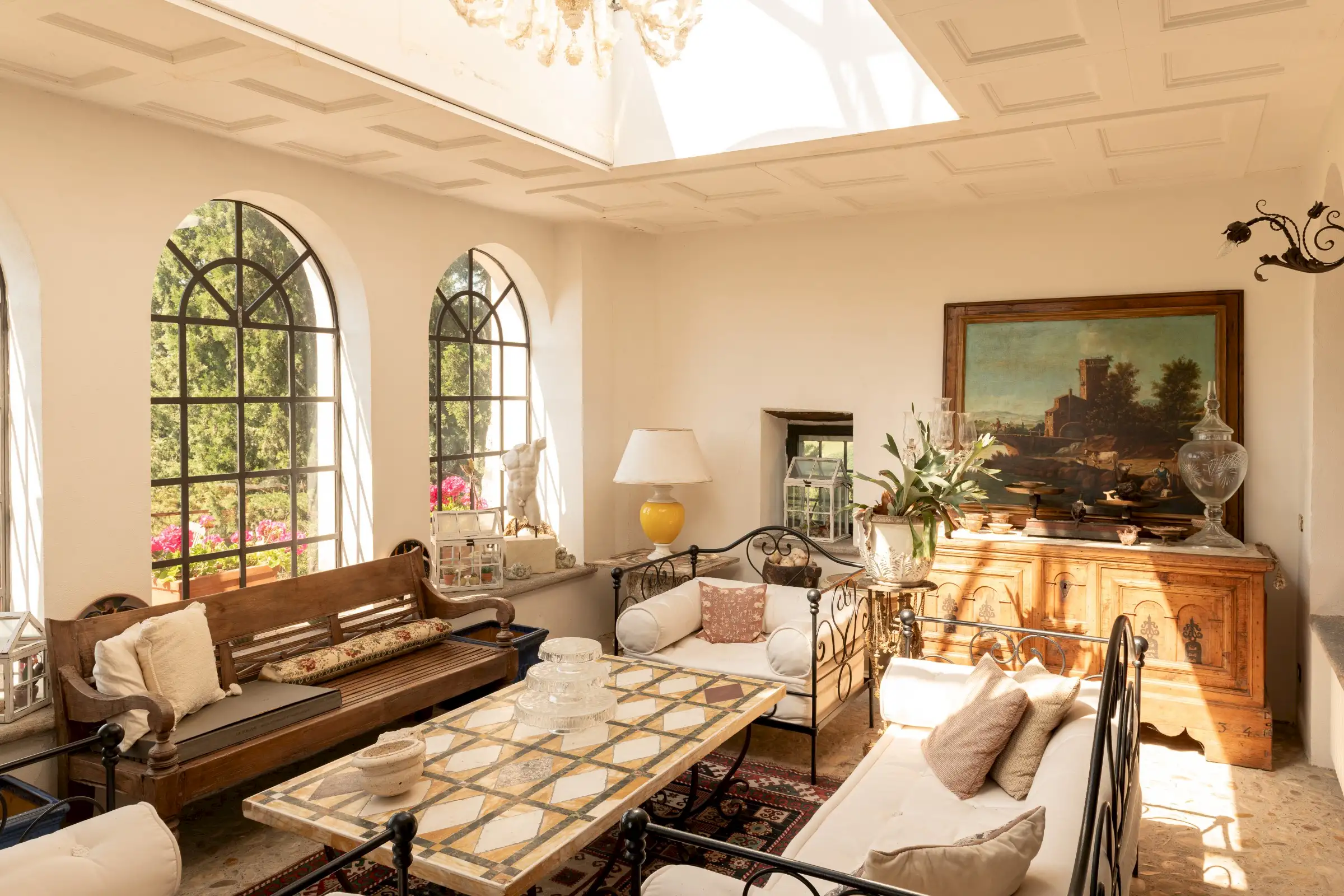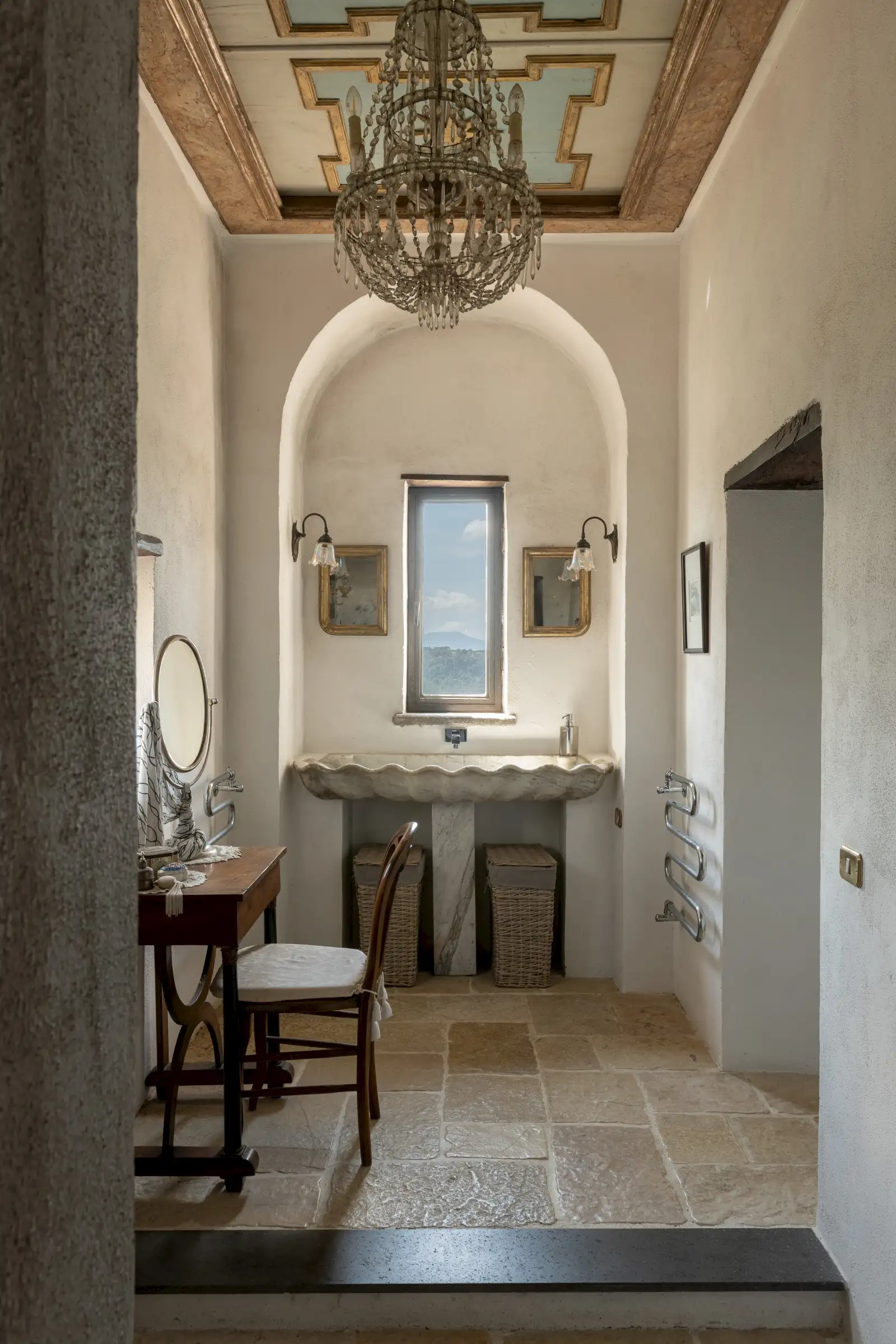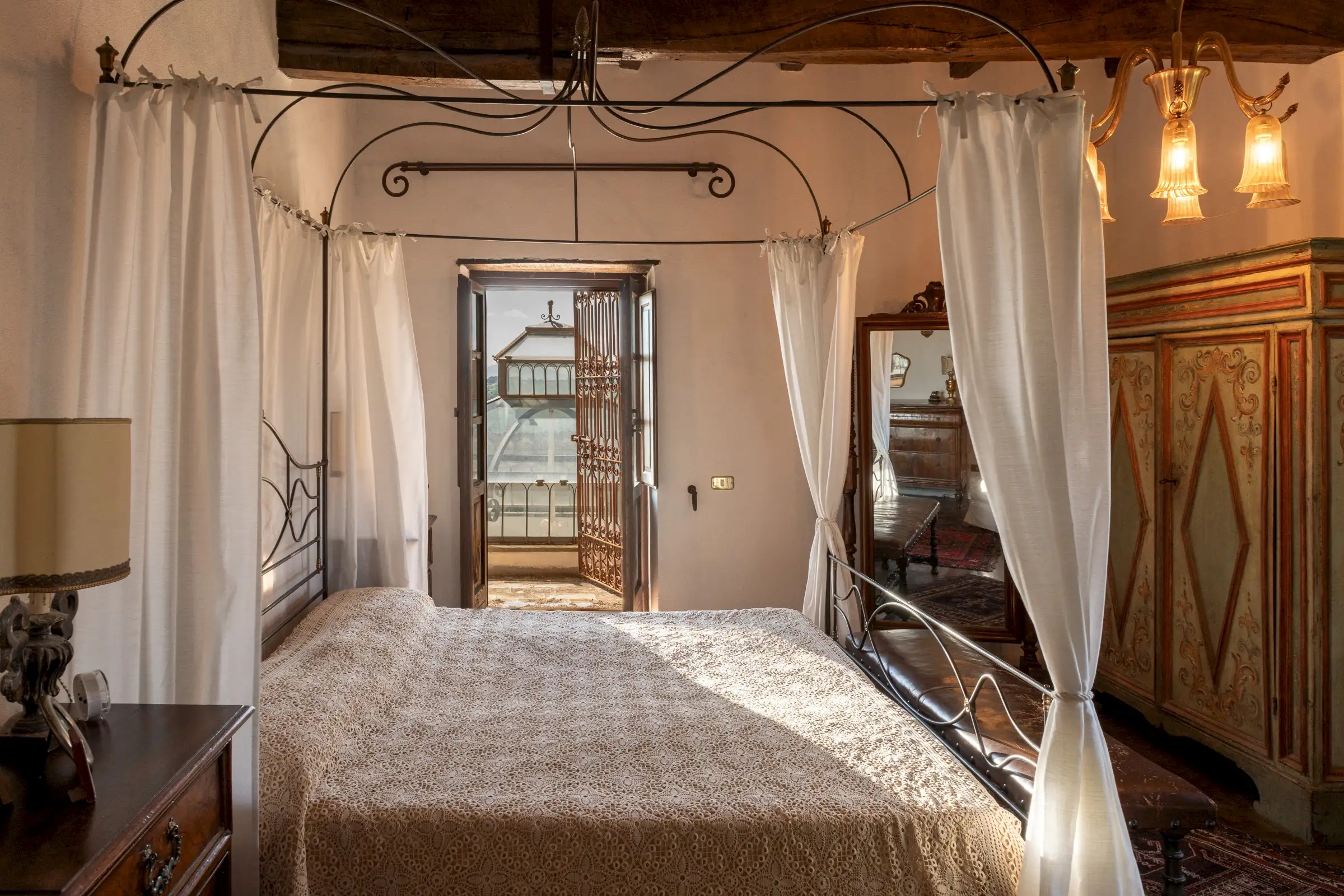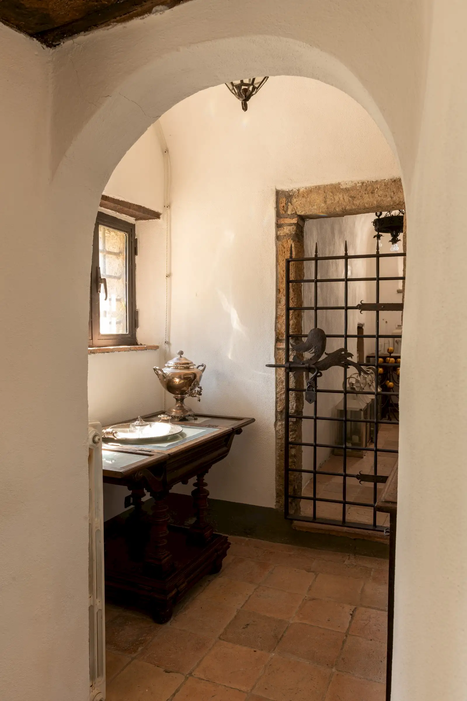 The estate marries traditional character with contemporary comfort: there are six gas boilers (two per floor), an antique wood-burning stove, and six working fireplaces. Every door, coffered wooden ceiling, and terracotta tile is authentic, while fitted wardrobes incorporate genuine 16th- and 17th-century cabinetry. Flooring varies by room—basalt stone on the ground floor (with terracotta tiles in the TV room, larder, and one winter garden salon), antique parquet on the first floor (with stone-tiled baths), and a mix of all three on the top floor and in the tower—underscoring the property’s timeless elegance.