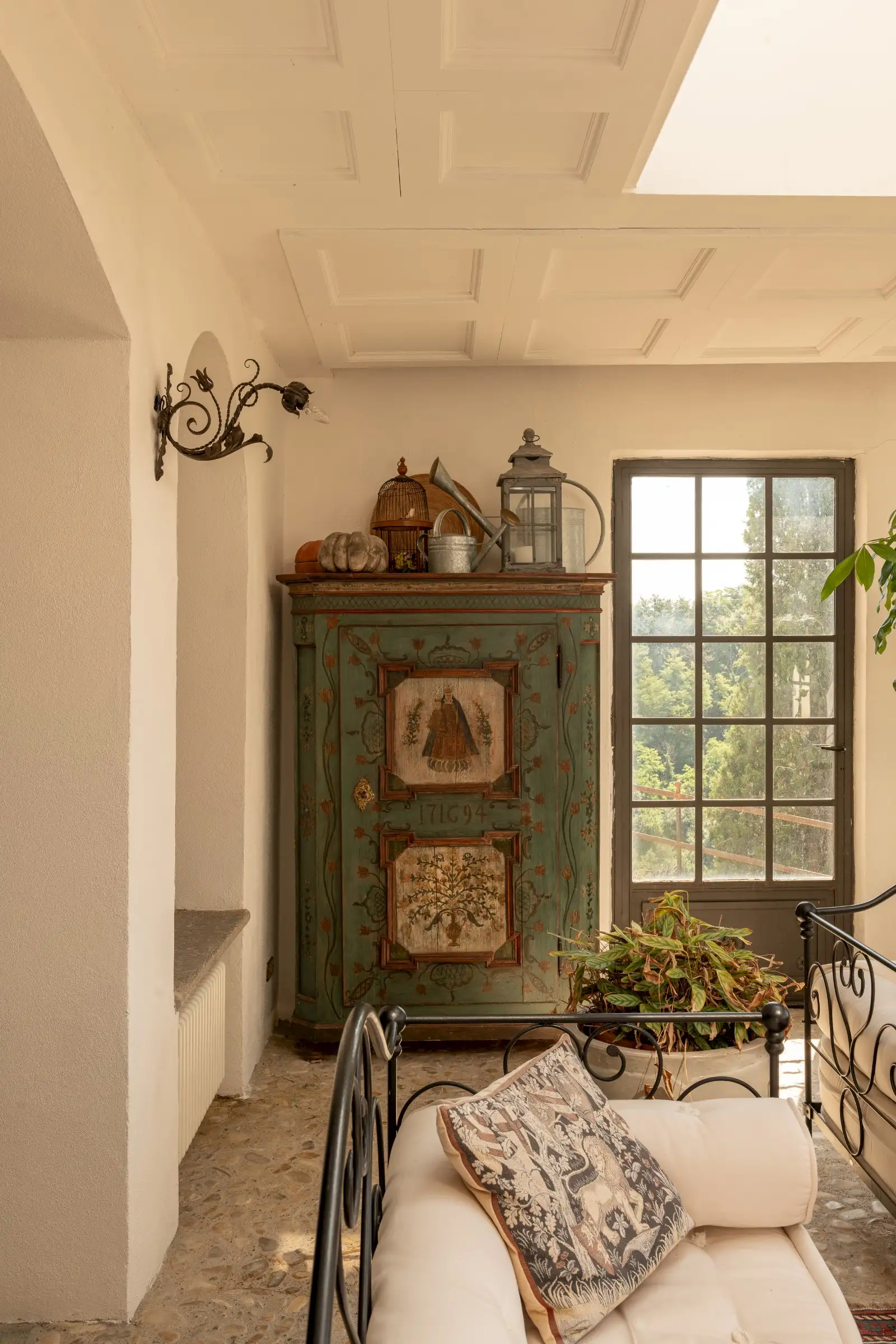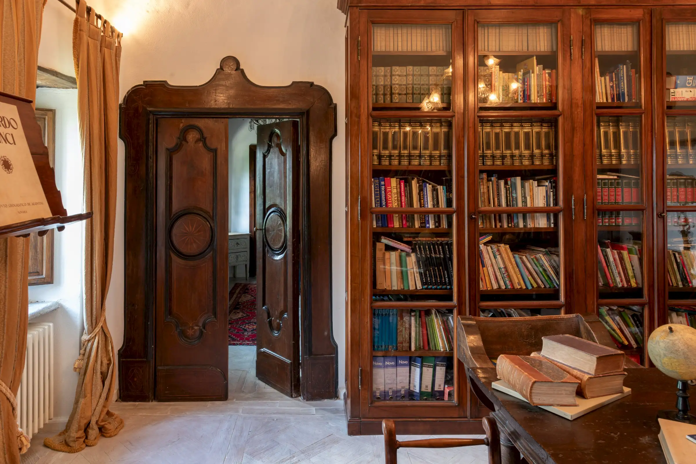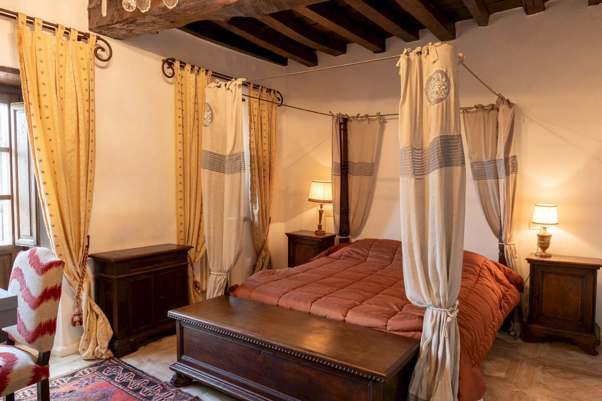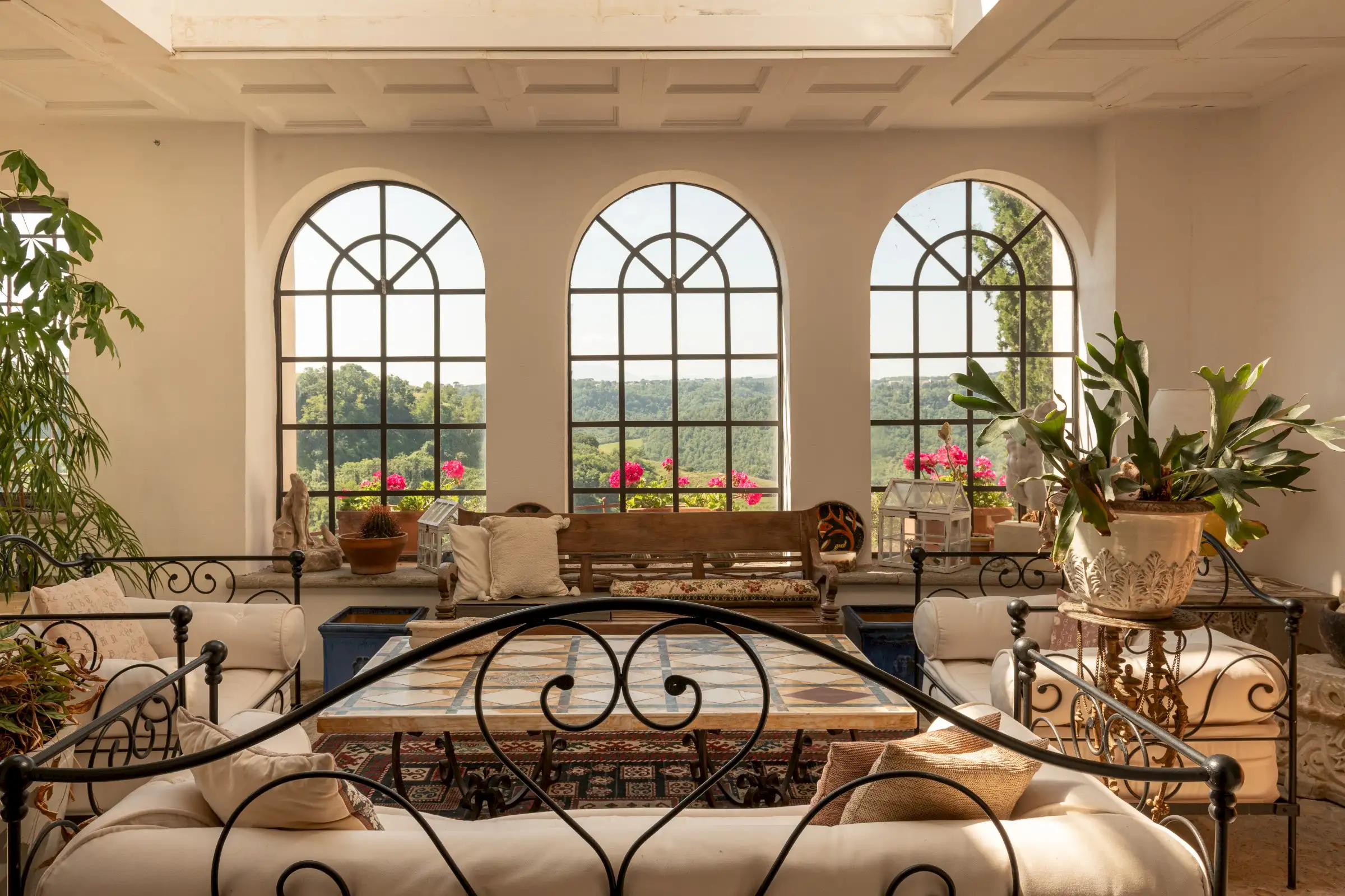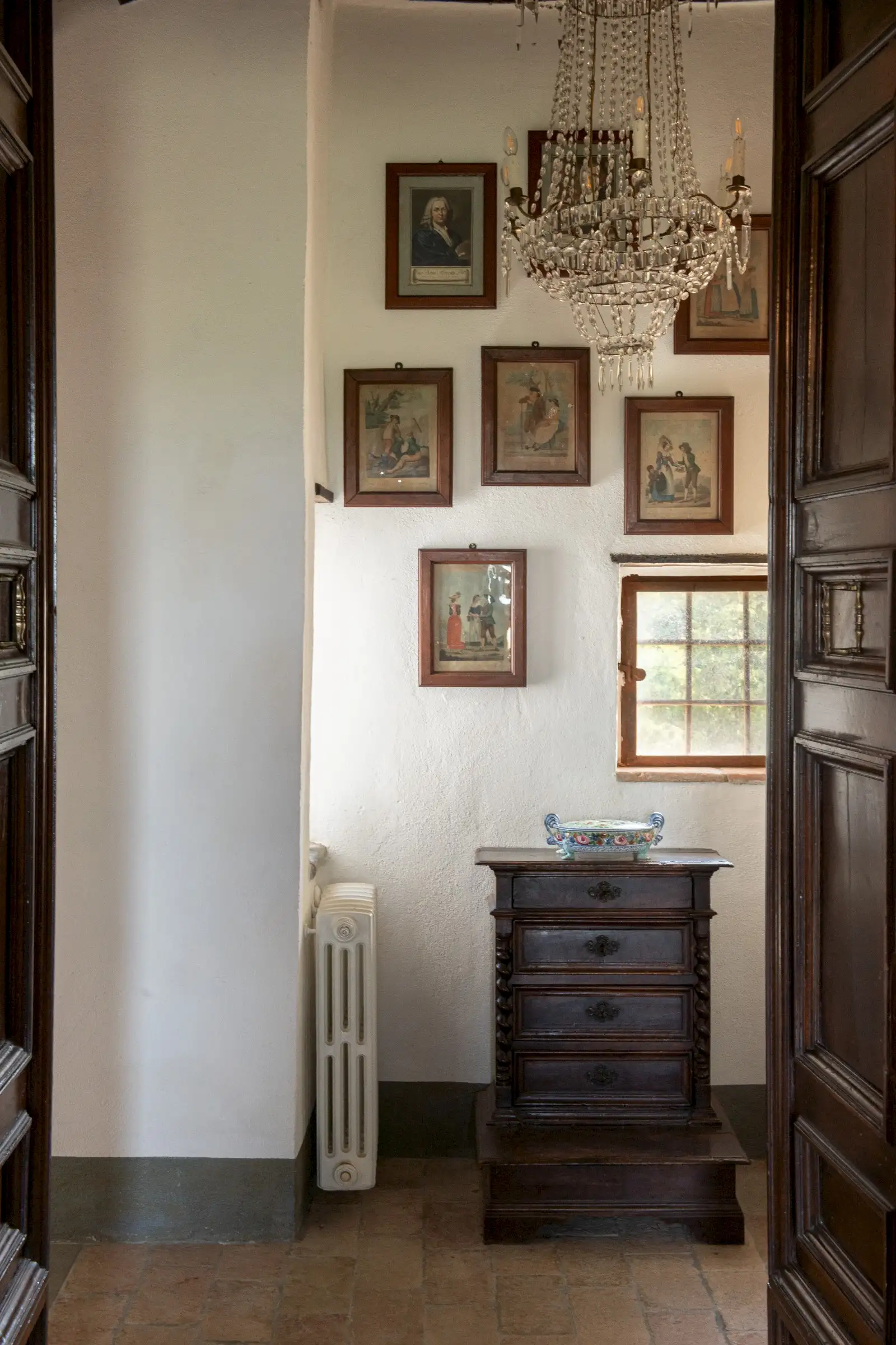 The estate marries traditional character with contemporary comfort: there are six gas boilers (two per floor), an antique wood-burning stove, and six working fireplaces. Every door, coffered wooden ceiling, and terracotta tile is authentic, while fitted wardrobes incorporate genuine 16th- and 17th-century cabinetry. Flooring varies by room—basalt stone on the ground floor (with terracotta tiles in the TV room, larder, and one winter garden salon), antique parquet on the first floor (with stone-tiled baths), and a mix of all three on the top floor and in the tower—underscoring the property’s timeless elegance.