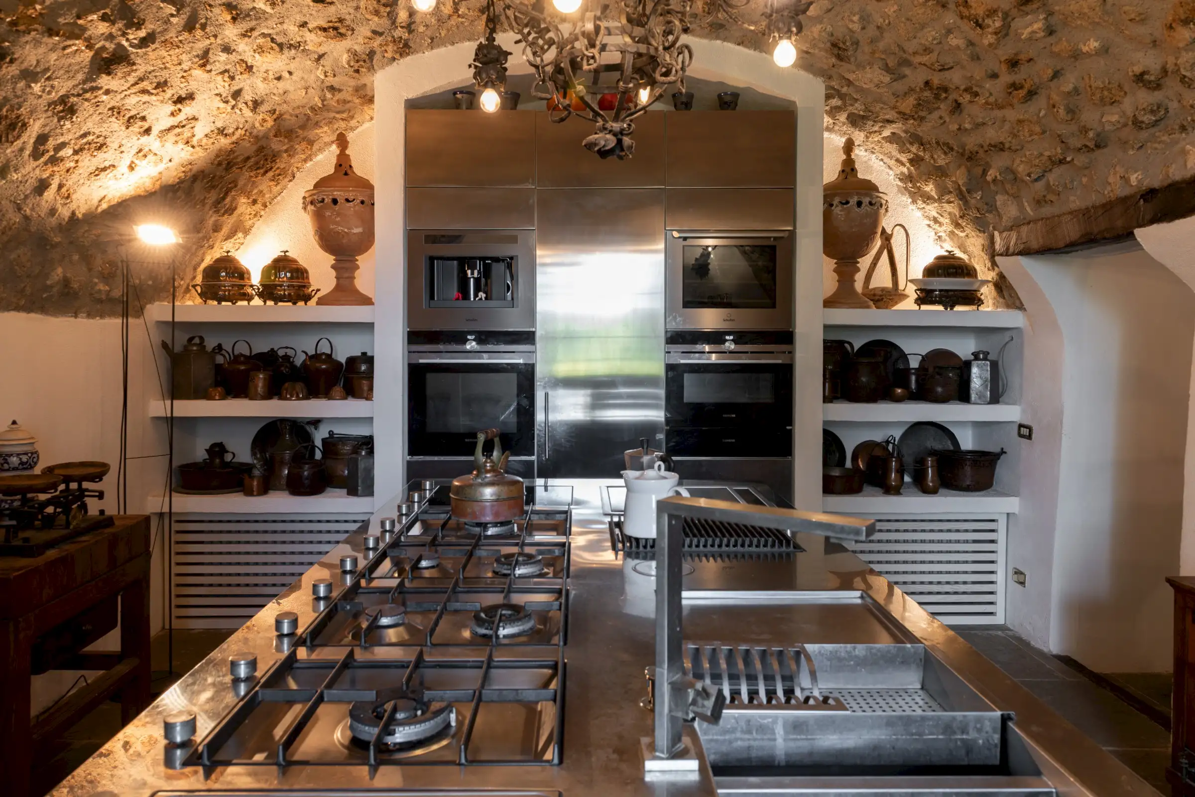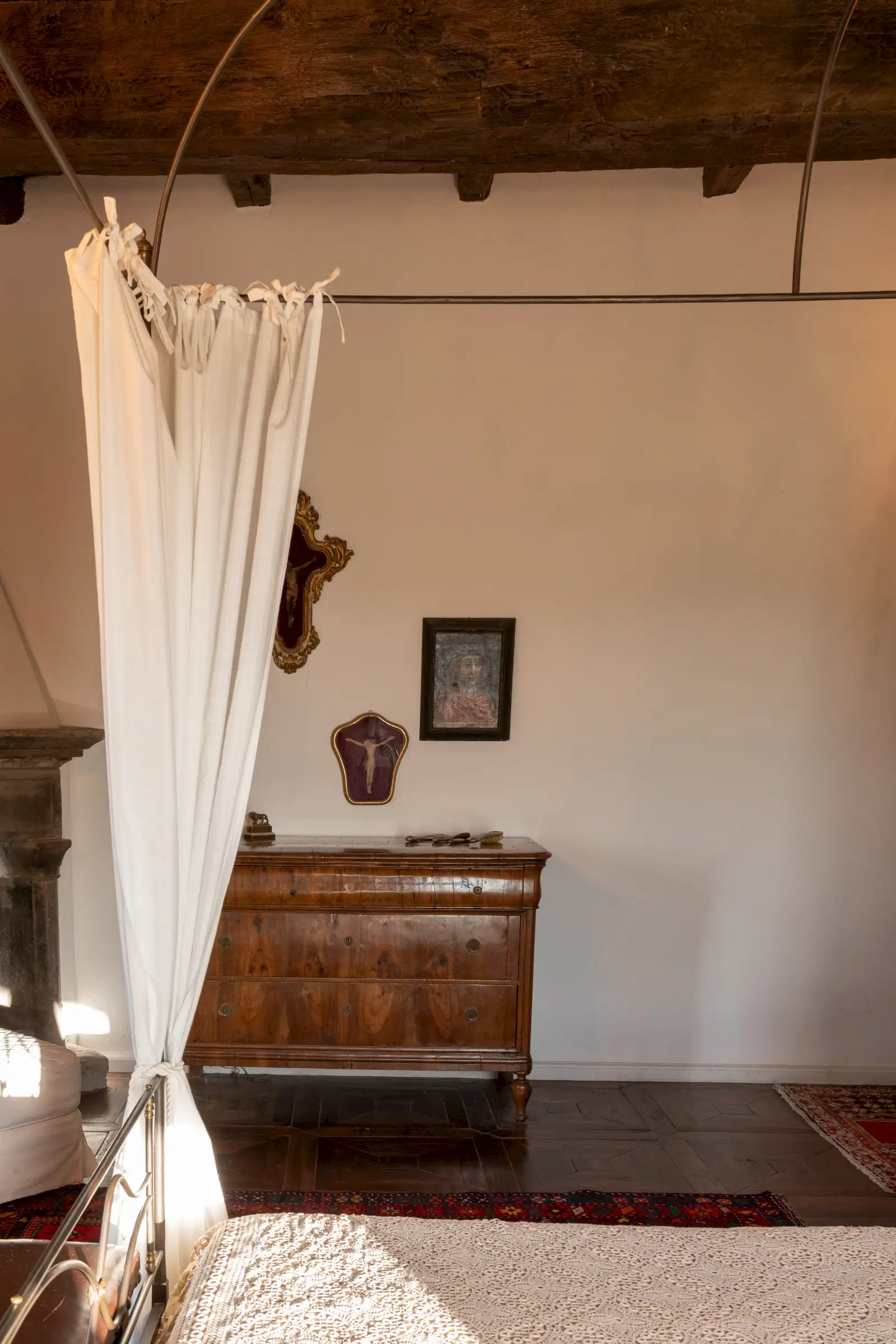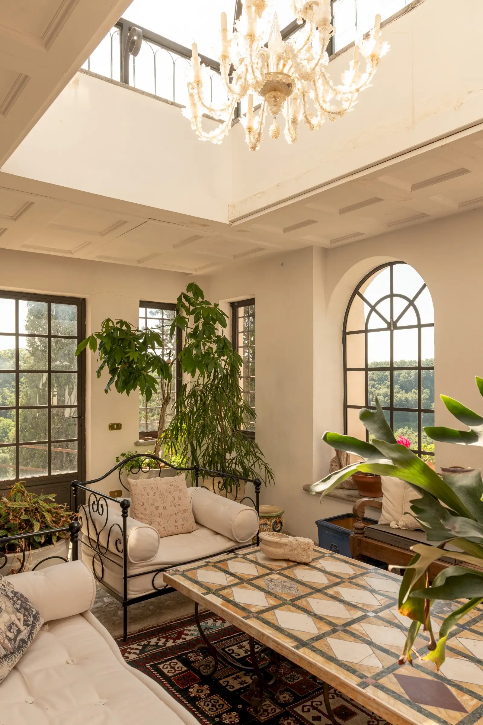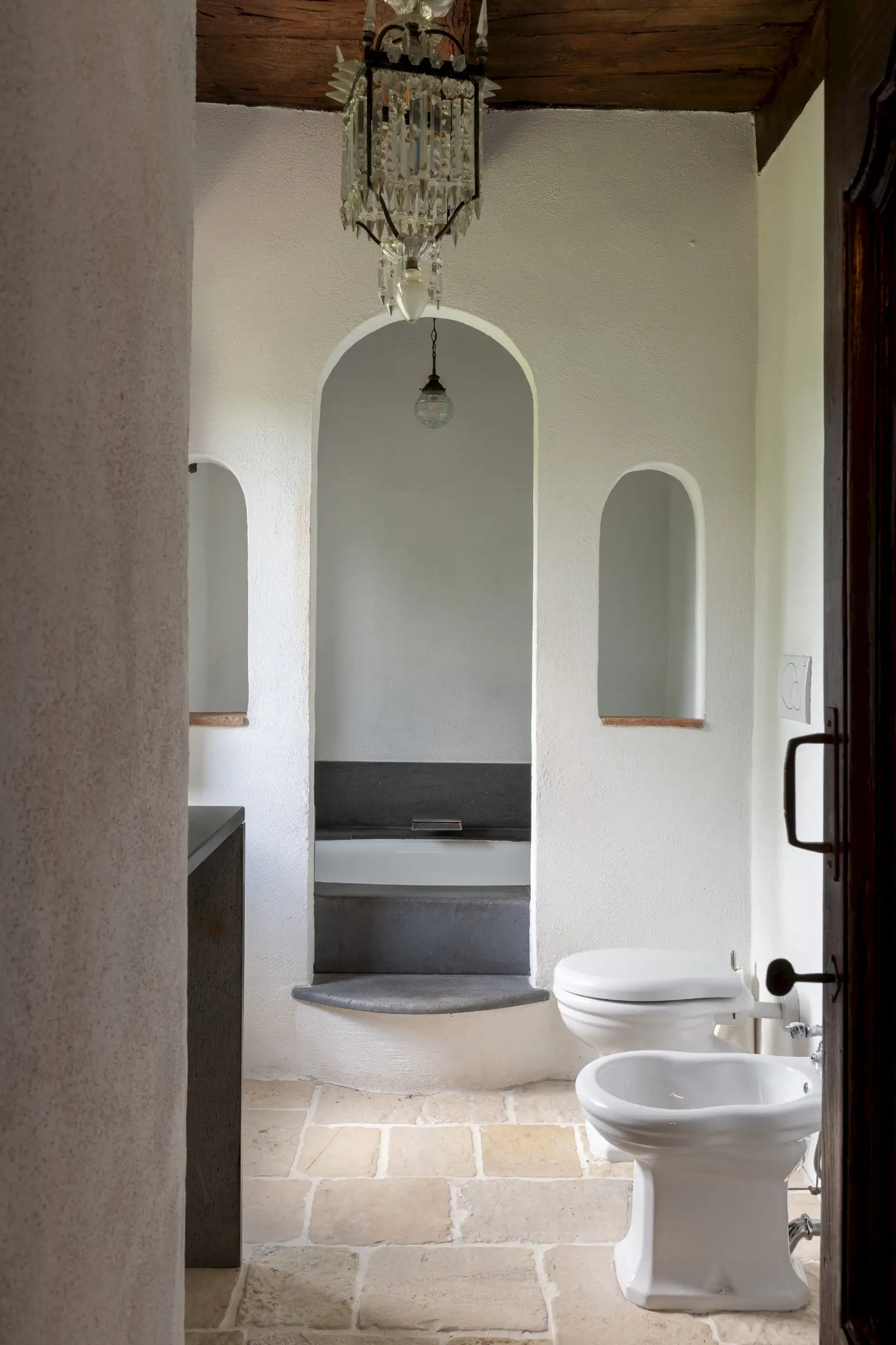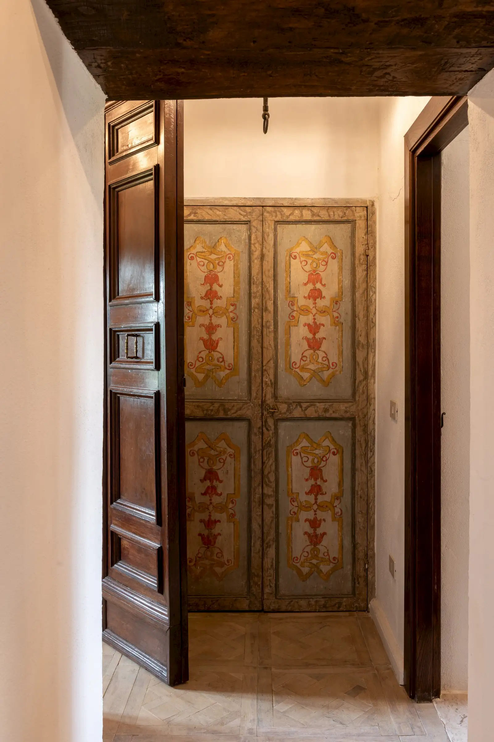 The estate marries traditional character with contemporary comfort: there are six gas boilers (two per floor), an antique wood-burning stove, and six working fireplaces. Every door, coffered wooden ceiling, and terracotta tile is authentic, while fitted wardrobes incorporate genuine 16th- and 17th-century cabinetry. Flooring varies by room—basalt stone on the ground floor (with terracotta tiles in the TV room, larder, and one winter garden salon), antique parquet on the first floor (with stone-tiled baths), and a mix of all three on the top floor and in the tower—underscoring the property’s timeless elegance.