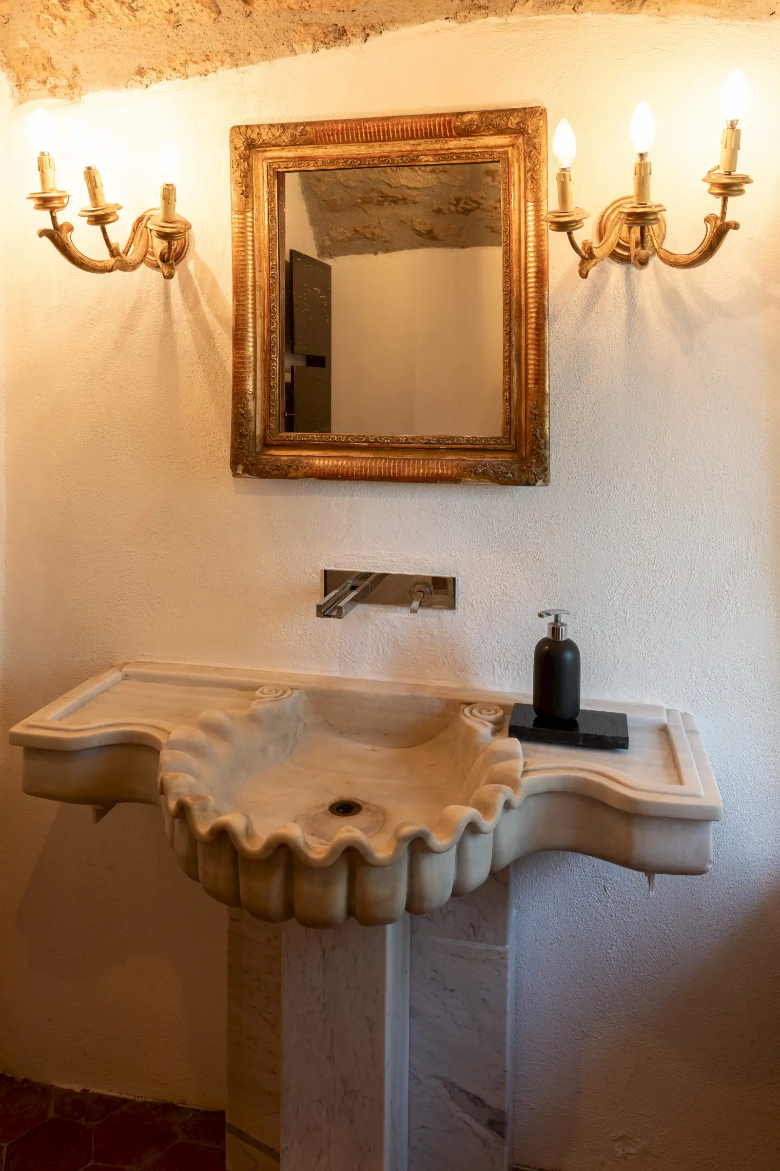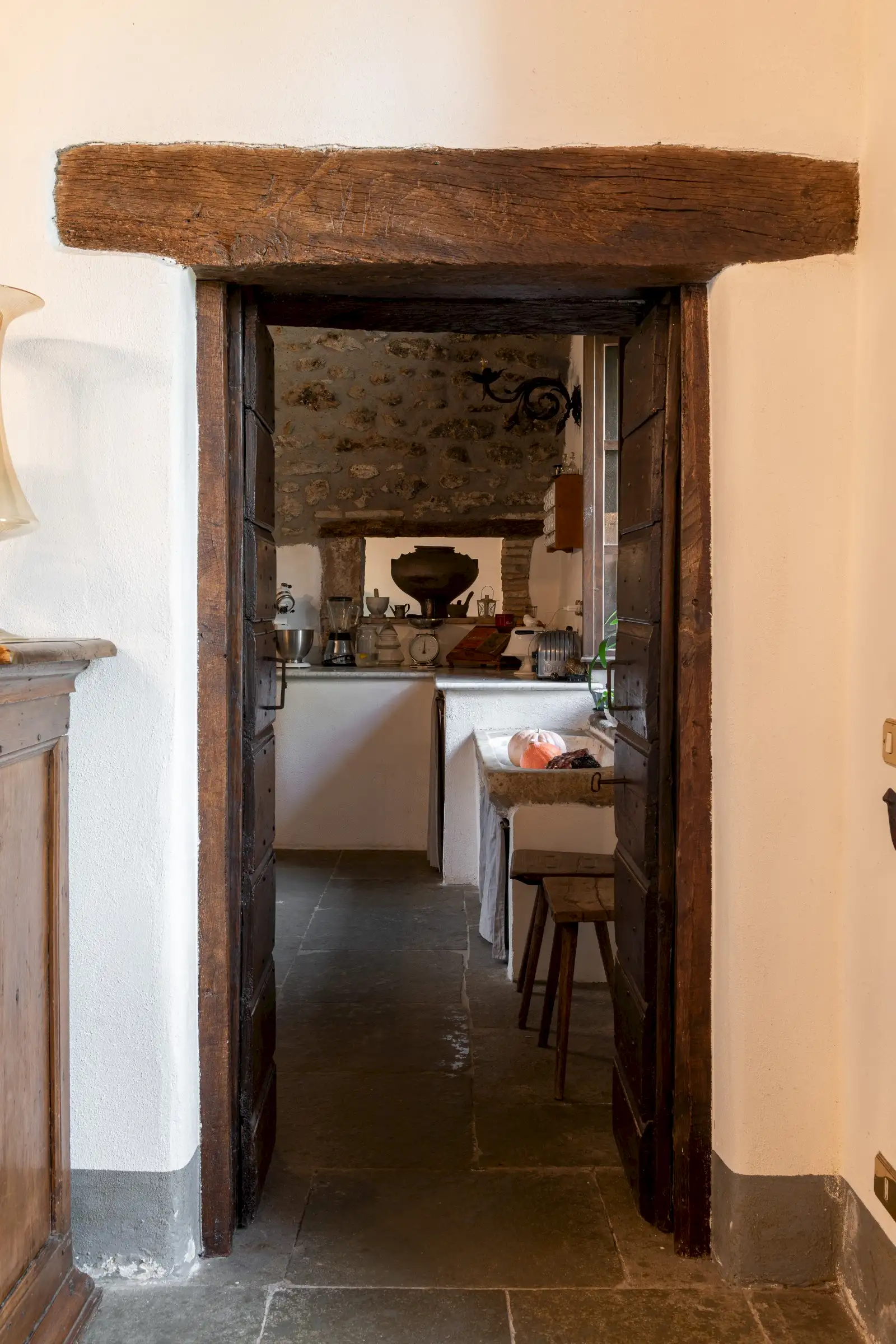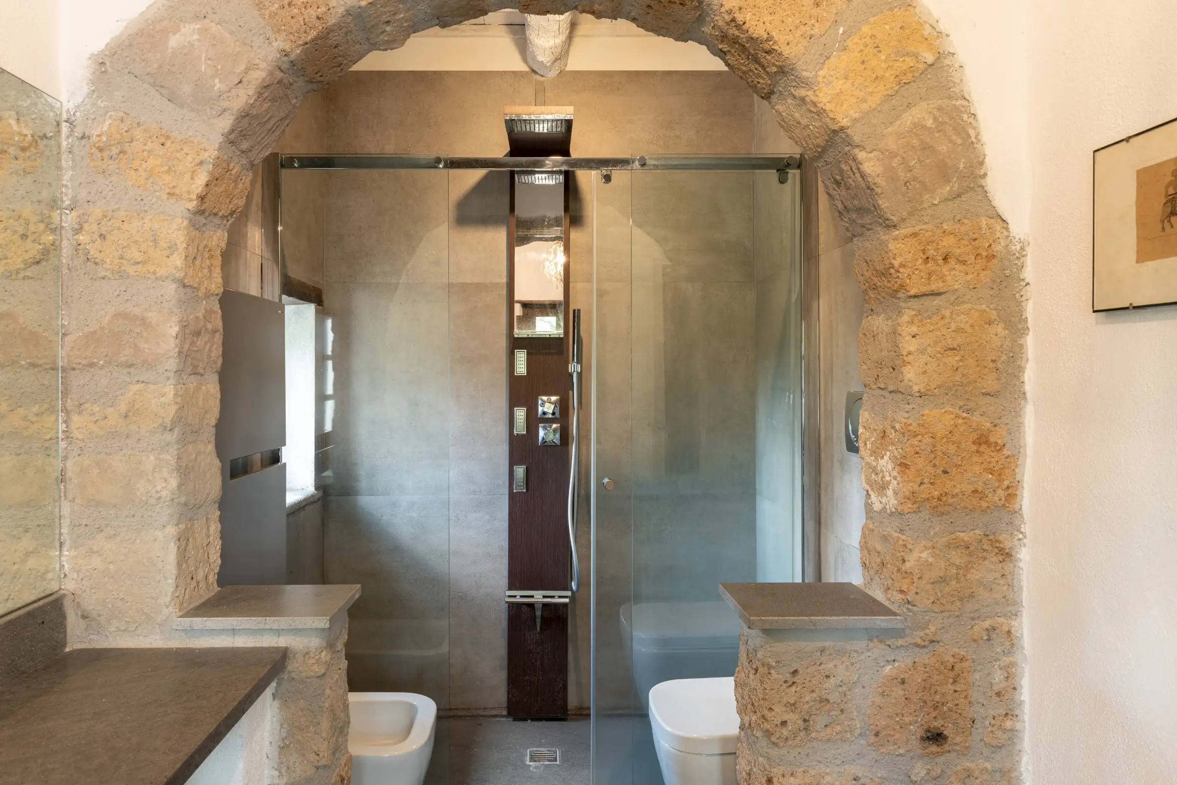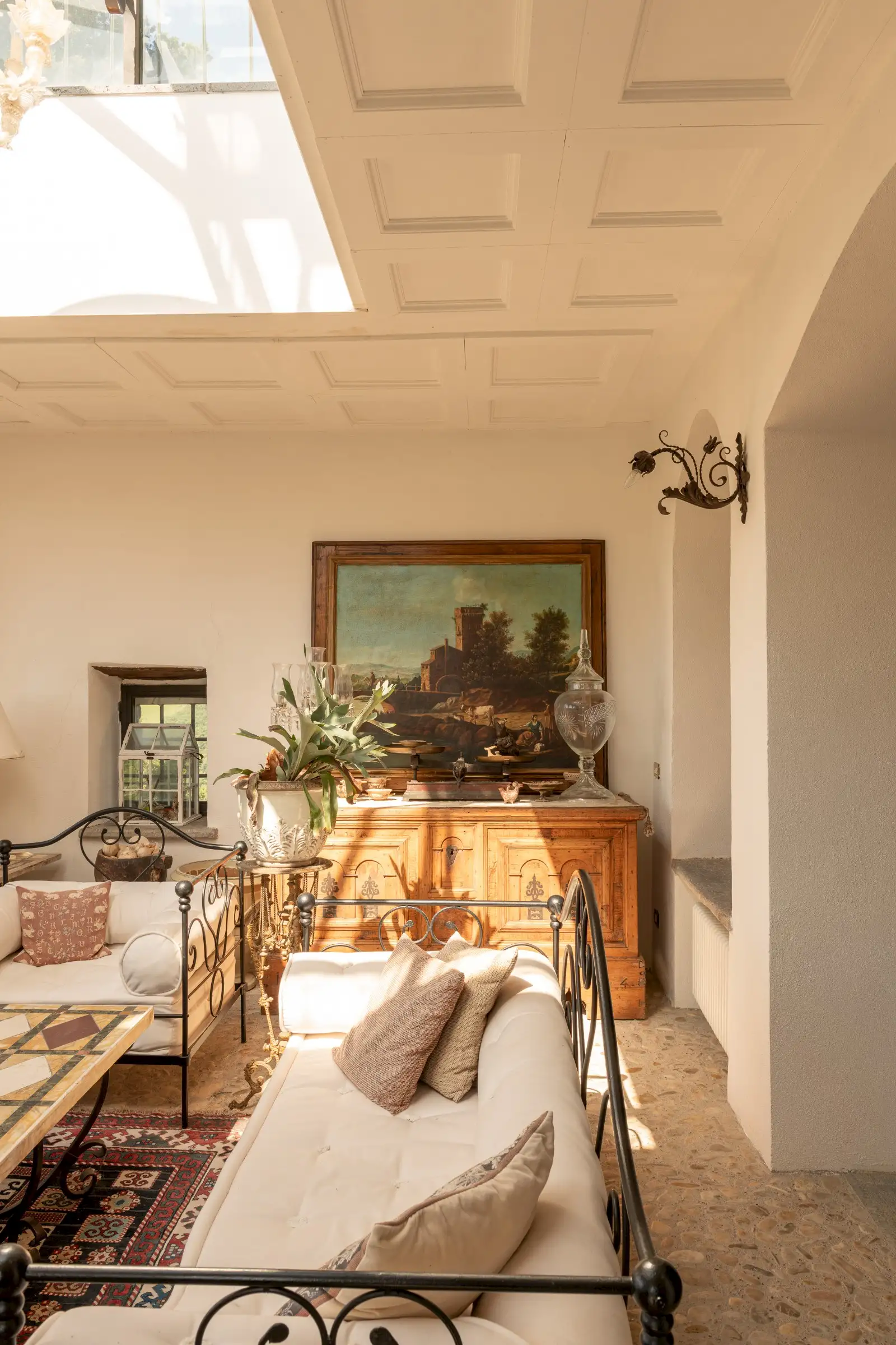 Inside, the main house has been meticulously restored using authentic materials and maintaining period details, including ancient wooden beams, basalt-stone floors, terracotta tiles and pebble mosaics in the winter garden salons, coffered wooden ceilings, antique doors, and built‐in wardrobes crafted from reclaimed 17th-century cabinetry. Six LPG boilers (two per floor), a wood-burning stove and six working fireplaces ensure warmth and comfort throughout.