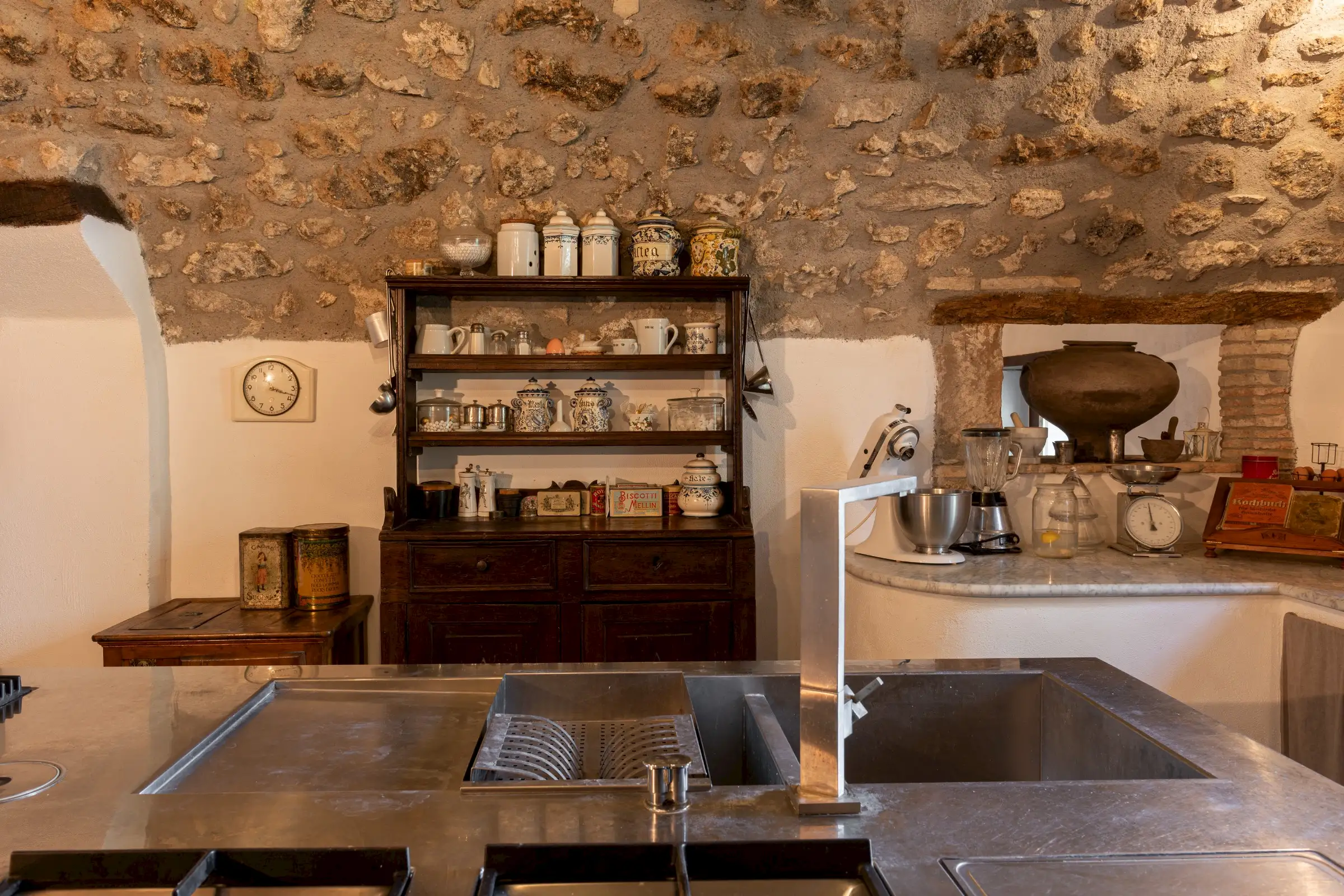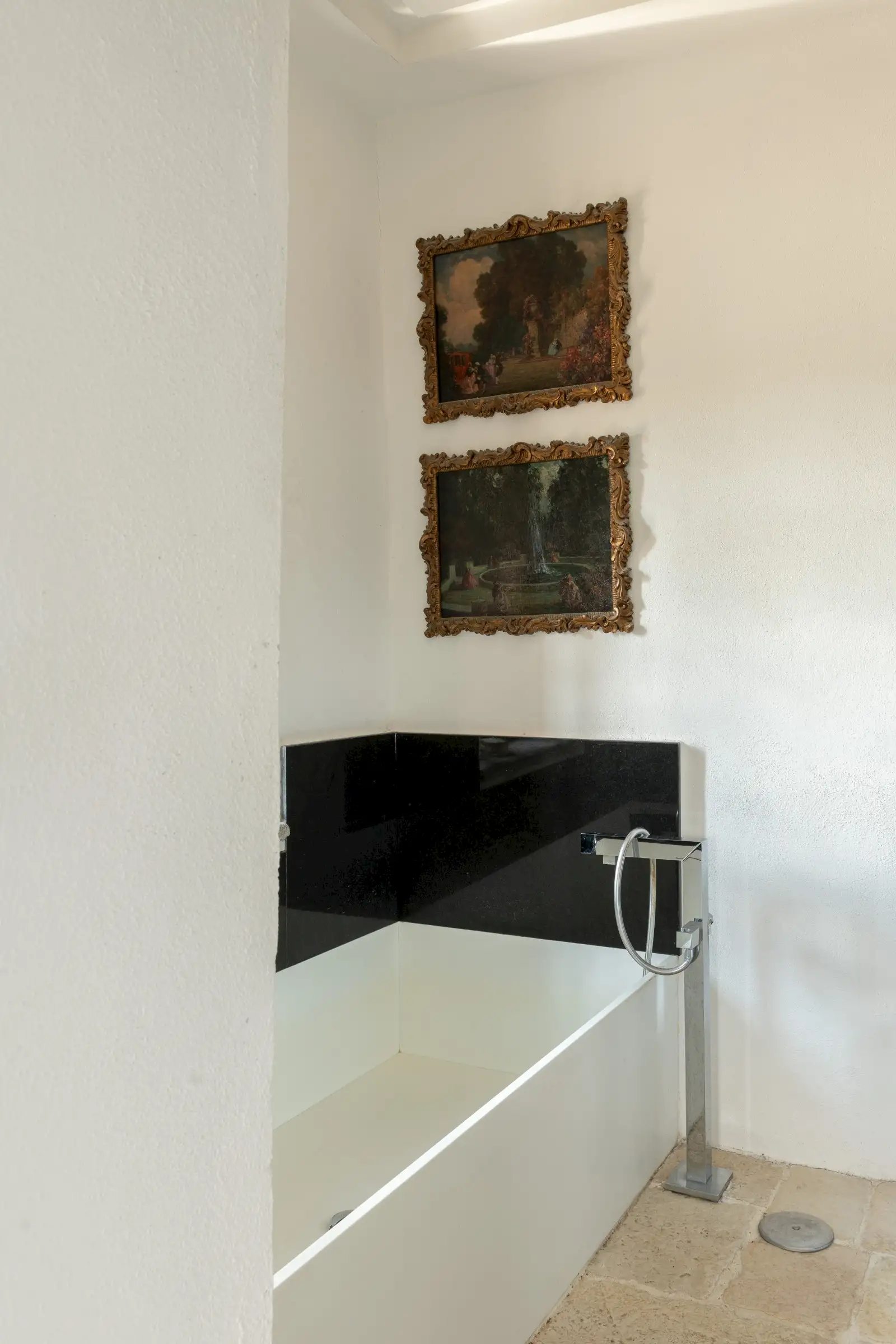 A magnificent entrance hall leads into two sun-lit winter garden salons and an impressive double reception room with original antique fireplaces. There’s a formal double dining room, a cosy TV room, an expertly equipped kitchen in stainless steel, a larder, a medieval wine cellar with the original earthenware wine vessels still in place, plus two storage rooms, and a downstairs loo. There is a lift shaft already in place, that could provide access up to the third floor, if required.