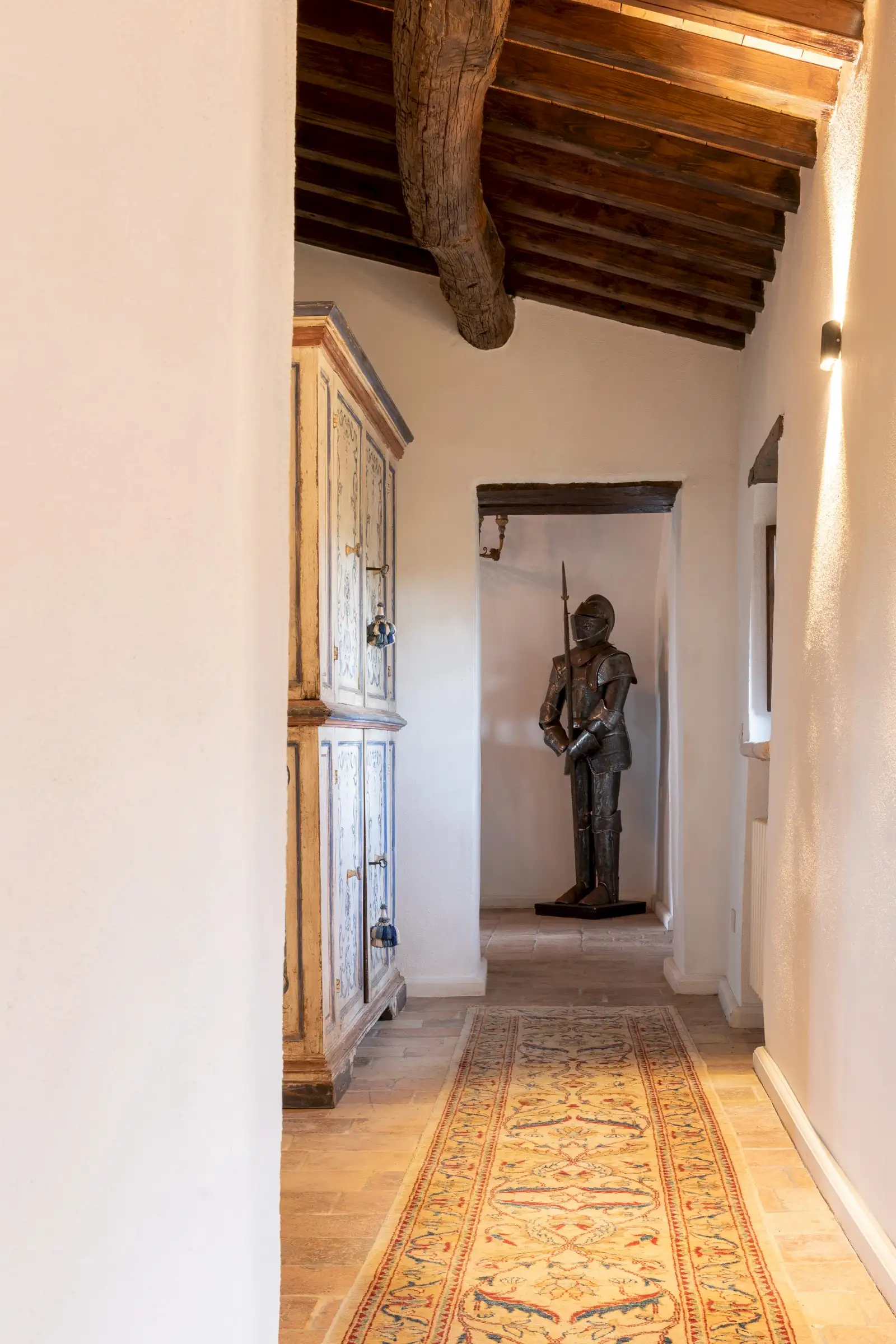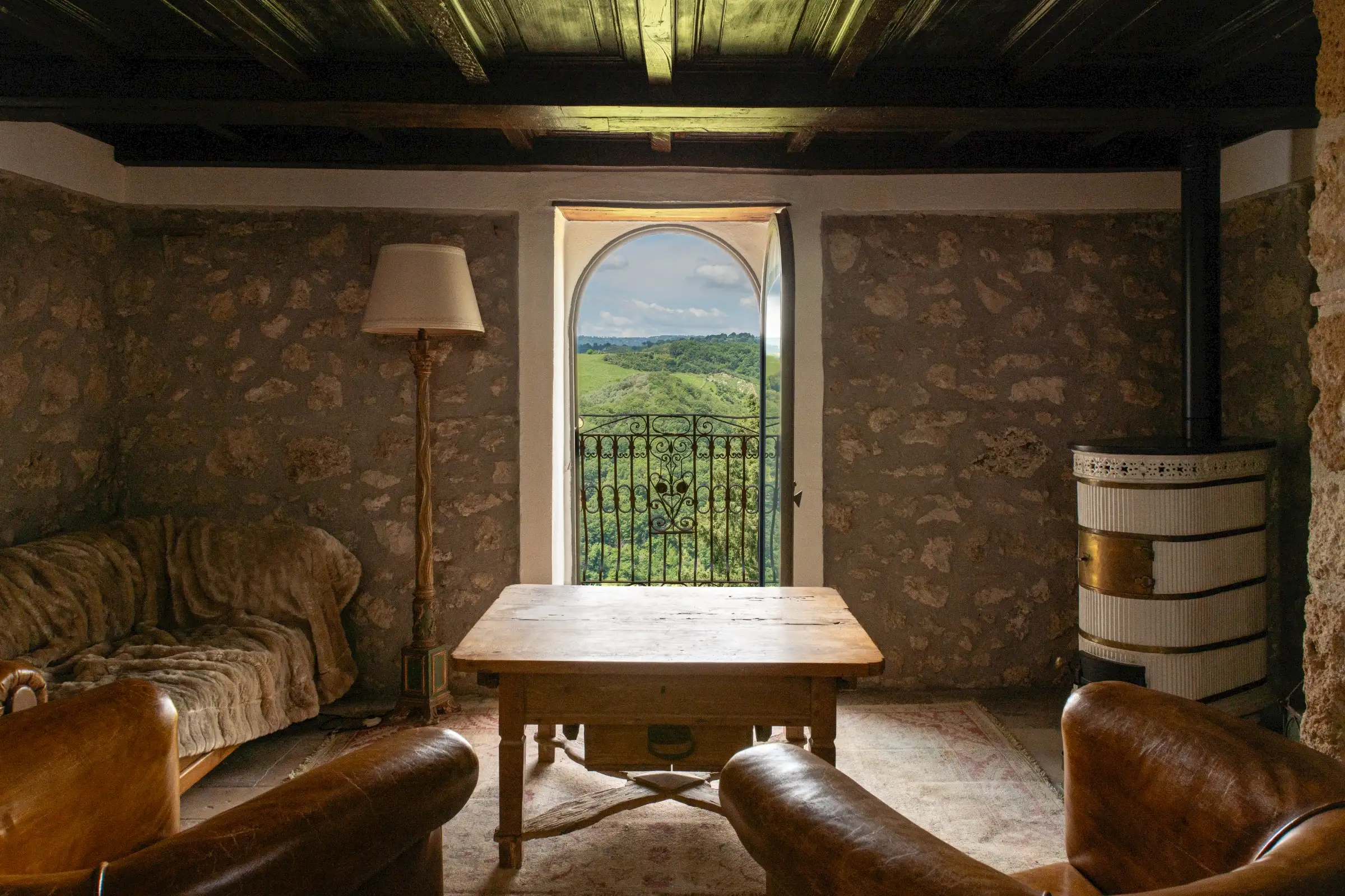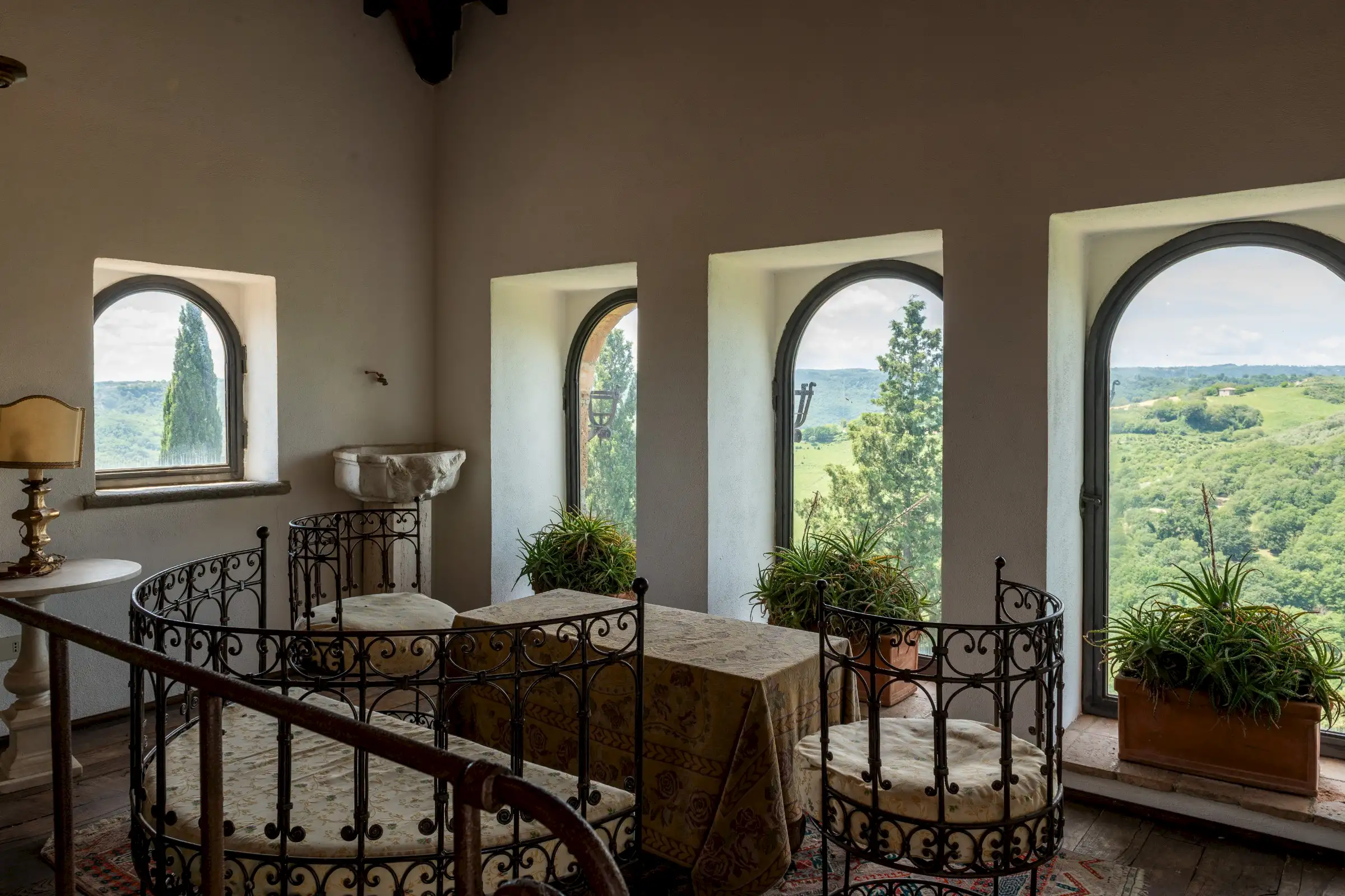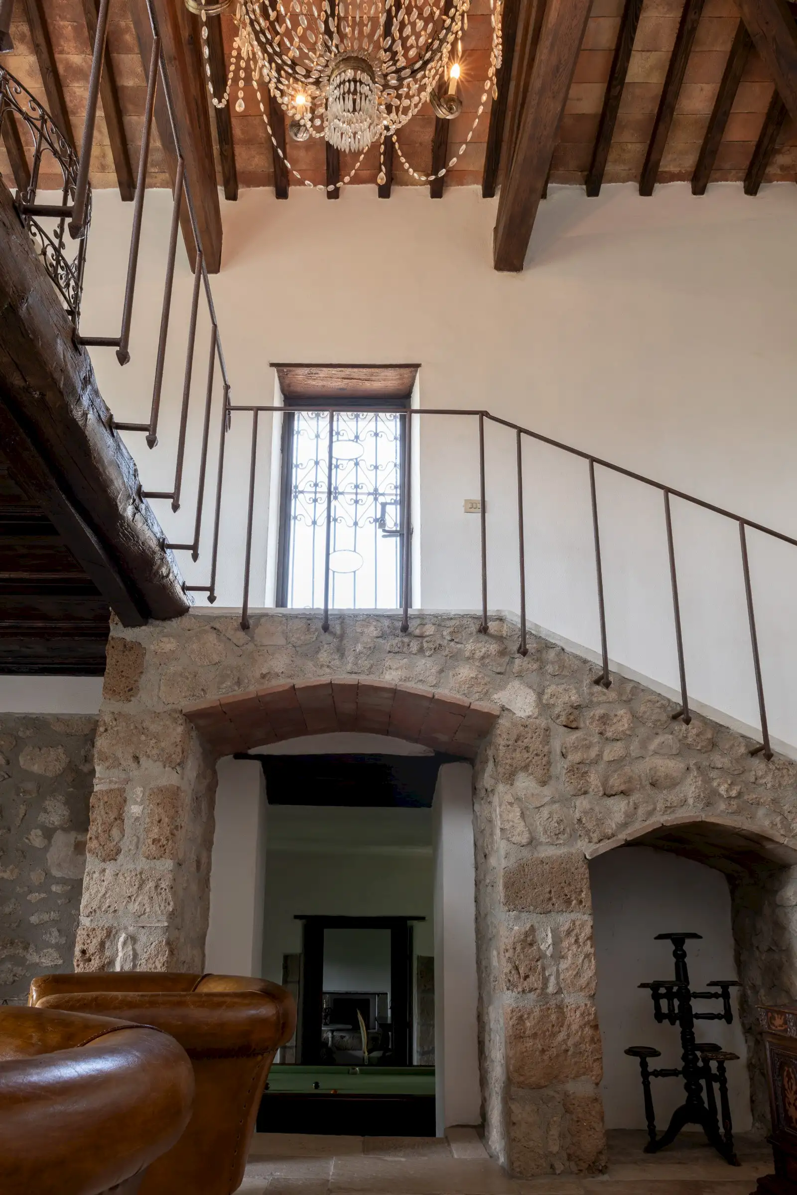 On the top floor there’s a large study that opens onto the tower’s reception room that has incredible panoramic views down the valley. There are three en-suite double bedrooms, a billiard room, a cosy sitting area, two storage cupboards, and an antique stone staircase leading to a mezzanine and a spectacular rooftop terrace.